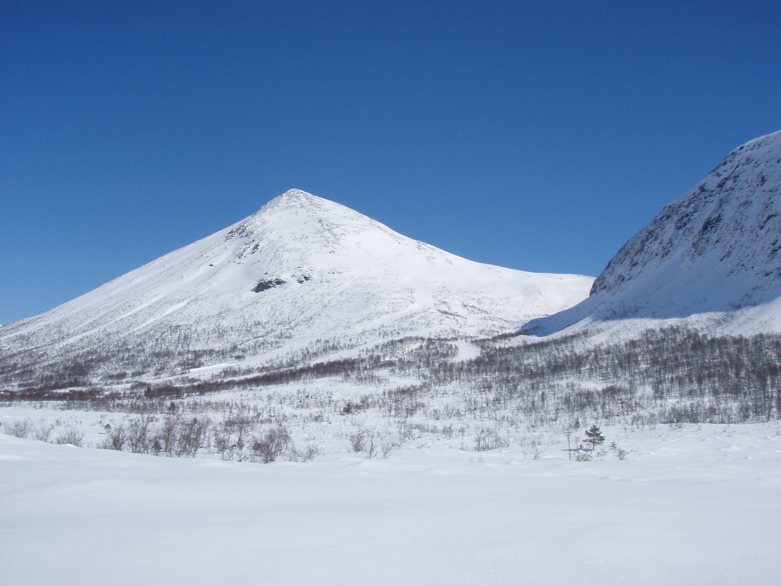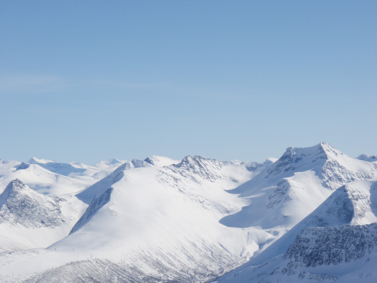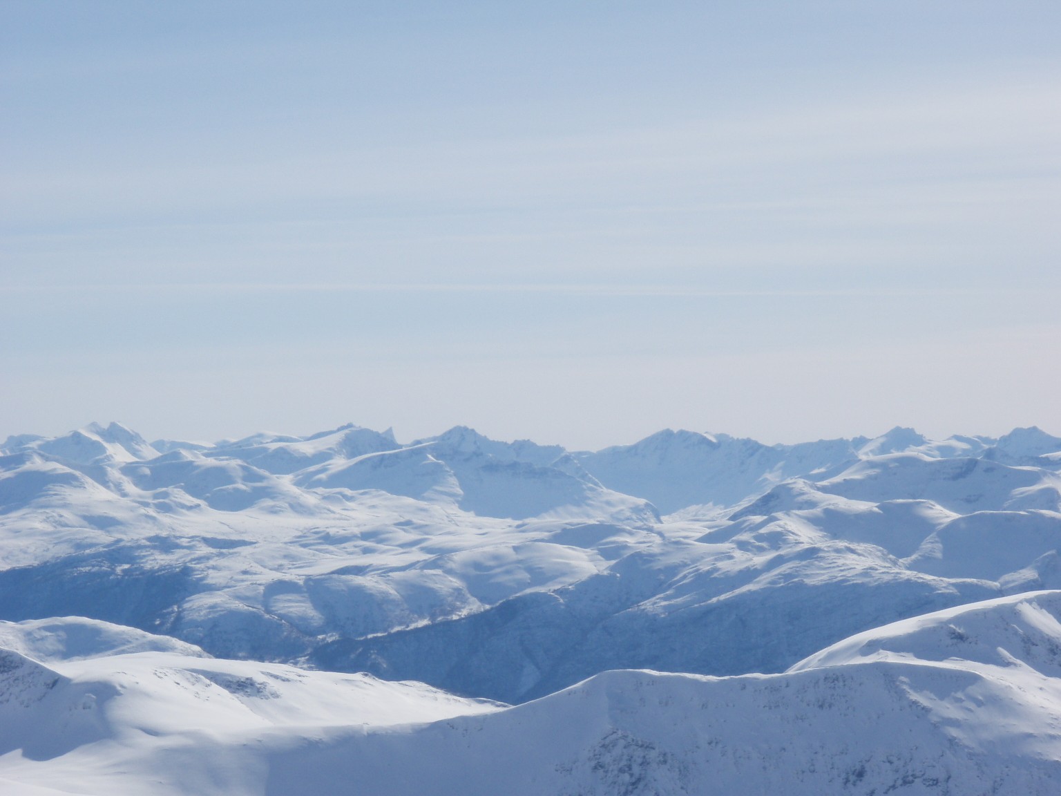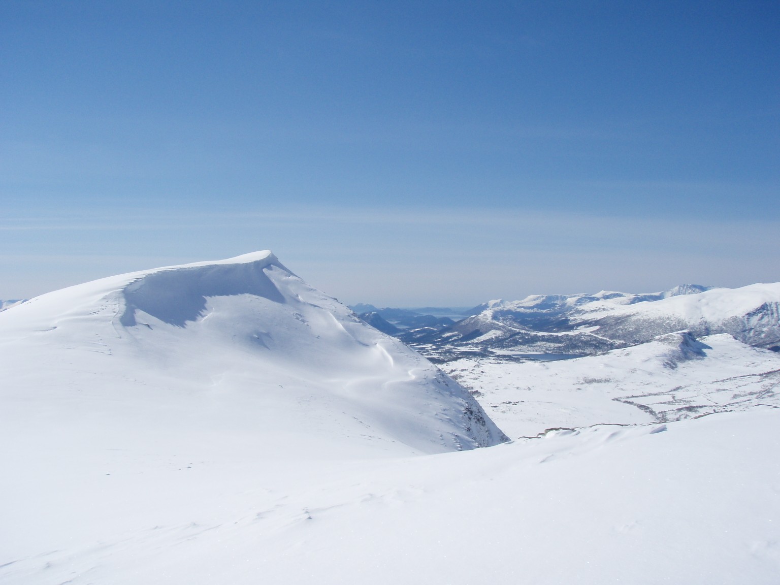 Etter først å køyrt til Ålesund, sjekka inn på hotell, og så køyrt til Ørskogfjellet, vart det ein sein start lørdag. Dagens mål var Sprovstinden, og planen var å gå opp langs alpinbakken mot skardet under Sandtinden. Men med all nysnøen som kom før helga vart det tungt å trakke spor, så eg bestemte meg fort for å ta ein anna retning. Så eg la i veg innover dalen mot Måslia, der det var godt opptrakka spor frå før. Langt inne i dalen var det ein som hadde teke opp lia, så då var det berre å følge sporet. Oppe i skardet vart føret fastare, men det vart å krysse opp mellom steinane mot den avblåste Sandtinden. Runda denne i sørkanten, før det bar litt nedigjenn før siste stigninga mot Sprovstinden. Oppe på toppen var det hardt og glatt, og svære skavlar mot stupa i nord. I det flotte været var det eit fantastisk panorama frå toppen. Frå Ålesund i sørvest, og heile synsranda i sør og aust låg ei utruleg tinderekke, med alle Sunnmørsalpane og Romsdalsfjella. Alle krittkvite etter siste snøfallet, og bada i sol frå blå himmel. Ein sur austatrekk på toppen, gjorde opphaldet kortare enn ønskelig, men klokka sa òg at det var nødvending med ein rask retur til bilen. Søndag var det grått igjenn, men det vart ein liten tur til Storhornet på Godøya.
