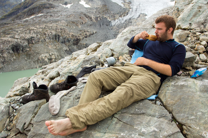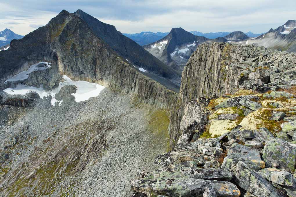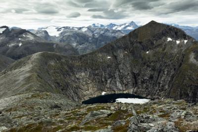 Sebastian forteller meg at han skimter en lysning mot sør. Jeg snur meg, og tåka letter slik at Vengetinden, Trolltindane, og resten av perleraden i Romsdal får vist seg frem. Åndalsnes ligger under regndyna enda. Vi har hatt den mest fantastiske sommeren i manns minne, med sol omtrent hver dag og bøndene som opplever et uår av de sjeldne på grunn av tørke. Men regnet plasker ned rundt oss nå som vi endelig har tatt ferie for å gå Romsdalstien. Livet er det som skjer mens du er opptatt med å legge andre planer, sa en smart mann. Etter at vi har tatt noen bilder så putter jeg ørepluggen tilbake igjen. Tåka kommer flyvende mot oss med vindene over skaret. Fantasiverdenen med romvesener er faktisk mer spennende enn en våt og kald DNT sti. Jeg farer inn og ut av lydboka mi mens vi labber mot Måsvassbu. I pent vær er det få norske DNT stier som er vakrere enn vår helt egen Romsdalsti via Åfarnes – Skorgedalsbu – Måsvassbu – Vasstindbu – Svartvassbu - Rabben. Som jærbu opplevde jeg det bratte friluftslivet i Romsdal som et stengsel mot den labbetilværelsen jeg var vant til da jeg flyttet hit i 2010. Men gjennom en hytte til hytte tur på nettopp Romsdalstien i 2011 så forelsket jeg meg i de bratte og spisse tindene, med krystallblått vann mellom seg, og isbreer som glitrer. Jeg skrev en artikkel om turen i Fjellsmella 2011, og meldte meg inn til dugnad for MRT nærmest i samme åndedrag. Derfor er det ikke rart at jeg har ventet utålmodig i flere år på en passende anledning til å ta med stesønn Sebastian på den samme turen. Dagen etterpå er været det samme. Vi får ikke sett det flotte fjellandskapet rundt Måsvassbu, og isbreen over Mørkvatnet får Sebastian heller ikke sett. Når vi runder fjellet og kommer frem til Kjøvdalsvatnet ligger tåka så tykk at vi bare ser et viddelandskap rundt oss. Tåka skjuler alle fjellene. Jaja, så får ikke Sebastian se den voldsomme bratta vi må karre oss opp før vi får spist middag. Aldri så vondt at det ikke er godt for noe! Romvesenene har tatt første kontakt med datanerden og PR-agenten hans er i ferd med å legge en fiffig strategi for at nerden skal bli hørt av mediene når vi bikker toppen av bakken mot Vasstindbu. Vi stuper overlykkelig inn i en ferdig oppvarmet Vasstindbu. Her treffer vi en mamma fra Østlandet med to jenter på 7 og 10 år på ferie, og de går også Romsdalstien. Vasstindbu er en sagnomsust hytte lokalt hos oss i MRT. Solnedgangene her oppe blir alltid omtalt som et høydepunkt i MRT. Heldigvis er det nettopp her vi får et værskifte. De siste tåkedottene flyr over fjellryggen og solnedgangen eksploderer foran oss. 18 åringen løper ut døra og fotograferer ivrig med mobilen. Et dansk ektepar blir modeller foran kameraet mitt mens de drikker medbrakt vin og nyter hver en krone flybillettene kostet. Jeg tror opplevelsen vil være med dem resten av livet. På vei ned fra Vasstindbu får vi strålende sol, og ullskjortene blir slengt opp i sekkene. Steinura gjøres unna på et byks og vi lander på torva idet romvesenene bestemmer seg for at menneskene fortjener å overleve, takket være PR-agenten og datanerden. Lydboka er i stor grad over når vi kommer til tjernet hvor jeg fikk fisk sist gang jeg gikk Romsdalstien, og den trofaste leser vil kanskje huske at jeg glemte fisken på en stein før jeg nådde frem til Svartvassbu. Klok av skade har vi mer enn nok frysetørket mat i sekken denne gangen. Oppover mot Styggeværshaugen steker sola, og jeg skifter lydbok. Denne gangen er det «D-day through German eyes» som skal underholde meg skritt for skritt. Intervjuer gjort av tyske soldater på 50 tallet levendegjør de alliertes offensiv mot Normandie fra en side av krigen som ikke har blitt hørt før. Og før jeg vet ordet av det står jeg på toppen av Styggeværshaugen og hører Sebastian klage over at vi mangler vann. For det glemte vi å fylle nede i tjernet på bunnen av stien. Men heldigvis er det en stor snøfonn på sørsiden av fjelltoppen, så der benker vi oss til med gassapparat, kaffe, og sjokolade. Sist jeg gikk denne stien, var det på toppen av Styggeværshaugen at jeg erkjente hvor utrolig vakkert det er her oppe i Romsdal. Sebastian sitter med kaffekoppen og skuer utover det samme landskapet jeg skuet over den gang. Dette er fint, sier han, før han spør om jeg kan fortelle om tegnene etter isbreene. Vi har en prat om morener og botnbreer før vi finner veien ned til Svartvassbu. I døråpningen står det en familie fra Skottland og tar oss vel imot. Og jaggu har ikke småjentene fra Vasstindbu kommet trygt frem de også. Duften av kokte hurtignudler henger tungt, og vi gjør klar våre frysetørkede poser fra Summit to Eat. Mens vi spiser får vi høre om skotske fjell og østlandske åser, og mens vi tygger går det opp for meg at hytta er full. Jeg må sove på en madrass på gulvet den natta… Om morgenen våkner jeg av at skottene står opp umenneskelig tidlig. De skal ned fra fjellet og videre til neste fjellområde. Men jeg har heldigvis sovet godt på madrassen min og våkner uthvilt. Det passer for så vidt bra, for vi har tenkt å gå lenger enn Romsdalstien. Den slutter nemlig nede på Rabben og Svartvassbu er således endestasjon for hytte til hytte turen. Men tar du til venstre nede på stien så kommer du til Hoemsbu, over Hoemskaret, og dit har vi tenkt oss! Der er det nemlig noen flotte isbreer og i enden av stien ligger smellvakre Eikesdalen som lokkemiddel. Sola steker mens vi jobber oss opp mot Hoemskaret. Jeg gikk samme stien i 2011, og da fikk jeg også tatt en rekke bilder av isbreene som ligger her oppe. For en Jærbu er det eksotisk å få trampe oppå en isbre langs merka sti. Så dette er en opplevelse jeg har gledet meg til å gi til Sebastian! Men når vi kommer dit så er det jo ingen isbre der. Det er ingenting som helst. Vi går på stein. Jeg kikker meg rundt. Hvor er breen da? Jeg flyr litt drone og tar noen bilder, men isen