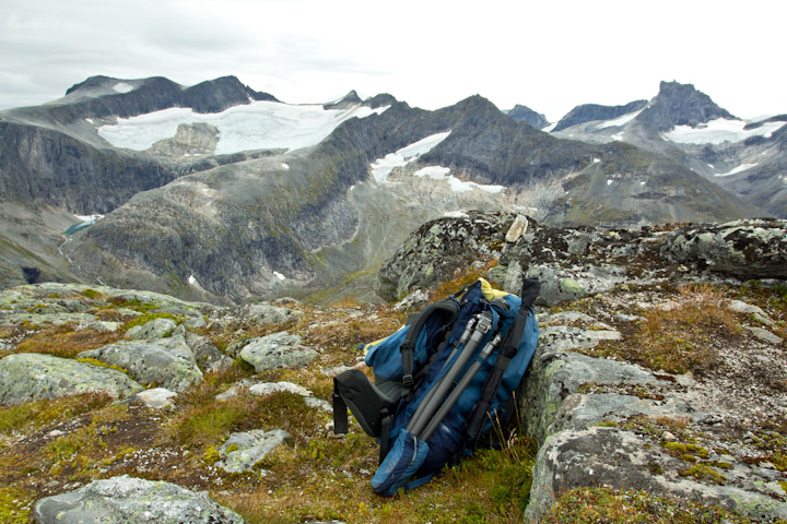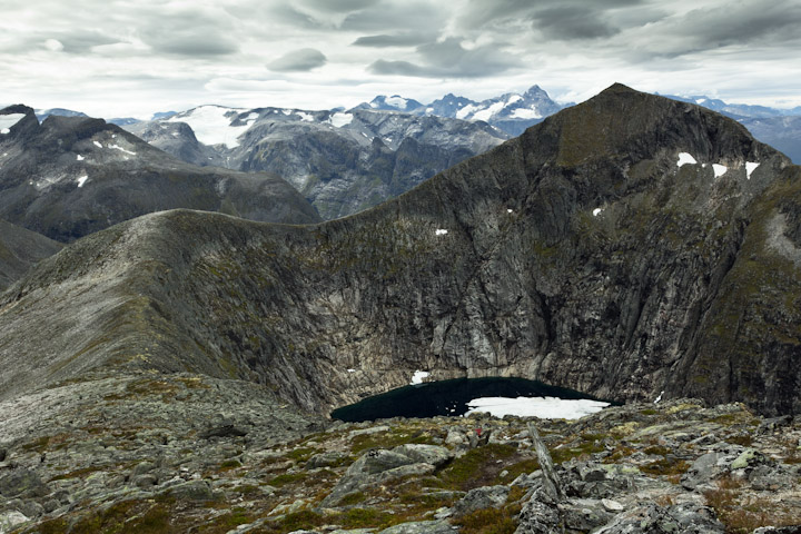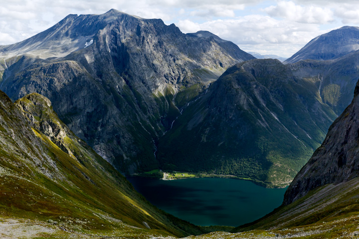 Dette er en artikkel som opprinnelig ble trykket i Fjellsmella, Molde og Romsdals turistforenings medlemsblad i 2011. Det er en turrapport som beskriver deler av en fototur jeg hadde mellom Måsvassbu og Hoemsbu. Da jeg ikke finner så mange turrapporter fra dette området som man finner i Jotunheimen, så tenkte jeg at jeg i det minste får gjøre min del av jobben. Det blir nok flere turrapporter fremover. Fengslende landskap Da jeg for første gang satte meg i sofaen i vår nye leilighet i Molde og tok utsikten til de 222 tindene i betraktning, følte jeg meg som en innsatt på ILA kretsfengsel. I mitt tidligere jeger og fiskerliv hadde jeg vandret ubekymret over de mange små knoller og hauger som vi kaller fjell på jæren. Klatring, snøskred og lange avstander mellom fiskevannene er helt uvant for meg. Tindene rundt Molde ble som en vegg som hindret meg i å nyte det tradisjonelle friluftslivet, men det skulle ikke ta så lang tid før jeg fant mine nye omgivelser fengslende på andre måter enn som stengsler. Det var på oppdrag for MRT at jeg fikk unnskyldningen jeg trengte for å vandre hyttetraversen til Molde og Romsdal Turistforening. Hyttestien går fra Måsvassbu til Brandstadbu og inkluderer seks andre hytter, en båtoverfart og adskillige tusen høydemetrer der stien sniker seg mellom mektige tinder. Rundt Måsvassbu er terrenget mildt og begrodd slik jeg kjenner det fra hjemlige trakter. Derfor er det ingen overraskelse at det er i dette området jeg har vært aller mest det siste året jeg har bodd i Molde. Denne gang skulle jeg derimot gå videre til neste hytte, Vasstindbu, og med meg i sekken hadde jeg 10kg fotoutstyr og en velskrevet bok ført i pennen av en viss engelskmann med navnet Slingsby. Og i denne boken leste jeg ett avsnitt som skulle vise seg å bære en stor grad av sannhet allerede neste dag. Slingsby bemerket i forbifarten at fjell ofte ser ubestigelige ut når du studerer de rett forfra. Det er først når man kommer nærmere og tar fjellet i betraktning fra ulike vinkler at man får en anelse av bestigeligheten. Når jeg da rundet en liten knaus på min vei til Vasstindbu 1100 moh, ble jeg forferdet av den vegg av stein som DNT stien ifølge kartet skulle forsere. Foran meg stod det en nærmest loddrett vegg av steinur på over 200 meter fra dal til topp og jeg så ikke en god rute fra bunn til topp umiddelbart. Men med sitatet i bakhodet forserte jeg dalen raskt og gikk igang med bestigningen av denne loddrette steinur, som etterhvert slett ikke var fullt så bratt som fryktet og antatt. Jeg hopper over fortellingen om den halvslappe kondisen min og spoler frem til min ankomst på Vasstindbu. I slutten av stigningen hadde jeg merket meg noe smerter i ankelen og undret over hva det kunne være. Svaret fikk jeg da jeg tok av meg lærstøvelen min, for smerten jog i hele benet når jeg dro foten fremover for å lirke den ut av støvelen. Hva i alle dager har skjedd her? Forferdet la jeg den over en stol og tenkte meg litt godt om, og litt nykokt kaffe gjorde susen som motargument mot å ta forhastede avgjørelser. Jeg sendte melding til min frue og mine venner, og bestemte meg for å sove på saken og se hvordan det utviklet seg neste dag. Å beordre en fjellmann med lopper i blodet til å sitte på en stol inne på en turisthytte en hel dag mens solen skinner og toppene rundt kneiser seg til værs er som å si til en ulv at den ikke får spise sau. Derfor ble det da litt prøving og testing med foten min, og da det nesten ikke gjorde vondt å ta på seg lærstøvelen igjen tok jeg meg noen forsiktige toppturer for å sondere terrenget. Jeg gikk sakte og overveide hvert steg nøye, og jeg merket heldigvis lite til flere smerter. Utsikten fra 1250 moh var direkte nydelig og terrenget gjorde dype inntrykk. Jeg fikk en herlig følelse av å være på en alpin ekspedisjon, selv om jeg bare var en kilometer fra turisthytta. Dette var ulikt alt annet jeg hadde sett før, og det var herlig å klyve litt opp mot toppen. Tilbake på hytta satt jeg sulten resten av kvelden og irriterte meg over at jeg måtte ta ventedøgnet mitt ved nettopp denne hytta. Ett flott bilde sikret jeg meg allerede kvelden før, og det fantes ikke fiskevann her så den fisken som jeg hadde kalkulert inn til middag idag uteble og magen protesterte høylytt. Løsningen ble masse vann og flere kopper nypete mens jeg fordøyde litteratur. Etter en kjedelig og strevsom nedstigning i glatt steinur hadde jeg karret meg ned fra platået hvor Vasstindbu ligger. Vel var det vakkert der, men mangelen på fisk gjorde at jeg med glede forlot hytta til fordel for de lokkende vannene 300 meter under, på stien mot Svartvassbu. Jeg lusket meg frem til vannet med ferdigladet slukstang og lot sluken fly ut til midten av vannet, der jeg lot den synke til bunns og startet rykkvis innsveiving. Jeg gjentok prosessen i en time uten resultat. Slukøret gikk jeg videre. Da jeg rundet foten på Melkallen som deler dalen i to, traff jeg på en liten høl i elven som går igjennom dalen. Selv om denne hølen lå lavt i terrenget, bare 750 moh, hadde jeg en stygg følelse av at den var tom for fisk og så grunn at den er bunnfryst hver vinter. Men naiv optimist som jeg er lot jeg sluken atter en gang få luft under vingene og allerede på det første kastet dro jeg i land en deilig, rød ørret på ca. 500 gram. Herlig! Ikveld blir det en saftig middag. Jeg var blid som en lerke i vårsola, selv om det var overskyet. Ett par kast til på vei til innoset for å finne en kvist jeg kunne spikke til bærepinne, bet det på en fin 350 grammer. Jeg lot den ligge i lyngen og hentet den på tilbaketuren etter å ha funnet en passende kvist. Da jeg snudde meg for å gå videre lå vannet blikkstille og i vannspeilet så jeg de omkringliggende tindene lokke på meg. Lykkelig og atter motivert for å komme frem til neste hytte og sette igang med Brímikunstene mine tok jeg fatt på bestigningen opp til Styggeværshaugen p