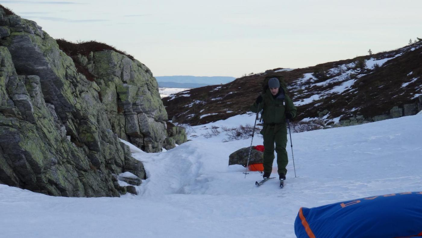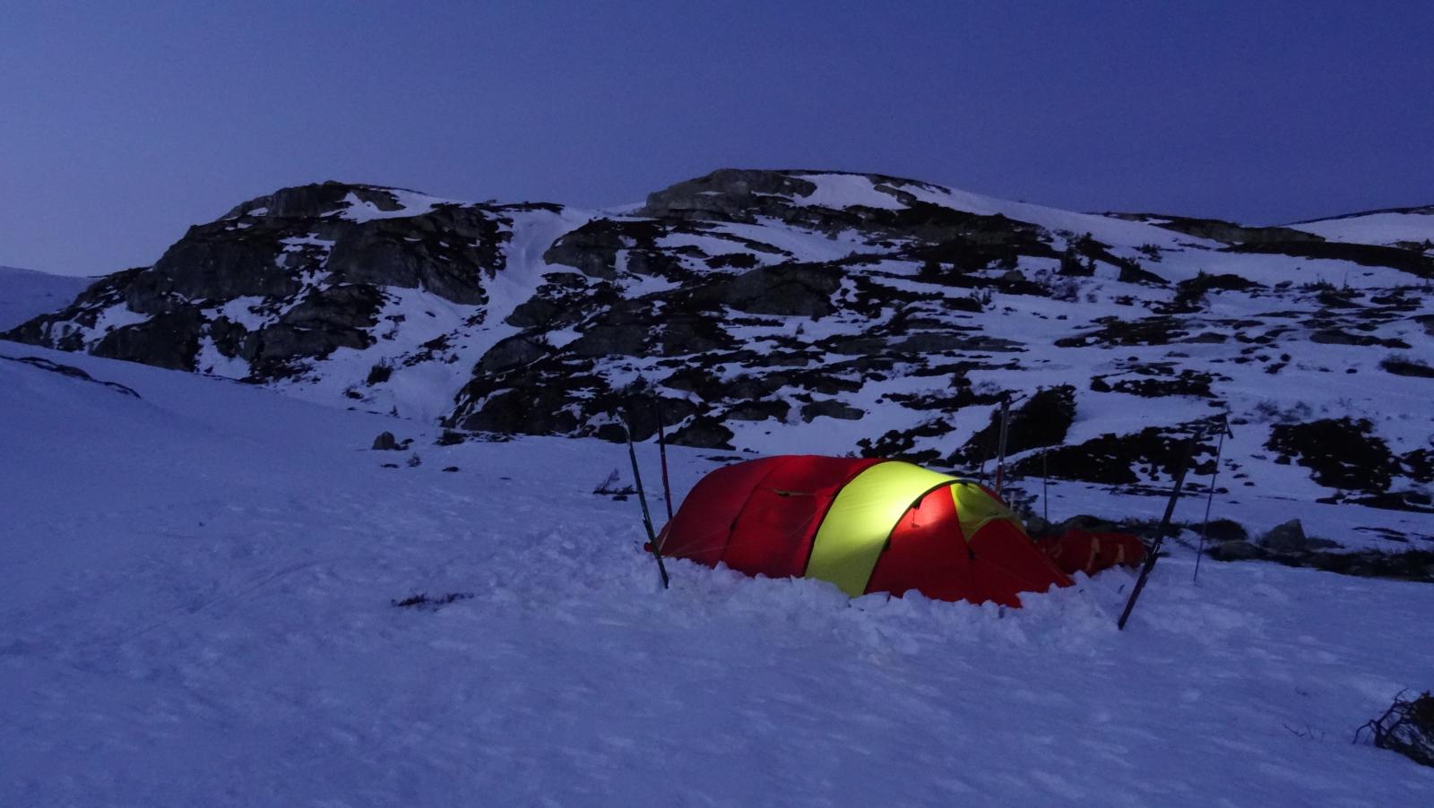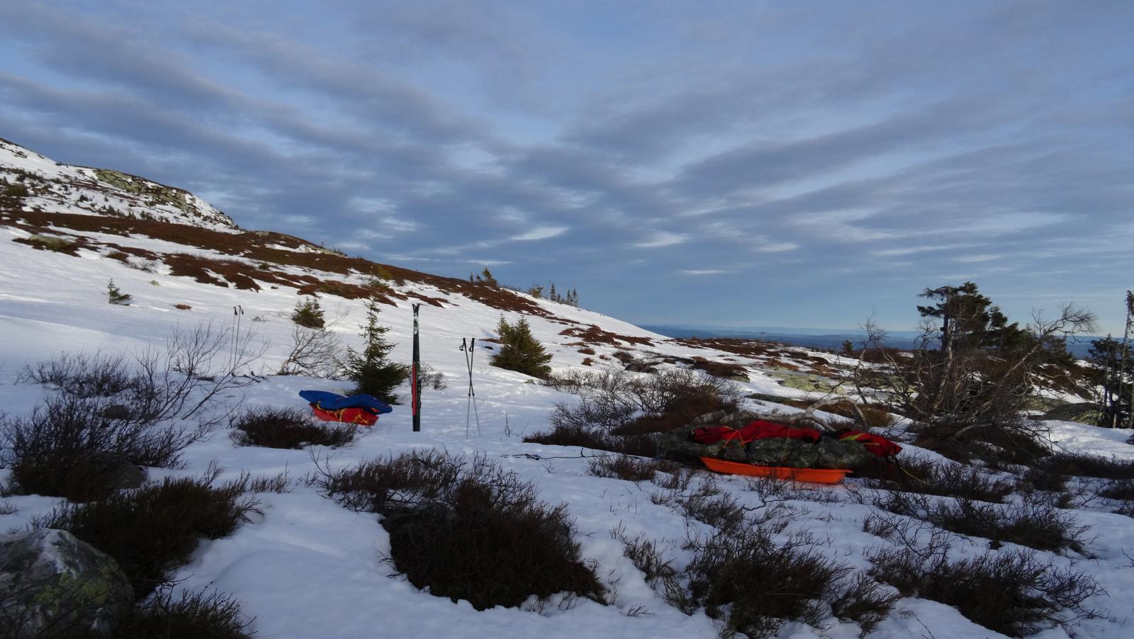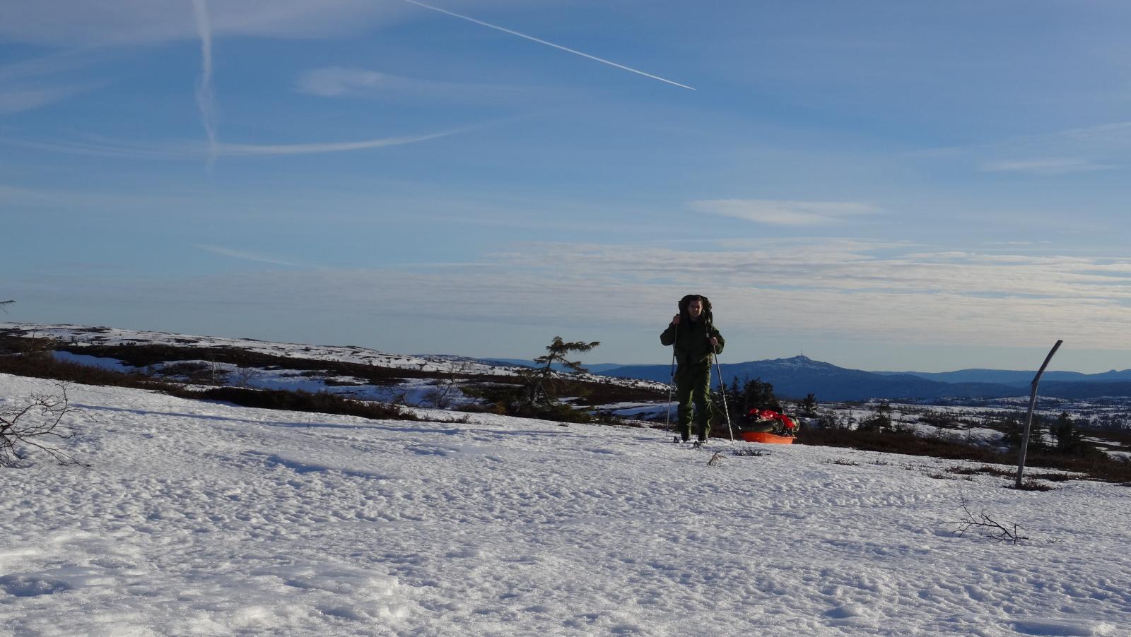 Helgetur til Blefjell. Fredag 20.01.17 - Ankom Nordstul parkering ca 1500, spente på oss fjellskia og hektet pulken til selen. Med kort tid til solnedgang og mørke ble det fort klart at vi ikke gadd gå veldig lang. Ca 1,5km fra parkeringen langs skiløypa til Sigridsbu satt vi opp telt idet mørket senket seg. Vi viste det var meldt vind opp mot 14m/s så prøvde sette opp teltet bak en klynge mindre trær, men blafret godt i teltduken gjennom hele natten. Lørdag 21.01.17 - Sov lenge, spiste godt med frokost og pakket sakene. Fortsatte langs løypa med sikte for +1000moh. Ble fort klart at varmen og mangel på snø gjorde fremdriften sen, men god glid der det lå snø. Været, snøen og temperaturen minner mer om påsketider. Så hardt og glasert. Og tydelig lenge siden siste snøfall. Fant oss til slutt en fin plass 1050moh med flott utsikt. Temperaturen sank fra +6 på dagen til rundt -1 utover kvelden og det ble en flott stjerneklar kveld. Søndag 22.02.17 Vi konkluderer med at vi har tatt med oss nok mat og vel så det, men at utstyret vi har tatt med fungerte utmerket. Ble ikke så utfordrende som vi kanskje hadde håpet på siden det var så varmt, men alltid gøy med tur uansett. -