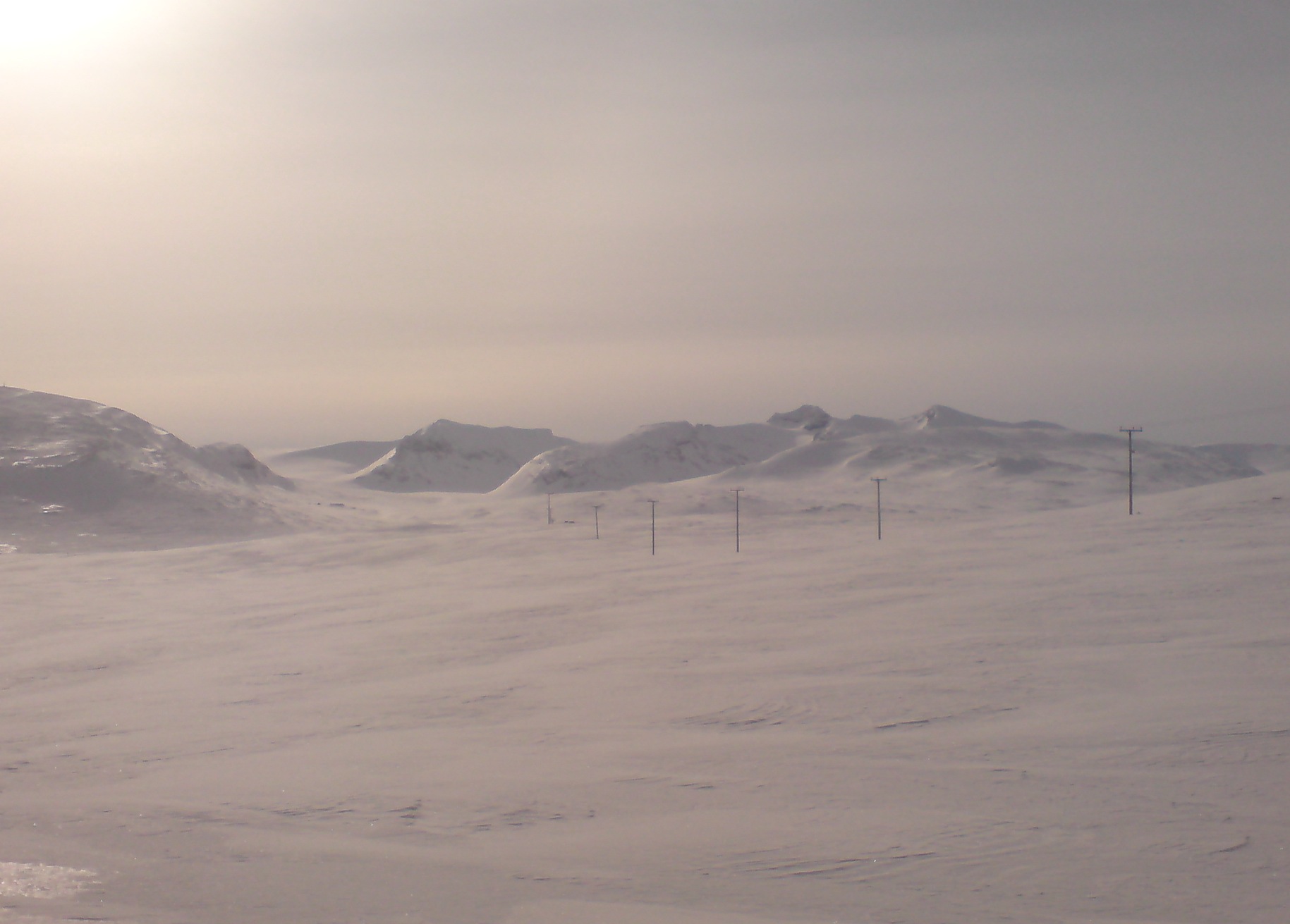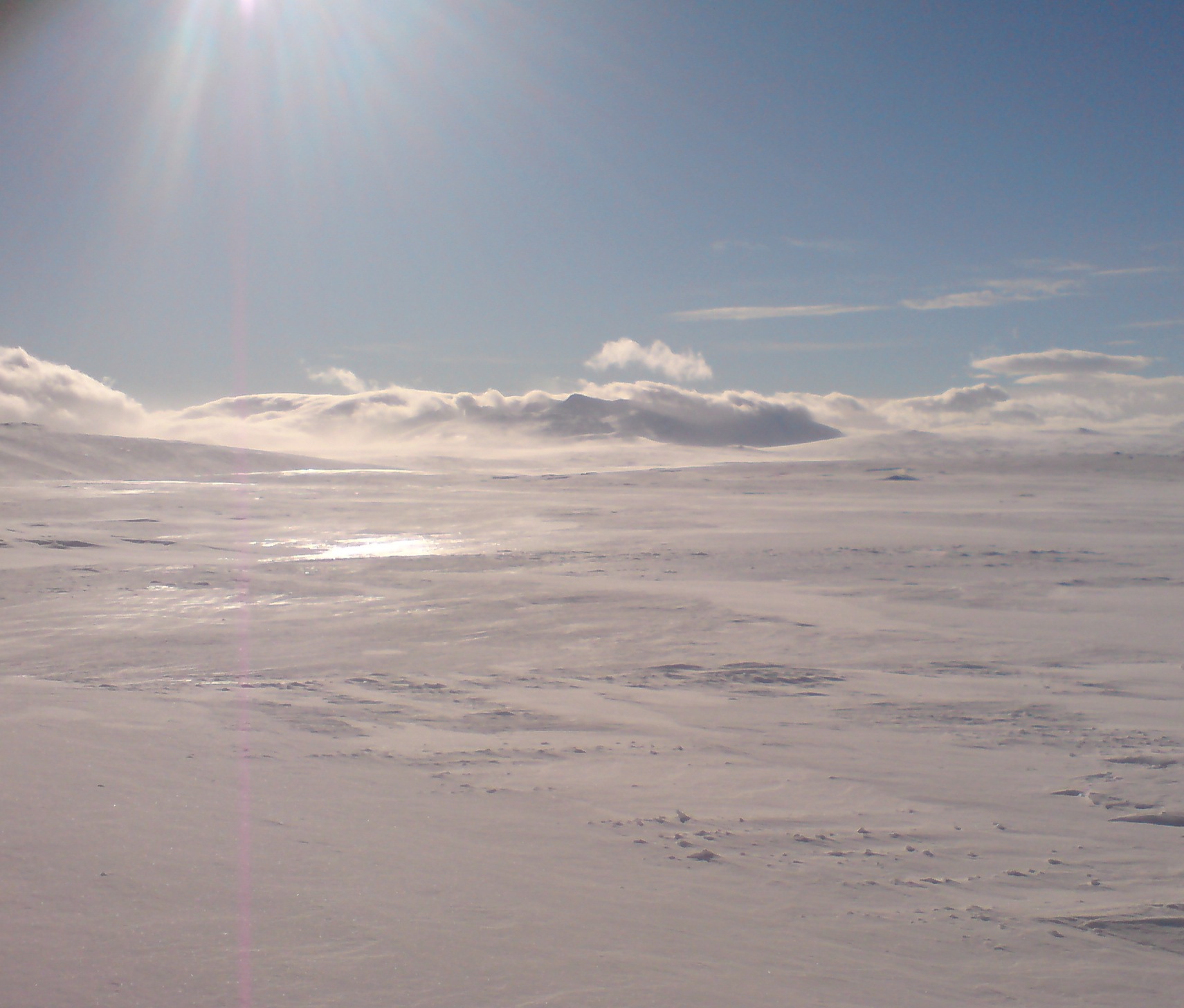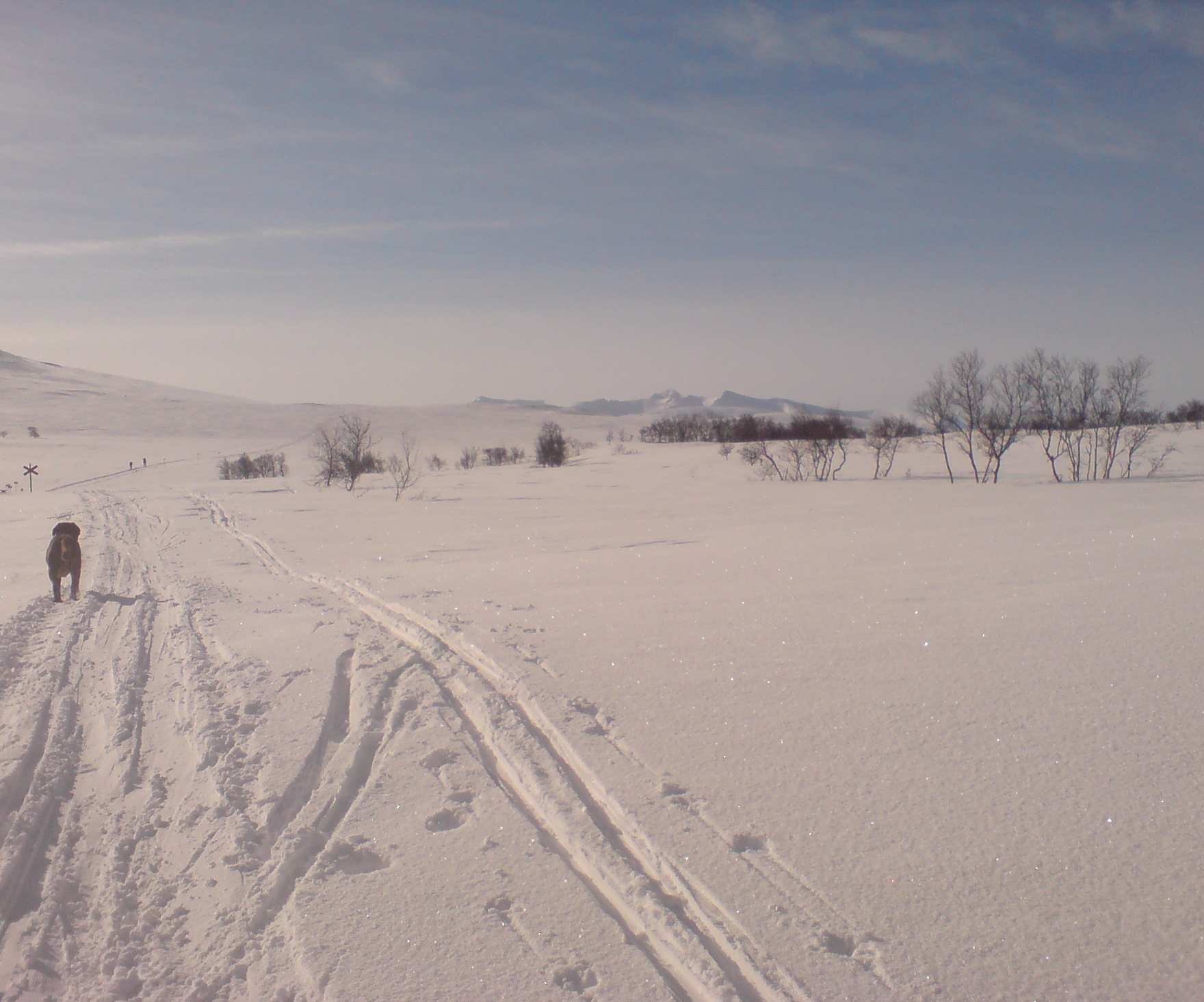 Har lenge gledd meg til å få en vintertur i Sylan. Gikk der en del ganger i sommer/høst, og har blitt skikkelig glad i området. Jamtlandsfjellen, som svenskene kaller området, har mye å by på, hele året. Har gått både fra Nedlashytta, og fra svensk side, med henholdsvis Rundhøgen og Storulvån som utgangspunkt. Sistnevnte ligger ca 17km fra Storlien, og midt inne på fjellet, ca 700moh. Rett utenfor døra stiger flotte fjell som Getryggen, Snasahøgerna & Tverråklumpen seg opp mot 1463moh. Et mekka for toppturer og offpistekjøring. Fra frokostbordet, kan man se Storsylen i det fjerne, og en hel del andre flotte fjelltopper. Denne turrapporten er ment både som en ren beskrivelse av opplevelsen jeg hadde, samt en liten hjelpetråd til evt andre som tenker seg på tur i området. Når jeg i turen bruker "vi", så gjelder det meg selv, og hunden min Phil, som er en 2,5år gammel labrador hannhund. Vi hadde planlagt å gå Jamtlandstriangelen, med utgangspunkt fra Storulvån. Dvs Storulvån - Sylstationen(16km)- Sylstationen - Blåhammarstugan (18km), Blåhammarstugan - Storulvån(12km). Vi ankom Storulvån i 17 tida tirsdag 4 mars, og været var ok. Dvs litt vind, og overskyet og ca 1-2 minusgrader. Et godt utgangspunkt for turen. Onsdag morgen sjekket vi værmeldinga, og fikk bekreftet at det skulle bli ganske "luftig" utover ettermiddagen. I Sylan skulle det blåse frsik bris fra ca 13- 14tida, og litt snø. Før den tid, skulle vinden ligge på ca 5-6ms, og overskyet. Vi , les : jeg og hunden min Phil, spiste frokost, og begynte å klargjøre pulken for turen. Vi reduserte en del av innholdet, men var alikevel mer en nok utrustet for turen. Soveposen, dunjakka, reinsdyskinnet, spaden, vindduken, mat, skifte, og en hel del annet mer eller mindre nødvendig utstyr. Veide ikke pulken før avgang, men tipper den ikke veide mer en ca 20kg. Vi somla litt før vi kom oss av sted, og klokka var 10:30 da vi startet turen fra Storulvån. Turen, som er på 16km, skulle ta ca 6 timer i følge resepsjonen på Storulvån. Jeg viste at vi ikke kom til å bruke så lang tid, da vi av erfaring går mye raskere på ski, enn til fots. Uansett terreng, ligger vi i snitt på ca 5,5km/t, på turer over 12-20km. Vi startet med friske fraspark og merket raskt at dette gikk unna. De første 4km gikk unna på ca 45min, og føret var bra. I det fjerne så vi faktisk Sylmassivet kjempe litt med skyene, og det var et flott syn. Vårt førset mål var vindskyddet på Spåime. det ligger nøyaktiv halveis mellom Storlulvån & Sylstasjonen. dvs 8km fra hvert sted. Vi ankom Spåime ganske nøyaktig 12:15, og hadde da brukt 1time og 45min, inkl litt filmpauser, og fotografering. Vi traff også 3 store hundespann på veien, og gikk et stykke ut av "løypa" for ikke å forstyrre dem. Inne i vindskyddet, som er ei hytte på ca 15-20m2, med nødtelefon og vedoven, traff vi et par som også var på vei til Sylan. De hadde startet turen 9:15, og gikk tydeligvis mye saktere enn oss. Vi merket at de siste 2km før Spåime, hadde vinden økt ganske betraktelig, og det var ganske så friskt ute. Dette fikk vi bekreftet da vi så på vindmåleren, som da viste ca 20ms, med opp i 25-30 i kastene. (Nå er denne måleren feil kalibrert, så vindstyrken var nok realistisk sett noe lavere, men jeg vil anta at det var i allefall ca 15ms vind, med 20 i kastene. Vi merket ikke så mye til det , og bak briller, og balaclavaen, var det både godt og varmt. Skjønte at det var såpass mye vind, da dampen fra Phil frøs umiddelbart. Og hele brystkassa hans var rimete. Vi gikk inn og lagde oss mat, mens vi snakket med det svenske paret. De skulle fortsette videre, men var litt usikre på forholdene. Jeg bestemte meg for å slappe litt av, og avvente litt for å se om vinden løyet litt. Etter ca 30 min, viste måleren "bare" 10-15ms, og vi bestemte oss for å fortsette. Løypa videre gikk først ca 3km med lett stigning, før det gikk litt nedover til vindskyddet Sylarna, ca 2km før Sylstationen. Vinden ble sterkere og sterkere, og etter ca 12km, bestemte jeg meg for å snu, og gå tilbake til Spåime. Erfaringsmessig var vinden ennå sterkere jo nærmere Sylan vi kom, pga av dalene mellom fjellene. Sikten var også svært dårlig, og det begynte å snø ganske mye, så jeg vurderet det slik at vinden og sikten var ikke det værste. Hadde full kontroll med gps, og hunden, som alltid følger sporene, uansett om det er fra scooter, beltemaskin eller ski. Dette har han vist flere ganger at han følger, så jeg var ikke i tvil om at vi skulle finne veien til tross for at sikten bare var på ca 15-20meter. det som var avgjørende var snøen. Med ca 4km igjne, hvorav de siste 2 var forholdsvis bratte, kunne det fort ta 1time å komme frem. Hvis det da i tillegg hadde snødd mye, kunne de siste km bli tunge, og jeg ville ikke risikere å havne i trøbbel. Vi snudde, og satte kursen tilbake mot Spåime. Vi hadde gått bare ca 1km, da det kom en scooter bak oss. Han spurte ikke, men bad oss følge med ham tilbake. Været oppe ved Sylstasjonen var så ille at han ikke hadde turt å ta med seg folk som skulle tilbake til Storulvåen. Han hadde passert oss på vei oppover, og viste vel at han ville møte oss. I sloeden bak hadde han allerede plassert paret jeg trafff på Spåime. Vi hang pulken bakpå, la skiene i sleden, og jeg og Phil satte oss på scooteren. Turen tilbake tok ca 45min, og sikten va ca 10-20meter. det snødde kraftig, og blåset heftig hele veien ned til Storulvån. Vel fremme var det bare å finne seg et ledig rom og slappe av, vel vitende om at vi hadde vurdert riktig underveis. det eneset som irriterte meg var at vi somla så mye fra morgenen av, slik at vi ikke kom oss av gårde før 10:30. hade vi kommet oss avgårde som planlagt ca 9, hadde vi nok kommet frem til Sylstasjonen i tide. Torsdag våknet vi til stiv kuling utendørs. Sikten va ikke så god, og vi hadde ingen andre muliogheter enn å gå småturer i næromr