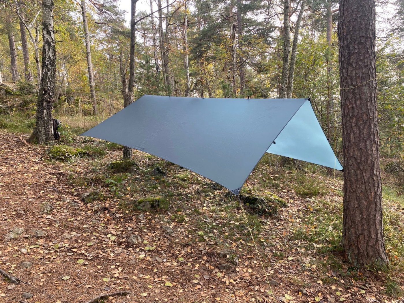Jeg falt for fristelsen å gå til anskaffelse av en "tarp poncho". Valget falt på Sea to Summit sin Ultra-sil Nano. I utbrettet form måler den ca 145x265 cm. Noe særlig mindre tror jeg blir for snaut til tarp-bruk. Som pncho virker den ok - uten at jeg har prøvd den i regn. Litt spent på hvor åpen den blir med kneppinga i sidene. Bør jo bli relativt god lufting til en poncho å være, da. Halsåpningen er ganske trang, såpass at jeg måtte ta av brillene for å få gjennom hodet. Riktignok er jeg tjukk i hue (61-62 cm), men det hadde ikke gjort noe om åpningen var en cm eller to videre. Noe problem er det dog ikke. I følge pakningen veier pnchoen 230 gram. Min kjøkkenvekt sier 202 gram. Måtte selvsagt ut og teste et enkelt oppsett som tarp også. Den må settes ganske lavt for å dekke godt om man skal sove under den, hvertfall om det blåser litt.