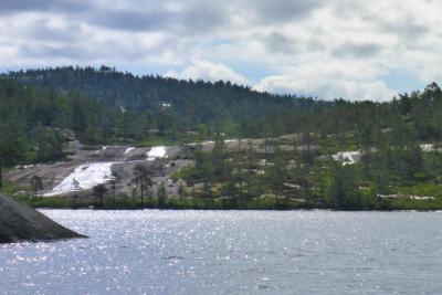 Endelig litt sommerferie og det var dags å ta årets villmarksferie. Turplan A var Børgefjell men da været til fjells ikke var all verden og jeg hadde hørt noe om snø og flomstore elver ble det turplan B istedet som var padlig i Gautefall. Planen ble å kjøre til bommen på veien opp til Mjåvatn, så trille kano fra bommen og opp til vannet. Så padle innover Mjåvatn, Tollbutjønn, Austre Breivatn, Heimre Brevatn, Bergyl, Teilagsvatn, Svarttarmen og inn til Hanetarmane. Men mye vind kortet ned turen noe. Gautefall er et fint område med mye svaberg, furuskog og myrer. Vannene ligger på ca 450-470 moh så det er mer marka enn fjellet, men alikevel mer åpent enn f.eks nordmarka i Oslo. Selv om det er et supert sted å padle med korte bæringer og fin natur så vi ingen andre der inne. Men folk ferdes helt klart der da det går sti på bærestrekket mellom vannene. En kan treffe terrengsyklister der inne da det er en del sykkelstier tilknyttet Canvas Hotel, som er et eldorado for terrengsyklister. Egentlig var det greit med lite folk siden vi kunne velge å vrake i leirplasser, det var også enkelt å finne ved. Eneste fremmedelement i villmarka er en og annen mindre hytte/koie. Sjelden mer enn en pr vann, unntatt Mjåvatn hvor det er hyttefelt. Dog så vi ingen på noen av hyttene. Stusset over er at vi så lite dyreliv der inne. Noen småfugler var vel alt. Til å være så mye vann så var det ikke måker der, de pleier være overalt ellers. Men vi savnet de ikke akkurat. Lurer på om det er fordi det er næringsfattige vann. Så vidt jeg vet er det bare ørret der. Gir kanskje lite småfisk etc strandsonen, vet ikke. Stort sett linerler og et svalepar ved leir i Teilagsvatn. Så et par ender eller noe i Heimre Breivatn litt på avstand. Hørt noen rykter om at fisket er bedre lengre inn. Mandag Avreise fra Oslo på formiddagen men en lunsjpause ved Porsgrunn. Så videre på til Gautefall. Kjøretid fra Oslo er ca 3 timer ekskl. pauser. Stoppet på Essostasjonen på Bostrak for å kjøpe fiskekort. Fant nemlig ikke området vi skulle til på Inatur. Esso hadde ikke kort til det område vi skulle i følge hun som jobbet der. Da ble det å kjøre en liten omvei til Treungen for å sjekke. Sparbutikken på Treungen hadde kort, Heimdalsheia het vist nok området. Det kortet gjelder ikke for første vannet på turen men det skulle vi bare padle over uansett. Det gjelder heller ikke lengre inn enn Teilagsvatn. Kort til vannen lengre inn hadde de ikke. Mulig turistinfo har men da klokka var 1630 da vi kom hadde de stengt. Kjørte tilbake og parkerte bilen ved bommen opp til Mjåvatn og begynte montering av Ally. Etter ca 25-30 min var kano montert, ryggsekker og pakksekker pakket ferdig og vi satte avgårde. Selve trillingen er ca 1km og det er ganske flatt, en svak stigning et stykke men det gikk kjapt å komme seg opp til vannet. Første etappe over Mjåvatn gikk ganske kjapt. Vannet er ikke så stort og det var fint vær og nesten vindstille denne dagen. Første bæring var over til Tollbutjønn. En kort bæring på ca 50m eller så med ca 0 høydemeter. Mulig å bære på begge sider av den lille bekken. Selve tjønnet er rask å padle over. Kan neppe ha tatt mer enn 5-6 min eller så. Så var det bæring over til Austre Breivatn. Denne bæringa er litt lengre(ca 150m) og er litt mer kupert. Vi bar sekkene over på stien men selve kanoen bar vi bort i en tarm på et tjønn som heter Nedre Kråkomtjønn. Distansen er veldig kort så det var ikke vits å laste kano her. En mann padlet den gjennom myra og den andre tok i mot på andre siden. Austre Breivatn er et større vann med langt klarere vann enn de mindre vannene i området. Vann med mye stein og en del steingrunner. Vi padlet langs land for å begynne se etter første leir. Klokka var blitt ca 20 på kvelden og det fristet med litt fiske og en pils på et svaberg i sola. Fant en plass på odden øst i vannet. Greit plass til et par telt i lyngen og en liten bålplass nede på svaberget, dog lenge siden hadde vært i bruk så det ut som. Kun en ørret på 300gr fant veien på land denne kvelden men den fungerte fint som litt kveldssnacks. Mjåvatn En bit av Nedre Kråkomtjønn Professor Drøvel??? Tirsdag Våkner opp til regn denne morgenen. Var meldt det så vi hadde satt opp tarp kvelden i forveien. Planen var å vente under tarp til regn ga seg til midt på dagen. Men værmelding stemte ikke helt så det drøyde ganske langt på dag før det klarnet opp. Det gjorde at vi fant ut at vi ble en natt til på stedet. Vi var ikke kjent innover fra før så vi viste ikke helt hvor langt vi måtte padle før vi fant neste plass. Vi så nemlig ikke plasser overalt innover. Selv om det er en del størrelse på vannene er det lange skrå svaberg mange steder, høy lyng eller myr. Det ble ingen fiskelykke denne dagen. Ble en bedre middag her med en marinert indrefilet av svin. Første stekt litt i panne og så lagt i folie i kant av bålet. Men med en ekstra dag her så det litt mørkere ut på hvor langt inn i marka vi kom til å rekke. Et bålbilde må med, fra første leir. En elv som renner over sva ikke langt fra første leir. Turfølge slapper av. Onsdag Våkner tidlig på morgenen at det blåser rimelig mye. Det var meldt 3-4 ms men det var en del mer enn det i kastene og de kom ganske ofte. Skjønte fort at det ikke var vits å være mer i denne leir da den lå veldig utsatt for vind fra sør og vest. Det ble derfor pakking av kano etter frokost og vi satte avgårde. Første stopp er sundet inn til Heimre Breivatn. Det går en liten bekk der og det gikk akkurat å dytte og line kano gjennom med noen småløft uten å ta ut bagasjen. Vi skulle ikke padle veldig langt i dette vannet men med delvis motvind så tok det litt tid å runde odden å komme seg i land der bekken fra Berghyl kommer ned. Bæringen opp til Berghyl er enkel da bekken renner over sva det meste av veien og man kan gå ved siden av den. Riktig så idyllisk sted