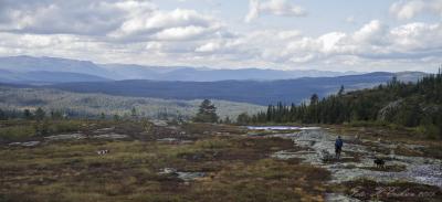 Trillemarka ... hørt mye om den, Norges største skogreservat og jaggu er det ikke en topp eller to inni der også. Vi står på gårdsplassen på småbruket i Nore og ser over mot Trillemarka, så fant ut at det var på tide å få tatt en tur. Note to self, bruk veibeskrivelsen på ut.no .. ikke søk "Slettefjell" på google maps ... man ender opp på feil sted (jada, hadde jeg tenkt meg om hadde jeg visst dette før jeg reiste). Men men, istedet for å starte fra Grøset seter ble det start fra et sted i Nedalen, riktignok via Grøset så turen ble bare noe lenger enn planlagt men men .. vi fant da frem. Vel fra parkering langs en uspesifisert skogsbilveg, fant vi blåmerka sti over til Grøset seter det ble vel 1,8 km over der .. veldig vått, mye myr. Fra Grøset fulgte vi turen som beskrevet på ut.no: Slettefjell, skogsbilveg et stykke oppover før det etterhvert tok av sti inn mot Slettefjell. Gjorde unna mye av stigningen på skogsbilvegen og det var jo ganske kjekt. Trådte andektig over grensa til naturreservatet og merka i grunn ikke så mye mer til det. Passerte noen idylliske vann før vi kom opp på snaufjellet. Finfin tur, opp til toppen 905 moh. blåser som vanlig på toppene så oppholdet ble ikke så langvarig men en kvikklunsj på toppen ble det. Samme vei ned igjen, selv om det var blåmerket sti videre i retning bilen så er ganske sikker på at vi kunne gått en runde .. men har dårlig erfaring med snarveier så tenkte det var best å ta kjent vei tilbake også ... vel .. følg de blå merkene tilbake til bilen, burde jo være enkelt nok .. hvis man ikke velger feil sett med blå merker da vel og merke ... "du si meg, jeg kan da ikke erindre at det var så bratt her da vi kom ned" ... tilbake til utgangspunktet og følg de andre blå merkene .. Kunne jo hørt på bikkja som valgte rett vei med en gang .. men nei .. må nok bare innrømme at det ser ut som om korttidsminneforeningen kan få et medlem til. Det var en bra tur, fint vær og veldig lite folk. Traff 2 damer som var på tur ned ellers ingen. Lite liv å se, den der fuglehunden fant ei røy som den fikk på vingene men det var det.