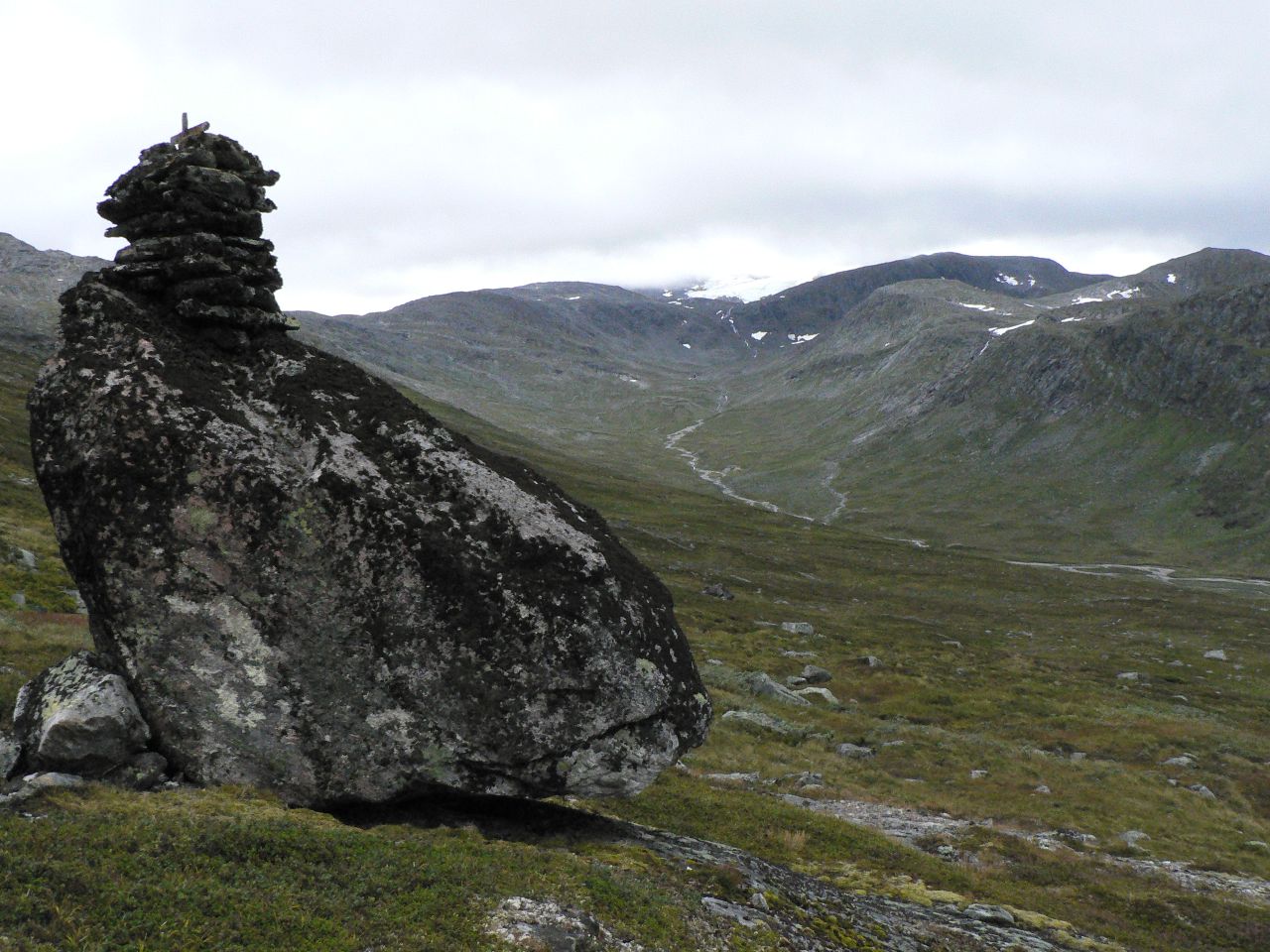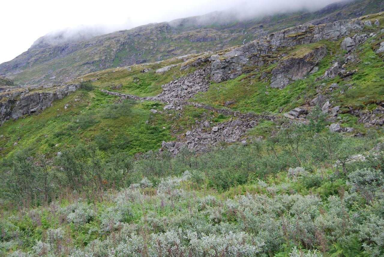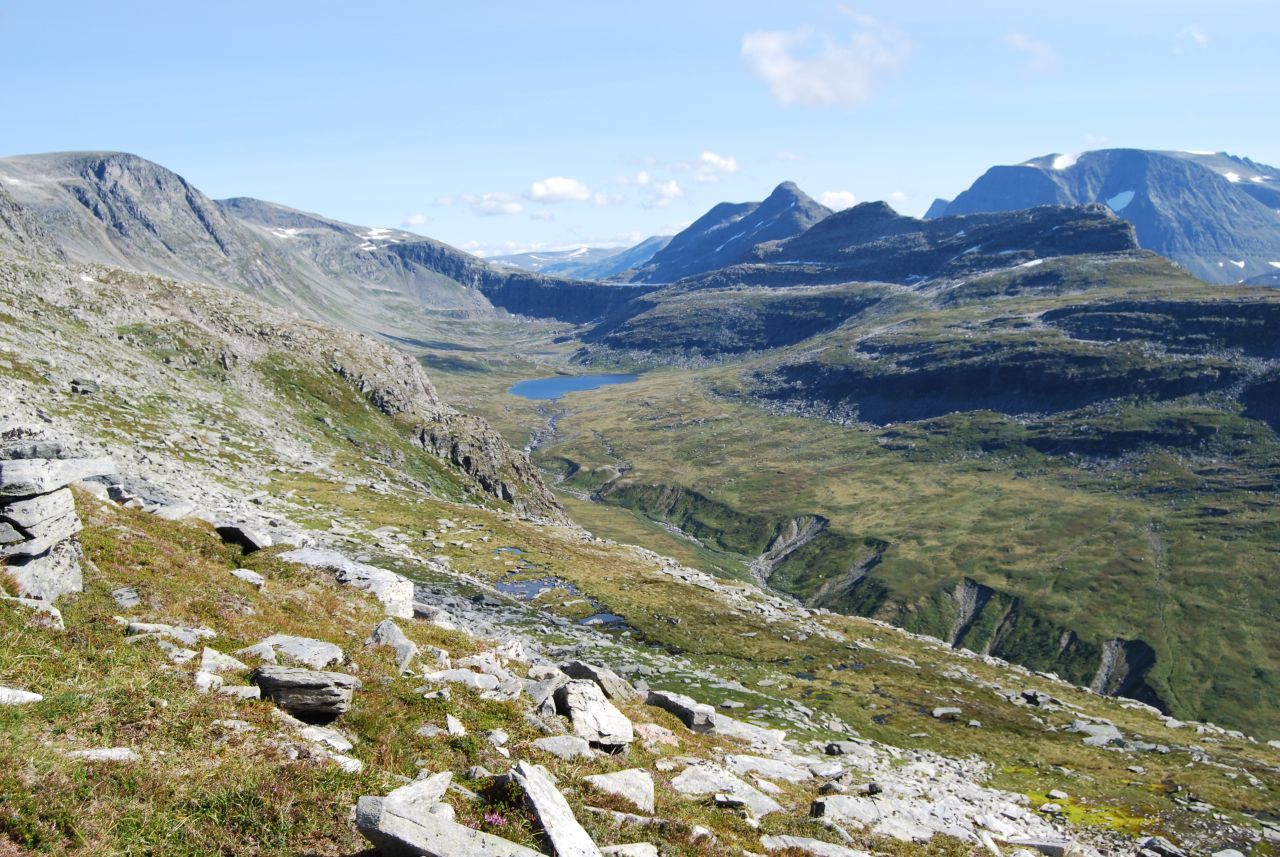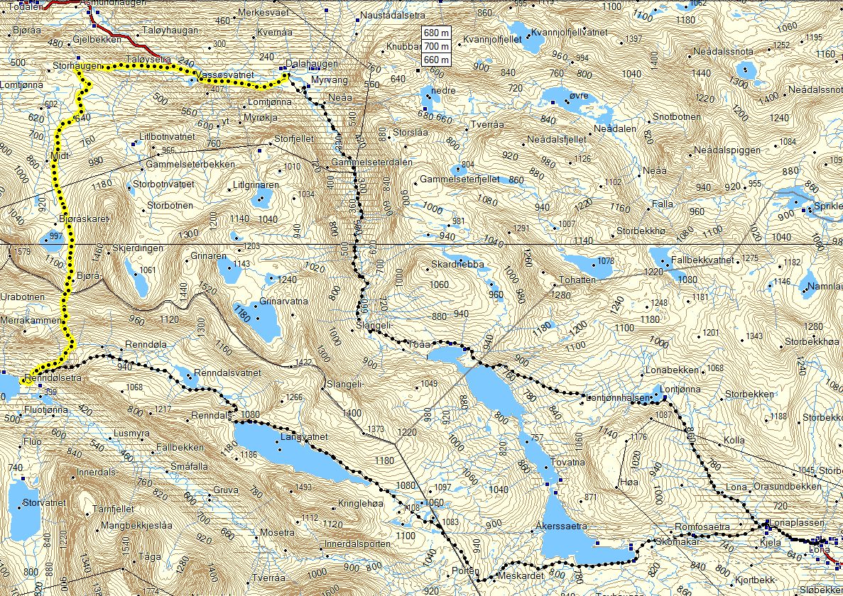 Så kom da endelig august med mindre innsekter og mørkere kvelder og årets begivenhet sto for turen - venneturen fra Storlidalen via Kårvatn og Innerdalen tilbake til utgangspunktet. Men det skulle ikke være bare enkelt; Etter en sommer med hoven ankel og minimal turaktivitet måtte jeg benytte de siste par ukene før avreise til å gå inn nye sko ved turer i nærmarka og så braket det løs med en god dose bilkjøring i turuka. Mandag 64 mil t/r Nord-Trøndelag, tirsdag 50 mil til Oslo, onsdag t/r Gardermoen og torsdag ca 43 mil til Storlidalen med retur til Oslo søndag - ser ikke tungt på en liten biltur, men dette ble i drygeste laget. Men tilbake til fjellturen som startet med en biltur over Rondevegen og Dovre til Storlidalen i Trollheimen hvor jeg rakk å installere meg i Bortistu med en pils før resten av følget kom fra Trondheim. Hjertelig gjensyn og et kjempemåltid med bassturøkt lammelår som hovedingrediens - skal det være luksus så gjelder det å slå til - og rødvinen var heller ikke ille Turen startet neste morgen(eller heller formiddag) med en liten spasertur langs anleggsveien inn mot Tovatna før vi dro opp i terrenget og fulgte merket sti inn til det innerste av Tovatna. Været var sånn passelig med lave skyer og enkelte tendenser til yr - men insekter var slettes ikke noe problem. Ned Gammelseterdalen var den merkede stien omlagt siden forrige gang jeg gikk der, og fulgte nå det gamle veianlegget på vestsida av Toåa. Veianlegget ble visstnok påbegynt ca. 1847 og hadde som mål å få til en kjerrevei mellom Oppdal og Todalen etter som oppdalingenes nærmeste forbindelse til sjøen gikk ned til Todal. Anlegget ble etter noen år avsluttet, men restene er godt synlig, og det er imponerende hva som ble utført i de bratte fjellsidene. Etter at vi krysset Toåa på ei ny bru ble terrenget temmelig fuktig, og det ble slitsomt å krysse seg frem og samtidig forsøke å unngå å fylle skoene med myr. Men vi kom da etter hvert frem til ei ny bru som igjen bragte oss over på vestsida av elva der gården og turisthytta på Kårvatn ligger. Men vi kunne ikke dy oss, noen av oss måtte forsøke et bad i elva og vi gutta dro nedover elva og badet der Nauståa kom inn i Toåa. Frisk opplevelse, men herlig etter svettingen gjennom myr og jord. Og mindre herlig var det heller ikke å komme til gårds og en kald pils. Maten måtte vi ordne selv, men med godt lager av hermetikk i selvhusholdet hadde vi ingen grunn til å klage. Med 12 stykker i følget ble det fullt på fellesrommet og det var godt besøk så det ble plassert folk litt rundt omkring, men alle fikk et sted å sove. Neste dag skulle vi gå over Bjøråskaret til Innerdalen så det starte igjen med noen km langs en vei før vi dro opp i terrenget. Men denne dagen var solen med oss, og det ble flere avslappende pauser oppover bakkene. Vegetasjonen følger med langt oppover, og etter som utsikten vider seg ut kan vi se både sjøen og innover i Trollheimen. Et herlig syn i alle retninger. Det var mye folk i fjellet, og på toppen av Bjøråskaret var det tilløp til køsitting rundt omkring. Men utsikten rettferdiggjorde trengselen - her var det mye flott fjell å se Det var bare et lite skår i gleden; En person var savnet i fjellet og vi kunne se - og høre - helikopteret som drev søk. Den savnede var visstnok slektning av vertskapet på Renndølsetra der vi skulle bo. Nedover fra Bjøråskaret er det bratt, og lårene fikk føle det etter hvert. Varmt ble det også etter hvert, så da vi var nesten nede i dalen ble det igjen bading i en kulp i Renndøla - riktig oppfriskende, men denne dagen med et varmt svaberg å gå opp på. Stort bedre går det ikke an å få det etter en dag i fjellet. Igjen fikk vi ferdiglaget mat, og rømmegrøten var så god at det igjen ble i meste laget - dette var definitivt ikke en slanketur Etter erfaringen med myr og jord i Gammelseterdalen ble det til at vi gikk om Langvatnet i stedet for via Innerdalsporten tilbake til Storlidalen på søndag. Fordelen med dette valget var at vi slapp å vasse i søla, men til gjengjeld var stigningen i starten saftig nok. Heldigvis lå stien i skygge i starten, for sola skinte som dagen før, og solhatten måtte frem for å beskytte et noe hårredusert topplokk Turen forløp udramatisk, og etter dagens siste rast valgte jeg å takke for meg og sette opp farten ned mot bilen. Tanken på 43 mil alene i bilen fristet ikke. Eneste bommert var at jeg antok at jeg kunne finne drikkevann langs veien ned fra Tovatna - men den gan ei, jeg gikk helt frem til bilen før jeg fant vann uten å måtte klatre ned til en nesten uttørret bekk. Tok Rondevegen tilbake også etter som dette er kortere enn om Dombås, men droppet besparelsen ved å kjøre over Lygna og holdt meg til E6 og anleggsarbeidene både på Mjøsbrua, sør for Hamar og i Ullensaker. Turen hadde vært topp fra start til ende, og jeg har neppe gått Trollheimen/Innerdalen for siste gang.