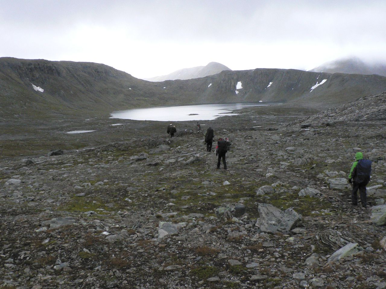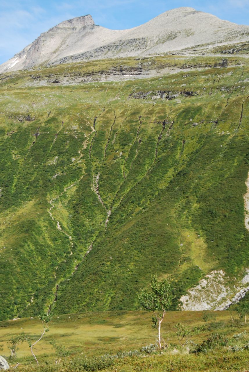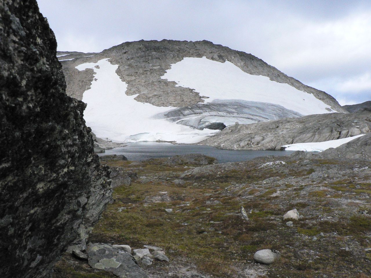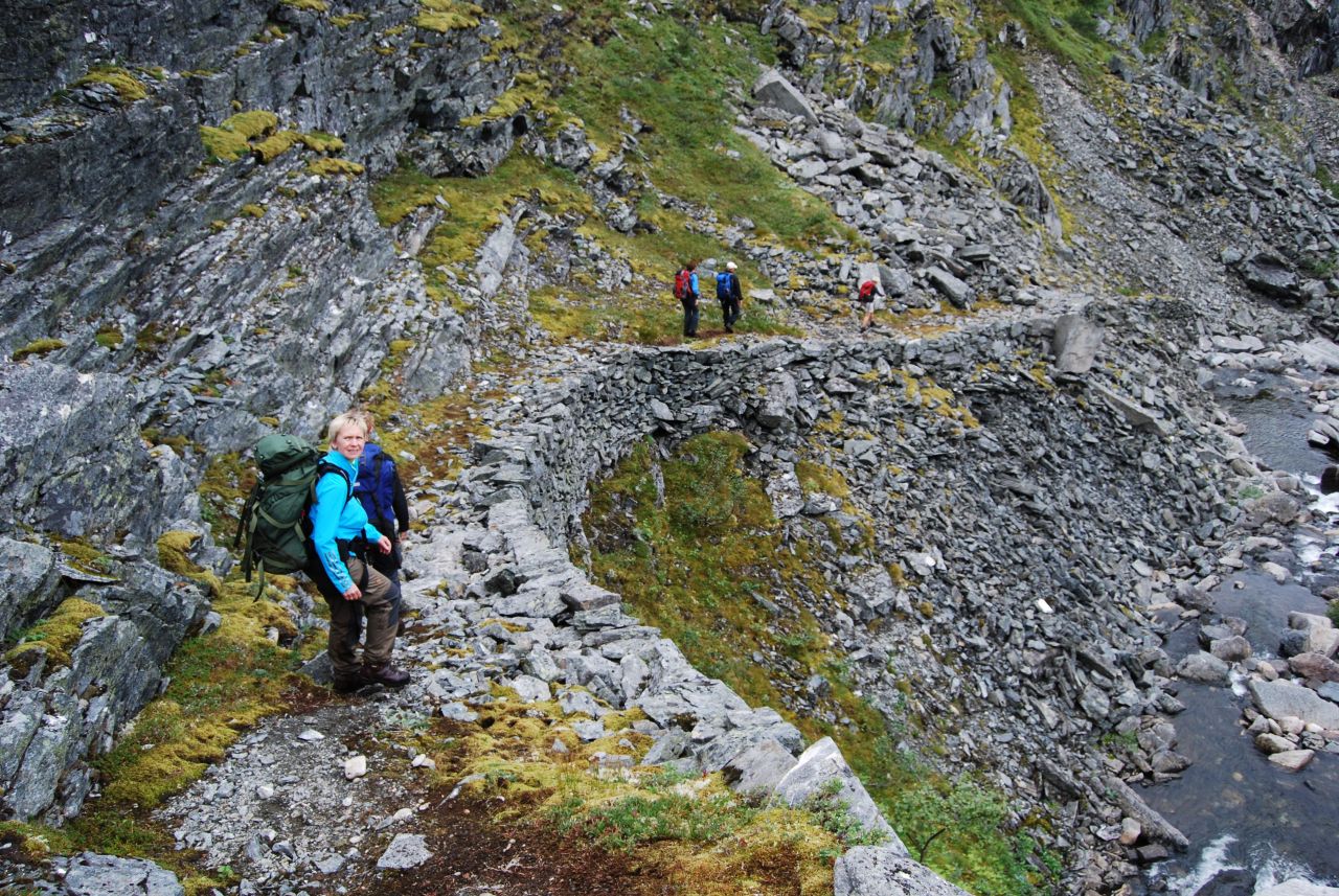 Så kom da endelig august med mindre innsekter og mørkere kvelder og årets begivenhet sto for turen - venneturen fra Storlidalen via Kårvatn og Innerdalen tilbake til utgangspunktet. Men det skulle ikke være bare enkelt; Etter en sommer med hoven ankel og minimal turaktivitet måtte jeg benytte de siste par ukene før avreise til å gå inn nye sko ved turer i nærmarka og så braket det løs med en god dose bilkjøring i turuka. Mandag 64 mil t/r Nord-Trøndelag, tirsdag 50 mil til Oslo, onsdag t/r Gardermoen og torsdag ca 43 mil til Storlidalen med retur til Oslo søndag - ser ikke tungt på en liten biltur, men dette ble i drygeste laget. Men tilbake til fjellturen som startet med en biltur over Rondevegen og Dovre til Storlidalen i Trollheimen hvor jeg rakk å installere meg i Bortistu med en pils før resten av følget kom fra Trondheim. Hjertelig gjensyn og et kjempemåltid med bassturøkt lammelår som hovedingrediens - skal det være luksus så gjelder det å slå til - og rødvinen var heller ikke ille Turen startet neste morgen(eller heller formiddag) med en liten spasertur langs anleggsveien inn mot Tovatna før vi dro opp i terrenget og fulgte merket sti inn til det innerste av Tovatna. Været var sånn passelig med lave skyer og enkelte tendenser til yr - men insekter var slettes ikke noe problem. Ned Gammelseterdalen var den merkede stien omlagt siden forrige gang jeg gikk der, og fulgte nå det gamle veianlegget på vestsida av Toåa. Veianlegget ble visstnok påbegynt ca. 1847 og hadde som mål å få til en kjerrevei mellom Oppdal og Todalen etter som oppdalingenes nærmeste forbindelse til sjøen gikk ned til Todal. Anlegget ble etter noen år avsluttet, men restene er godt synlig, og det er imponerende hva som ble utført i de bratte fjellsidene. Etter at vi krysset Toåa på ei ny bru ble terrenget temmelig fuktig, og det ble slitsomt å krysse seg frem og samtidig forsøke å unngå å fylle skoene med myr. Men vi kom da etter hvert frem til ei ny bru som igjen bragte oss over på vestsida av elva der gården og turisthytta på Kårvatn ligger. Men vi kunne ikke dy oss, noen av oss måtte forsøke et bad i elva og vi gutta dro nedover elva og badet der Nauståa kom inn i Toåa. Frisk opplevelse, men herlig etter svettingen gjennom myr og jord. Og mindre herlig var det heller ikke å komme til gårds og en kald pils. Maten måtte vi ordne selv, men med godt lager av hermetikk i selvhusholdet hadde vi ingen grunn til å klage. Med 12 stykker i følget ble det fullt på fellesrommet og det var godt besøk så det ble plassert folk litt rundt omkring, men alle fikk et sted å sove. Neste dag skulle vi gå over Bjøråskaret til Innerdalen så det starte igjen med noen km langs en vei før vi dro opp i terrenget. Men denne dagen var solen med oss, og det ble flere avslappende pauser oppover bakkene. Vegetasjonen følger med langt oppover, og etter som utsikten vider seg ut kan vi se både sjøen og innover i Trollheimen. Et herlig syn i alle retninger. Det var mye folk i fjellet, og på toppen av Bjøråskaret var det tilløp til køsitting rundt omkring. Men utsikten rettferdiggjorde trengselen - her var det mye flott fjell å se Det var bare et lite skår i gleden; En person var savnet i fjellet og vi kunne se - og høre - helikopteret som drev søk. Den savnede var visstnok slektning av vertskapet på Renndølsetra der vi skulle bo. Nedover fra Bjøråskaret er det bratt, og lårene fikk føle det etter hvert. Varmt ble det også etter hvert, så da vi var nesten nede i dalen ble det igjen bading i en kulp i Renndøla - riktig oppfriskende, men denne dagen med et varmt svaberg å gå opp på. Stort bedre går det ikke an å få det etter en dag i fjellet. Igjen fikk vi ferdiglaget mat, og rømmegrøten var så god at det igjen ble i meste laget - dette var definitivt ikke en slanketur Etter erfaringen med myr og jord i Gammelseterdalen ble det til at vi gikk om Langvatnet i stedet for via Innerdalsporten tilbake til Storlidalen på søndag. Fordelen med dette valget var at vi slapp å vasse i søla, men til gjengjeld var stigningen i starten saftig nok. Heldigvis lå stien i skygge i starten, for sola skinte som dagen før, og solhatten måtte frem for å beskytte et noe hårredusert topplokk Turen forløp udramatisk, og etter dagens siste rast valgte jeg å takke for meg og sette opp farten ned mot bilen. Tanken på 43 mil alene i bilen fristet ikke. Eneste bommert var at jeg antok at jeg kunne finne drikkevann langs veien ned fra Tovatna - men den gan ei, jeg gikk helt frem til bilen før jeg fant vann uten å måtte klatre ned til en nesten uttørret bekk. Tok Rondevegen tilbake også etter som dette er kortere enn om Dombås, men droppet besparelsen ved å kjøre over Lygna og holdt meg til E6 og anleggsarbeidene både på Mjøsbrua, sør for Hamar og i Ullensaker. Turen hadde vært topp fra start til ende, og jeg har neppe gått Trollheimen/Innerdalen for siste gang.