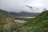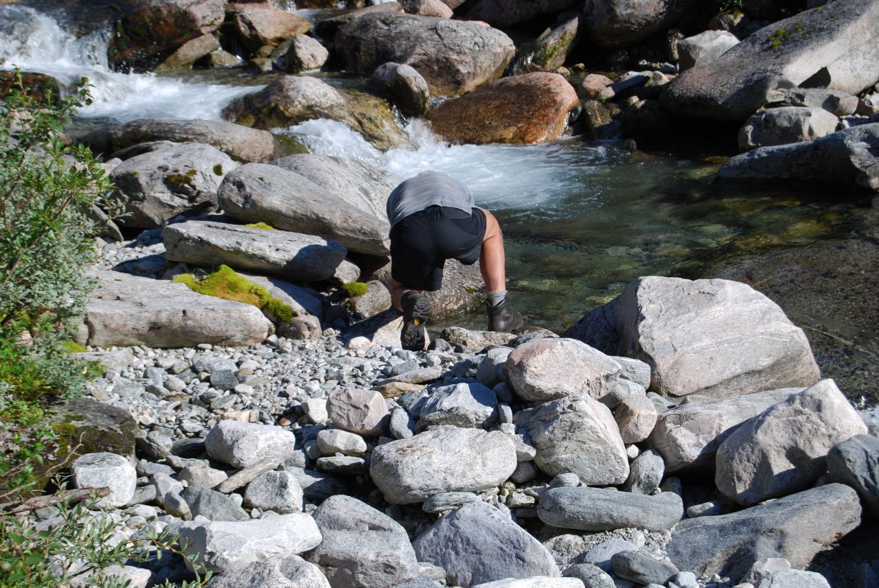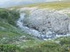 Trollheimen er ikke det mest kjente fiskeområdet i landet. Men fisk er det der, og enkelte steder flott fisk også. Skikkelige trollaurer må det her være snakk om. Et av vanna med stor fisk ligger tilgjengelig for dagstur fra Kårvatn. Er et titalls vann å velge mellom, fin fisk i flere, men ett skiller seg ut. Her har fisken ord på seg for å være umulig å få på stang. Det betyr vanligvis to ting. Du må regne med å fiske en god stund for hver fisk, og, fisken der har nok av mat. Og det vet vi hva betyr! Jeg har fiska der to ganger før uten å få napp. Da værmeldinga sa at ukesvis med gråvær skulle bli avløst av sol og varmere vær ble valget tatt. Lang dagstur! Tidlig start, en halvtime kjøring, ferge og ny halvtime med kjøring og vi, dvs jeg og bikkja, var klare til start. Naustådalsfossen er selve kjennemerket her, en tur bortom hører med, før vi tar stien opp langs fossen. Et litt vondt kne, som nå heldigvis er bedre, har lagt en stor demper på treninga etter påske. Og når verden brått blir en lang motbakke kjennes det det godt. Bikkje i vakker natur og tilgjengelig fotoapparat er god unnskyldning for en stopp! Drøye 600 høydemeter senere kan jeg endelig se ned på første vannet. Selv har jeg bare fått småfisk der, men jeg har sett bilder av stor fisk derfra. I dag var det blankt og fint, men slett ikke gode fiskeforhold! En liten bris kommer når jeg er vel nede ved vannet og en liten tass på 250g lar seg lure før jeg går videre. På veien opp kommer brisen mer og mer og framme ved vannet er forholda riktig så lovende! En matbit først og litt avslapping for å kunne ta ei skikkelig økt! Sol og vind er pervoføre. Det blir dermed den som for seg et bad først. Ingenting. Etter diverse slukbytter setter jeg på "ambulansesluken". På første kastet sitter den! Men desverre bare i noen sekunder. Rimelig irreterende! To kast etterpå er det fisk igjen og denne gtangen havner den i håven. Så var det altså mulig. En litt slank 700 grammer. Det er overraskende. Fisken her har ord på seg for å være grisefeit. Konsekvens av en uvanlig sen vår? Eller begynnende overbefolkning? Jeg fortsetter med samme sluk uten å kjenne noe mer. Vinden stilner og noen vak dukker opp. samme sluk i 12grams utgave lurer en 300 grammer. Det skyer over og jeg setter på en rød jensen. 25g. Det funker bra og jeg kan ganske snart håve en halvkilosfisk! Vanligvis setter jeg lite pris på at noen forsøker å rykke ting ut av hendene mine. Enkelte unntak finnes imidlertid og det neste hogget er absolutt et av dem. Et kraftig rykk helt inne ved land gjør det klart at dette er større fisk. Jeg løsner bremsen og fisken er så grei at den gjør som jeg vil. Et langt rolig utras gjør at jeg slipper heftige krumspring på kort snøre. Godspeedstanga, (12 fot 5-25g) viser seg svært behagelig å kjøre fisk på. Demper rykk effektivt og har ryggrad nok til å legge press på fisken. Noen utras senere kan jeg håve fisken. Den klart største jeg har fått i dette området! Vekta er litt skuffende. 1,45kg. Tippet litt mer, men bredda over ryggen manglet. Uansett svært fornøyd med fangsten. Hjemturen legges via et annet vann litt høyere. Det viser seg å være delvis islagt! Ikke mer enn drøyt 900 meter over havet i slutten av juli! Sen vår! Jeg tar noen få kast uten resultat. På turen ned har jeg gleden av å rusle på det som må være en av de mest idylliske stiene jeg har gått på. En fin avslutning på turen! Det er vel ikke så vanskelig å finne ut hvor dette er. God tur. Vannet bør fiskes mer i. Kjent for smellfeit fisk, men som dere ser på bildene stemmer ikke det lengre. Tror også det er mulig å leie hytte ved vannet. Og i alle fall før var det da også mulighet for å sette garn. Det hadde vært et bra tiltak!