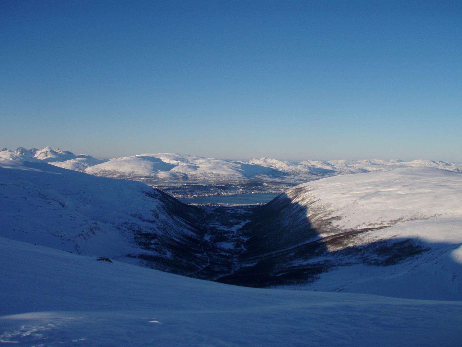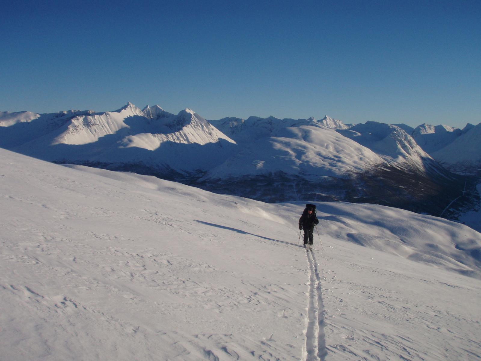 Helga 16.-18. februar var det kjempevær i Tromsø-området. Helga ble brukt til å gå på ski i det området rett utenfor Tromsø som bare kalles Tromsø fastland. Dette området kan for Tromsøværinger på mange måter sammenlignes med det Nordmarka er for Osloborgere. Forskjellen er bare mye mindre folk og at det her er fjell og ikke skog! Området inneholder fire turlagshytter, noe som muligjør mange alternative rutevalg for helgeturer. Man kan nå utgangspunkt for turer i dette området med buss fra alt i fra 5 til 45 min fra sentrum. Vi reiste ut til Snarbyeidet (45 min fra sentrum) tidlig fredag morgen. Mesteparten av dagen ble brukt til å bestige Ullstind, en topp på 1078 moh som er overkommelig for de fleste. Fra denne toppen er det nydelig utsikt mot Lygenhalvøya, Ringvassøya, øyene lenger ut, og sørover mot Tromsdalstind, m.m. Etter toppturen gikk vi rett før det ble mørkt inn til Trollvassbu fra Snarbyeidet, en tur på ca 5 km. Lørdag gikk vi fra Trollvassbu via Nonsbu til Skarvassbu, en avstand på ca 22 km. Søndag gikk vi fra Skarvassbu og runda baksida av Tromsdalstind (dvs østsida, den mot Ramfjorden) for så å renne ned til Tromsdalen, ca 22 km dette også. Alt i alt en veldig bra tur. Været var greit hele helga. Fredag var været delvis skya, lørdag overskya men uten vind, og søndagen var det fantastisk fint med skyfri himmel og lite vind. Jeg har vært mye i dette området før, men oppdager stadig vekk nye detaljer og nye muligheter. En ny vri på denne turen var å gå på baksida av Tromsdalstind, en rute som var veldig grei å følge.- 5 svar