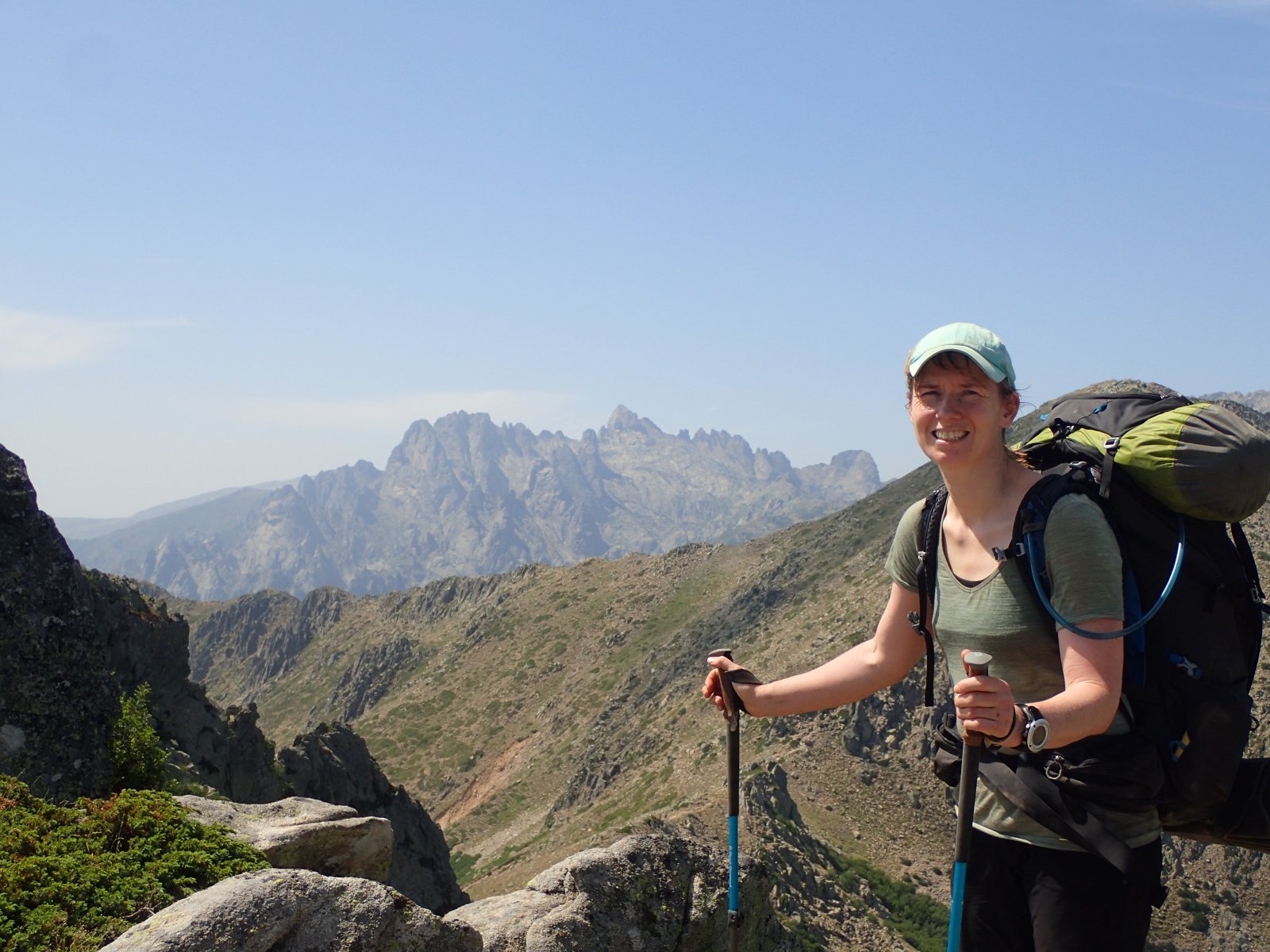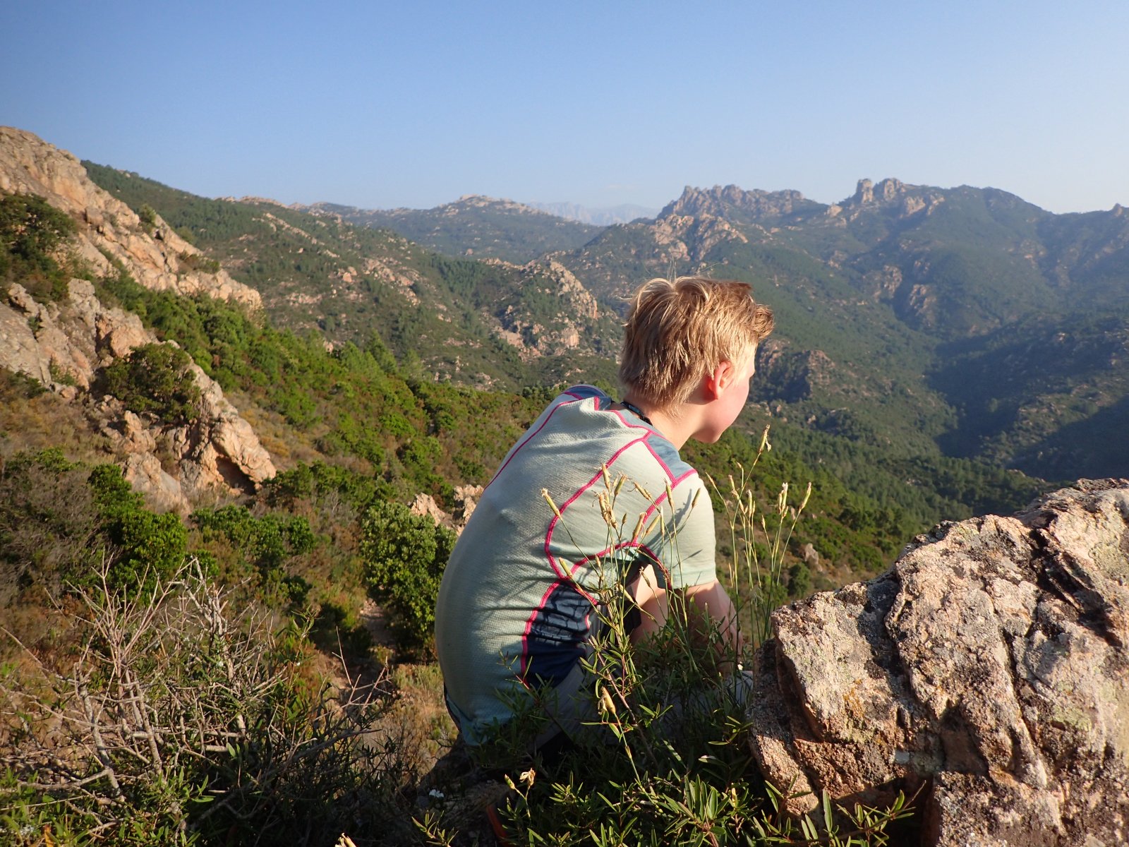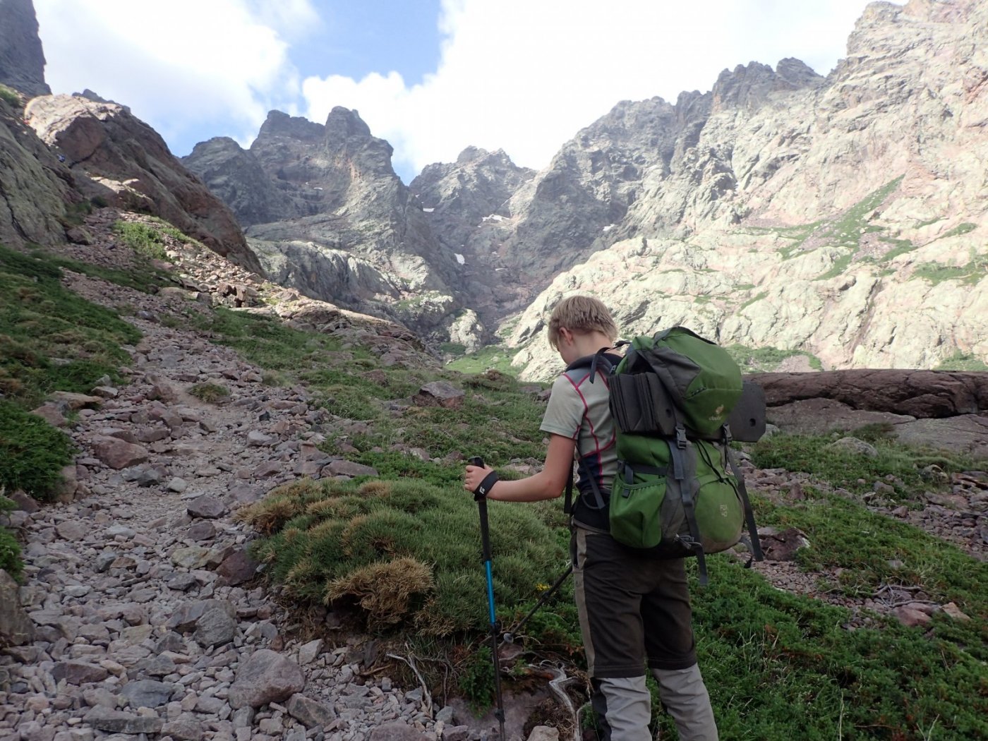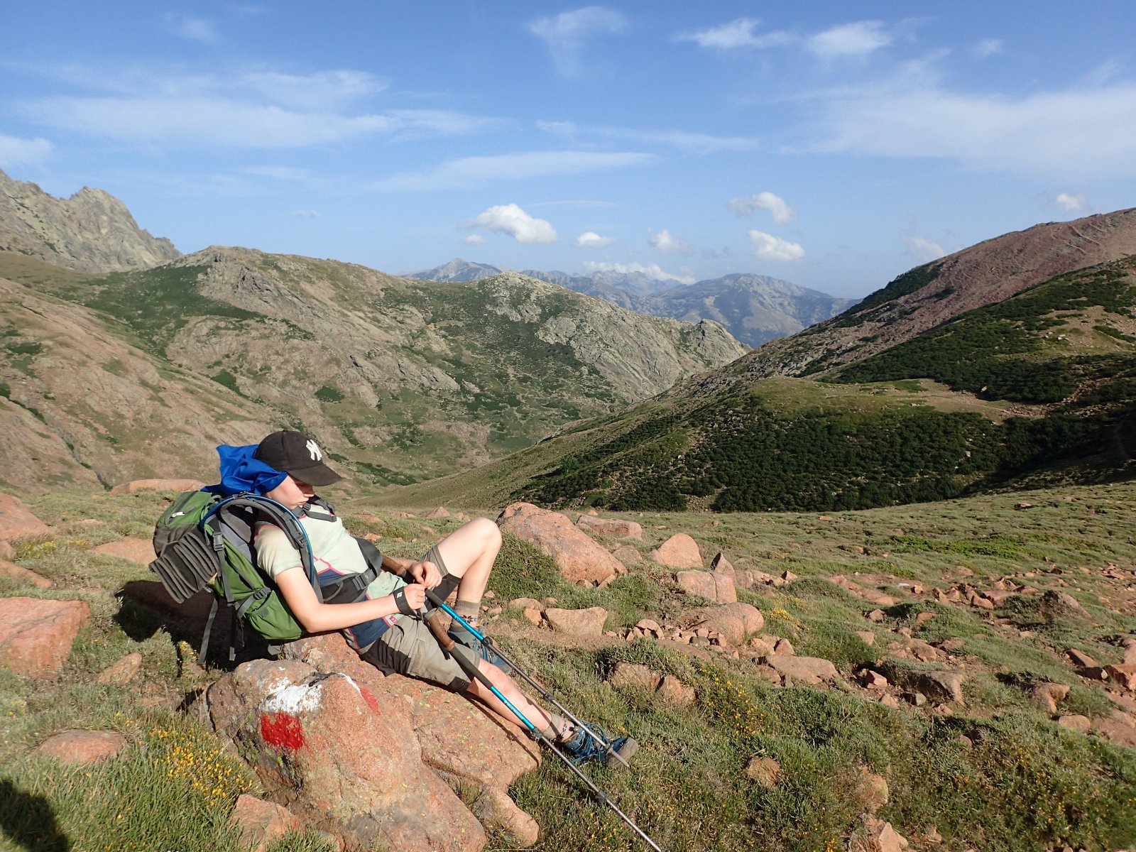 Sommerens familieferie skulle gå til Korsika, og dermed begynte jeg å lete etter en passende fjelltur for 12-åringen og meg. Det tok ikke lang tid før jeg landet på GR20, Korsika på langs gjennom fjellene. Mye er sagt om den turen, og den er blant annet kaldt Europas tøffeste fjelltur. Det er en heftig overdrivelse. Jeg tror 30 000 personer går turen pr år, og det er godt merket og tilrettelagt. Man merker godt at dette ikke er Norge og at allemannsretten ikke eksisterer. Turen er delt inn i 16 etapper mellom hytter som tilbyr overnatting (inne på hytte må bookes, telt kan også leies) og teltplasser, samt serverer mat og har små butikker. Villcamping er ikke tillatt. Dagsetappene er beregnet til 5-8 timer uten pauser. Dermed ble også turen en langt mer sosial opplevelse enn det vi er vant til hjemmefra. Vi traff stort sett de samme menneskene ved hver leirplass, og det bragte en ekstra dimensjon til turen. Noen var svært turvante, andre slett ikke. Alle var hyggelige, og særlig vi som ikke snakker fransk slo oss sammen til en liten gjeng. De fleste går turen fra nord til sør, men av logistikk-hensyn valgte vi motsatt retning. Som vegetarianere var vi skeptiske til matserveringen, og jeg pakket derfor med meg mat for 10 dager. Det innebar åpenbart en langt tyngre sekk enn de aller fleste jeg møtte. Det er ofte begrenset tilgang på vann i løpet av dagen, så det må også bæres. Sekken nærmet seg vel 25 kg de første dagene, og det var ganske heftig i +35 grader, strålende sol og bratte bakker. Heldigvis ble jo sekken lettere dag for dag, samtidig som formen ble bedre. Vi lærte også gradvis at det var lurt (og verdt det) å stå opp grytidlig for å slippe å gå i den varmeste tiden på dagen. Alle snakket om at den nordlige delen var tøffest, men for oss var det tvert imot. Da vi kom nordover var sekken lett og rutinene på plass, og disse etappene gikk fort og lett. Den beryktede klatring/klyvingen var heller ikke på langt nær så utfordrende som vi hadde forventet. Da vi kom omtrent halvveis, ble 12-åringen syk. Hun fikk høy feber en ettermiddag, og vi endte med å villcampe i to netter. Det var ikke snakk om å komme oss videre, hun var helt utslått. Heldigvis kom en av våre turvenner forbi neste formiddag med noen kraftigere febernedsettende piller enn de jeg hadde, og det hjalp en del på formen. Ut på kvelden fikk hun i seg litt mat, og vi snakket om å prøve å komme oss til neste hytte (litt over en halv etappe) neste dag. Hun fikk fortsatt vidunderpillene, men da gikk det overraskende greit og vi var på l'Onda allerede kl 12. Der var det ingen skygge og lite fristende å henge rundt helt til kvelden. Vi trodde også at våre venner var på neste refuge, og etter å ha satt til livs hver vår gode omelett og litt brus bestemte vi oss like godt for å gå løs på en etappe til. Vi valgte den alpine varianten over en del fjellrygger til Petra Piana. Fordelen med å følge ryggene var selvsagt at vi fikk litt vind, og dermed ble ikke varmen alt for slitsom. Akkurat denne etappen var dessuten veldig fin, med flotte utsikter og ikke alt for bratte stigninger. Skuffelsen var stor da vi ikke så noen kjentfolk i leiren da vi endelig kom fram, og vi lurte på om alle hadde doblet og dermed fortsatt var en etappe foran oss. Følgende dag fra Petra Piana til Manganu var riktig spektakulær, men 12-åringen var nok fortsatt litt preget av sykdommen og at vi hadde gått så langt dagen før. Det var skrekkelig varmt og hun var sliten og lei. Det hjalp litt da vi møtte noen som klagde over vanskelig terreng og klyving, og enda mer da vi plutselig så Anu et godt stykke foran oss. Anu var ei indisk jente vi hadde holdt følge med hele turen og det var hun som ga oss de febernedsettende tablettene. Dermed kom entusiasmen fort tilbake, vi måtte ta henne igjen for å si takk for hjelpen! Så var det klart for turens lengste etappe. Fra Manganu til Cittolu de Mori var det i følge guiden 27km. Heldigvis var det ikke så mye stigning, så det gikk veldig greit. Vi hadde også en lang og herlig lunch på et hotell i Castel de Vergio, og det ga bra med energi videre. Etter en kort dag videre, var det tid for den mest omdiskuterte etappen på hele turen: Fra Tjiughetti til Asco, over skulderen til Monte Cinto på 2607m. 12-åringen hadde mast hele veien om å ta turen oppom toppen også (2706m), men ryktene tilsa at det var ganske langt dit (jeg hørte opp til 3t ekstra) og jeg hadde derfor vært forsiktig med å love noe. Etappen i seg selv skulle også være lang, og ikke minst var det risiko for torden på ettermiddagen. Det betydde en grytidlig start, og vi var på vei oppover før klokka var fem. Det var stjerneklart mens vi pakket teltet, men omtrent samtidig som vi begynte å gå skyet det over og vi hørte torden. Uværet holdt seg heldigvis på god avstand, men vi fikk tåke og litt regn på vei oppover, men også en flott regnbue. Da vi nådde Point de Ebolie, der vi eventuelt kunne gå til toppen, var være guffent. Tåka kom og gikk, det blåste heftig og steinene var våte etter en regnskur. Jeg syntes ikke vi kunne gå utenfor ruta, og ville heller sikre at vi kom oss ned i gode forhold. 12-åringen var skuffet, og det ble ikke bedre da det klarnet opp mens vi var på vei ned. Rett før vi var nede braket det varslede tordenværet løs, og det var voldsomt. Vi var blant de første som kom over fjellet den dagen og rakk akkurat å få opp teltet og før et intenst regnvær. Det kom delvis som hagl på fjellet, så der var det lite trivelig. Mange som fortsatt var på vei opp endte med å snu, og de som var på vei ned fikk en ganske strevsom tur. Vi var i grunnen heldige der. De to neste etappene var veldig fine, og særlig den fra Caruzzo til Piobu var spektakulær. Terrenget er vilt og ser nærmest ufremkommelig ut, men det er god sti og bare litt klyving innimellom. Det er også lagt ut kjetting på de mest krevende punktene, men på tørt fjell 