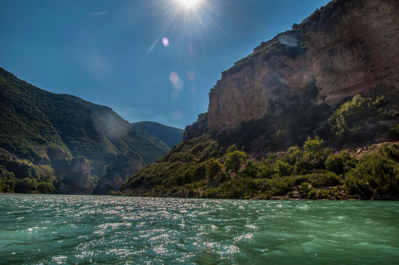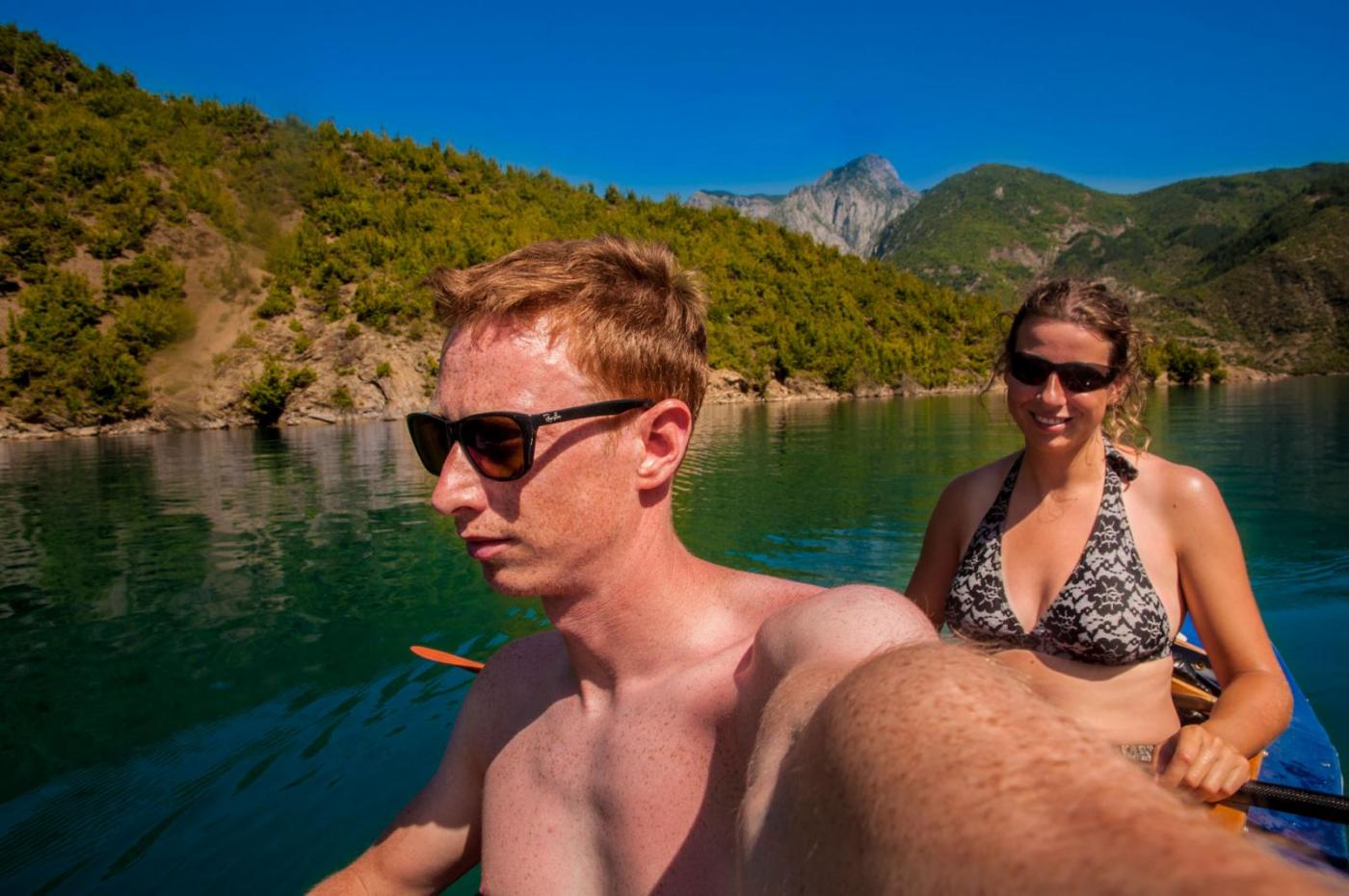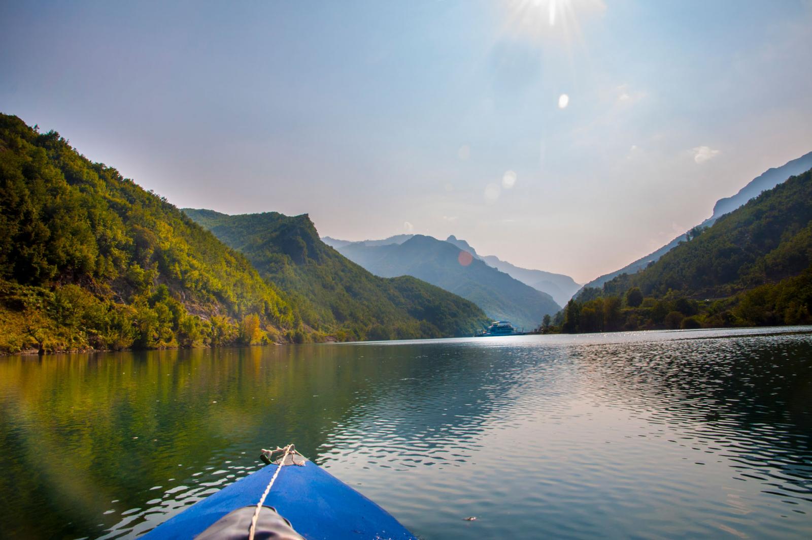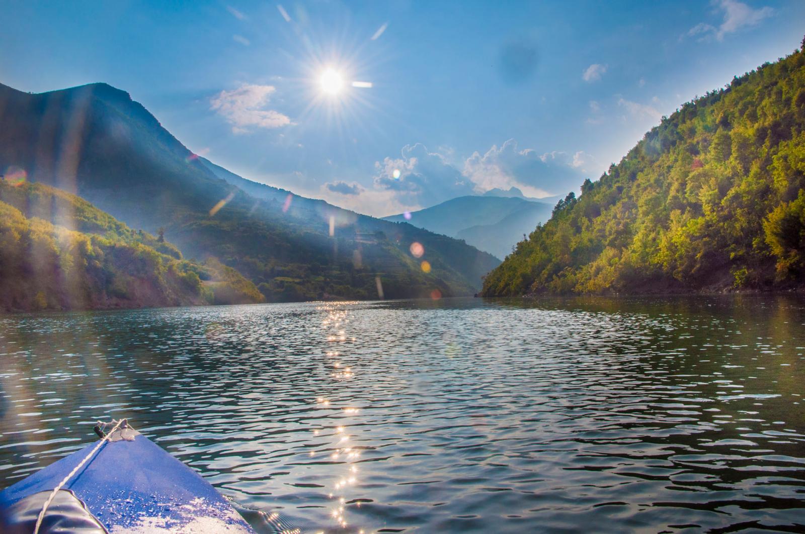 Denne sommeren tok jeg og en vennine fra Nederland en tur til Albania for å padle kajakk langs Vjosa, og Komani-vannet. Det hele startet med at jeg ville besøke henne i Longyearbyen hvor hun studerer. Jeg har aldri vært på Svalbard, og har fortsatt et stort ønske om å ta en tur dit. Turen til Svalbard skjedde altså ikke, det klaffet aldri med hennes studier og mine, samt flybillettprisen. Da det viste seg at dette ikke gikk, foreslo hun heller å finne på noe i sommerferien. Mange ideer ble slengt ut, og vi endte først opp med å haike Frankrike på langs, deretter såg vi på diverse fjellturer rundt Chamonix, og på litt flatere områder på grensen til Spania. Hun kunne etter hvert meddele at hun hadde skadet kneet sitt, så fjellturer ble dessverre utelukket. Fokuset skiftet fort over på padling og vi sto en god stund fast med å haike frankrike på langs og ende opp i Marseille, hvor vi kunne leie kajakker og padle rundt om langs kysten der. Etter iherdig gransking av google maps, la hun merke til Vjosa i Albania. Dette ble slått opp og bilder fra elven såg helt fantastiske ut (bare søk selv!). Spikeren ble hamret og flybilletter til Amsterdam ble bestillt. Nå gjensto det bare å få tak i en kajakk... Det var ingen som leide ut kajakker i området rundt Vjosa, eller som hadde mulighet for å frakte kajakker dit. Etter mye frem og tilbake, fant hun en ganske gammel sammenleggbar kajakk med trerammer. Det sier seg selv at denne ikke var direkte lett å drasse med seg, men det skal jeg fortelle mer om senere. Jeg ankom Amsterdam, tok toget til Zwolle den 12. juli. Her brukte vi noen dager på å fikse kajakken. Lappe litt og lime på ny bunnduk. Vi impregnerte også bomullstrekket på oversiden. Kajakken var blitt litt skjev over de siste 40 åra, så vi måtte finne en løsning for å korrigere dette. Alt i alt, det gikk et par dager før vi satt oss på toget mot Bremen i Tyskland hvor vi skulle møte noen felles venner av oss, avgang 15.juli. I Bremen var vi i to netter. Så begynte togturen turen mot Albania. Fra Bremen reiste vi via Hanover - Basel - Luzern - Milano - Bologna og til Bari. Her tok vi båt over middelhavet til Durrës, Albania. Ankomst 19. juli. Herfra var det å finne korteste vei til Tepelëne, hvor vi hadde sett for oss at det var fint å sette ut båten. Det var ikke så lett, da det ikke fantes noe god informasjon å finne, og bussene vi såg gikk bare til de større byene langs kysten, og hovedstaden Tirana. Etter en liten stund kom det en mann opp til oss og spurte hvor vi ville. Etter noe om og men (Tepelëne er ikke akkurat noen turistperle), fikk vi forklart at vi måtte finne bussen til en annen litt mindre by, og derfra ta minibuss resten. Minibusser gikk visst hele tiden, helt uten noe tidsskjema, og vi måtte bare stille oss langs veien i riktig rundkjøring og vinke når vi såg navnet på en papirlapp i vinduet. Vi kom oss frem, fikk drasset med oss alt pakket ned til elven, spiste mat og sov en natt før vi monterte sammen kajakken. Lokalbefolkningen var kjempehyggelige, og vi pratet mye med forskjellige folk. Stort sett alle som hadde gått noen år på skole, og ikke var for gammel, kunne engelsk, og kommunikasjonen gikk mye lettere enn vi hadde forventet. Vi satte igang nedover elven, endelig. Det var så fantastisk deilig å endelig komme skikkelig igang med turen. Kajakken var god å stabil, tålte vekten av to personer og dertil bagasje, og alt var bare nydelig. Elven Vjosa har mye å tilby. Det er noen få raske stryk, men ellers er elven rolig og lett å padle. Det er veldig lite stener å måtte svinge unna, og de største utfordringene var de mange grunnene vi måtte over. Her var det så grunt at vi måtte ut av båten, dra den forsiktig over, og sette oss tilbake når det ble dypt nok. Et par ganger var strømmen så sterk i andre enden, hvor det plutselig ble veldig dypt, at hun som satt bakerst og hadde styringen, og derfor måtte inn først, var den eneste som kom seg inn før båten ble tatt av strømmen nedover elven. Jeg, som da sto igjen, måtte komme meg inn på land, og gå etter langs elvebredden. Det hendte heldigvis bare noen få ganger, og det var rimelig greit å få kajakken inn mot land selv om hun var alene. De aller fleste nettene sov vi i telt langs elven. Vi hadde med oss et to-mannstelt. To-mannstelt til to personer, ja det var litt trangt, men det gikk veldig bra. De andre nettene vi padlet hengte vi bare opp et myggnett og sov under det. På veien nedover Vjosa, møtte vi flere bønder som gledelig delte ut tomater, frukt og ost. Mange av disse bøndene var veldig fattige, men brukte mye tid og krefter på å lage skikkelig fine hus. Litt i kontrast til hva de ellers brukte i det daglige. Før vi hadde kastet loss i Tepelëne, ble vi advart mot marihuanadyrkere, og at de kunne være delvis aggressive. En av de siste etappene før vi hadde planlagt å padle ut i middelhavet, ble vi møtt av en noget stresset mann. Vi hadde fått kajakken godt fortøyd, teltet var satt opp, liggeunderlagene blåst opp, og maten var straks klar til fortæring. Vi brukte vanligvis bål til å lage mat, for å spare på drivstoffet til brenneren. Mannen som kom løpende ned fra det som antagligvis var plantasjen hans, sa at det var et stort problem at vi var der. Bålet kunne tiltrekke seg farlige folk, og han viste oss pistolen sin han hadde for å beskytte seg. Det hadde begynt å bli mørkt, og det ville om få minutter bli så mørkt at det var umulig for oss å se noe særlig ut på vannet. Likevel, han var veldig påtrengende og ble mer og mer stresset. Vi fant ut at vi måtte komme oss avgårde selv om det var natt, elven var heldigvis veldig rolig her, og ville fortsette å være det helt ut til kysten. Kajakken ble pakket i all hast, og vi kom oss ut på midten av elven, i frykt for å treffe stener eller trær som sto ut langs kanten. Etter noen minutter med stille banning, forsiktig padling og diskusjoner om de