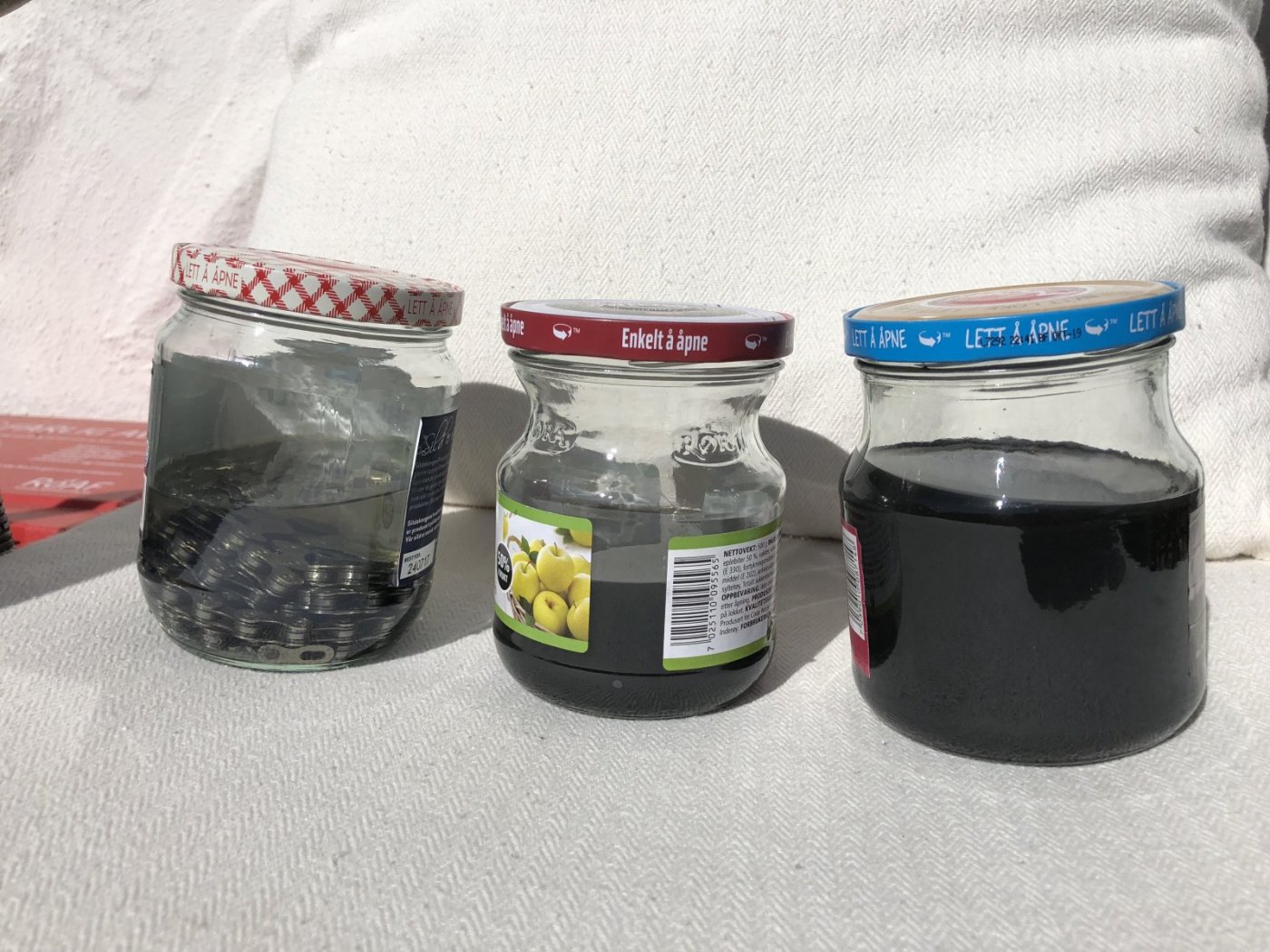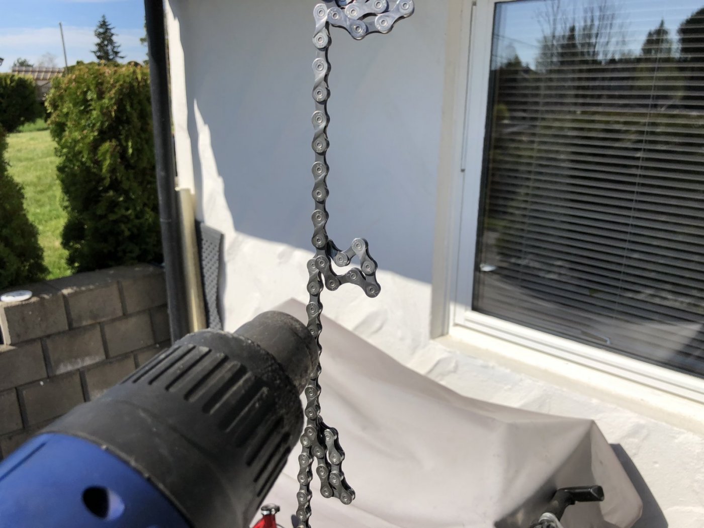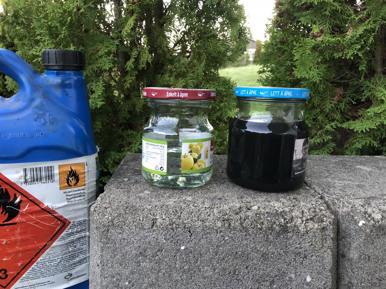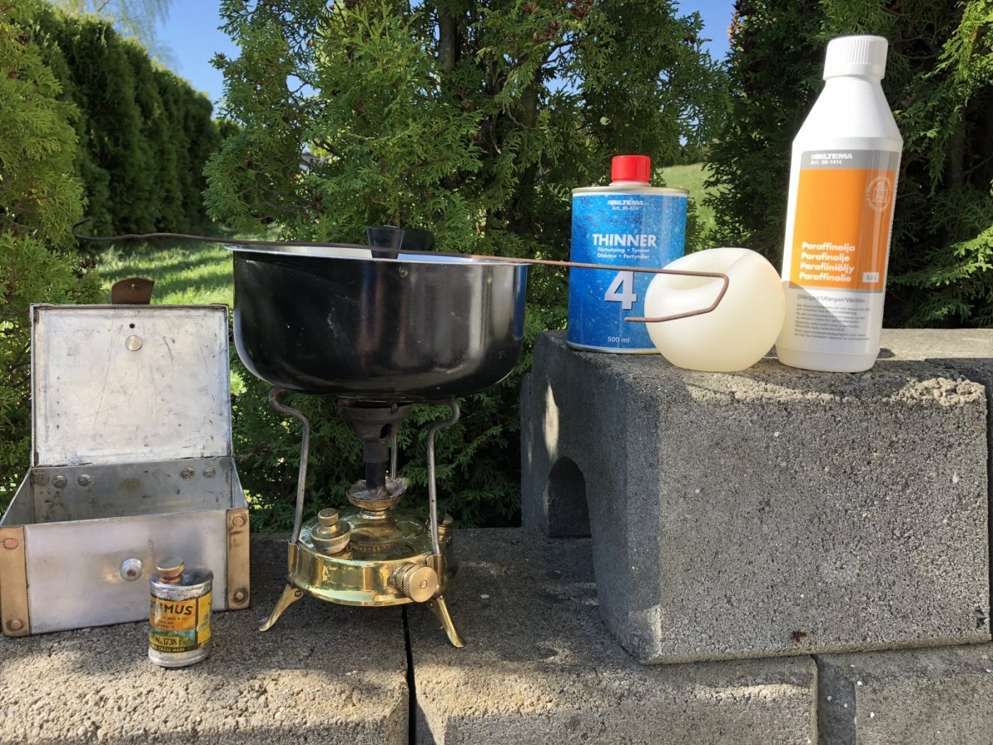 Fra olje til voks Jeg har i alle år oljet sykkelkjedet og det har fungert helt supert. Men innimellom hender det at kjedet gir utfordringer. Som at det kommer innenfor, eller utenfor største, eller minste drev, eller at det rett og slett ryker. Det å fikse problemet underveis resulterer alltid i møkkete hender. På langtur har jeg med engangshansker nettopp til dette formålet, men på dagsturer sjeldent. Hvor bra hadde det ikke vært om kjedet kunne fikses uten bruk av hansker? Jeg skal overhodet ikke ta æren for å være opphav til ideen om å vokse kjedet. Men i min søken etter en løsning på noe helt annet dukket dette snedige tipset opp. Selv om ikke jeg var klar over det har altså voksing av kjedet vært kjent lenge og man kan også få kjøpt et ferdig vokspreparat til en drøy penge. Så, hvor vanskelig kan det være? Og rett og slett lage det selv? Og igjen er nettet den rette plass for ideer og løsninger. Jeg deler inn prosjektet i 4. 1, Rengjøring 2, Produksjon 3, Vokse kjedet 4, Test Jeg startet i går. Men, bare for å ha nevnt det, det tar litt tid, første gang. Når kjedet først er vokset vil revoksing kun ta den tid det tar å få av kjedet og opp i voksbadet + tørk og påsetting. Og det skal etter sigende være atskillig lettere å holde et vokset kjede rent. Visst du som meg bruker ditt gamle kjede er rengjøringsprosessen, ikke arbeidskrevende, men tidkrevende. For å spare tid er det like greit å starte med nytt, rent kjede og hoppe rett til punkt 3. 1, Rengjøring: Ta dette på alvor. For et bra sluttresultat er rengjøring av kjede, krankdrev og kasset + løpehjul helt avgjørende. Begynn med å vaske sykkelen slik du pleier. Ta av kjedet og legg dette og eventuelt kjedelås i et glass med bensin. Rist litt på glasset en gang i blandt mens du fortsetter med resten Ta av bakhjulet og rengjør kassetten grundig. Jeg bruker lampeolje til skikkelig møkkajobber. Bruk sprayflaske, pensel, eller børste. Lampeolje er effektiv fettfjerner og du vil ikke vaske ut fettet i frikransen så pass på. Spyl av med hageslange, ikke høytrykk, mens du legger hjulet litt på skrå med kransen ned. Tørk av med med ei fille også mellom drevene. Løpehjul og krankdrev kan rengjøres der de er selv om det er lettere når det er demontert. Surr ei fille rundt en skrutrekker eller lignende og fjern alt av gammel oljesand og skitt. Dynk ei fille i lampeolje og rengjør mellom krankdrev og det samme med løpehjul. Spyl og tørk av så alt er som nytt. Visst du nå har sørget for rikelig tid til kaffe underveis er det nå kveld og da fyller du et nytt glass med bensin. Siden det nå er en times tid siden sist du ristet på glasset har mye møkk sunket og lagt seg på bunnen av glasset. Fisk opp kjedet og kjedelås uten å virvle opp for mye grums og senk kjedet i det nye bensinbadet. Rist det nye glasset noen ganger igjen før du setter det fra deg og fortsetter i morgen. Neste dag er det tid for ny risting. Rist 2-4 minutter på glasset og la det så stå i ro. Gjentas med ujevne mellomrom, mens du forbereder produksjonen av voks. 2, Produksjon av voks: Ikke gjør dette inne. Og vist du gjør det så bruk svak varme på plata. Dette er hva du trenger for å lage din egen voksblanding. F.eks. en gammel primus, en gammel kjele, en kniv, litt ståltråd, en fille og noen stumper stearinlys og litt parafinolje. ( Den blå kanna i midten på bildet, skal ikke brukes nå, da den er tenkt brukt for å lage voksblandingen du skal ha med deg på tur. Altså for ettersmøring av kjedet under veis.) Sjekk fargen på bensinglasset. Er bensinen på nytt blitt grå, eller svart fylles et nytt glass med bensin og du flytter kjedet over til dette glasset. Fyr opp primusen og legg stearinlysstumpene i kjelen. Etter en stund er stearinen smeltet og du kan fiske ut vekene. IKKE bruk for sterk varme. Når stearinen er flytende heller du i like mye parafinolje som det er stearin i kjelen, mens du rører med kniven. Som et greit utgangspunkt kan det altså være like mye stearin som parafinolje. Etter hvert kan du prøve deg fram med mer eller mindre til blandingen blir perfekt.. Rør så det er godt blandet og bruk knivbladet til å kontrollere blandingens konsistens. Løft kniven og la blandingen stivne på bladet. Den har rett konsistens når den lar seg smøre utover med fingeren. Ikke for hard og ikke for myk. Sjekk fargen på bensinglasset igjen. Bensinen skal være helt klar og er den ikke det, fylles et nytt glass og prosessen fortsetter til kjedet er fullstendig rent. 3, Voksing av kjedet: Ta kjedet ut av bensinbadet og bruk en varmepistol, eller hårtørker til å hurtigtørke kjedet. Dette for å unngå at rustprosessen starter og for ikke å bringe bensin over i voksbadet. Senk kjedet og eventuell lås ned i voksblandingen og rør kjedet litt fram og tilbake fra tid til annen. Det vil komme noen luftbobler nå, men disse er fra kjedet og skal ikke være fordi blandingen er i ferd med å koke. La det ligge og godgjøre seg fra 15 - 30 minutter mens du innimellom flytter kjedet litt rundt for å sikre at blandingen trenger inn over alt. Nå skal kjedet ut av badet. Finn fram ståltråden som du har bøyd til, slik at du kan få fisket opp kjedet. Det kan være varmt så bruk hansker og ha en ren fille klar. Her er temperaturen viktig. Er blandingen for varm vil for mye renne av kjedet før det stivner og kjedet vil da ikke være godt nok smurt. Er blandingen for kald får du en kjempejobb med å tørke av overskytende. Da er det bedre å fyre opp primusen og varme opp på nytt. Jeg prøvde litt fram og tilbake og det så ut til at drøye 50 grader i blandingen ga greit resultat. Få kjedet ut av badet og la det gli gjennom filla. Tørk godt av i hele kjedets lengde. Fram og tilbake flere ganger til det kjennes ut på samme måte som når du holder et stearinlys i hendene. Det skal være «tørt» og rent på utsiden. 4, Test: Monter kjedet tilbake på sykkelen. Noen kjeder er retningb