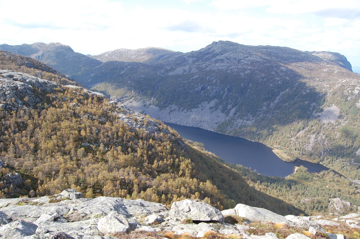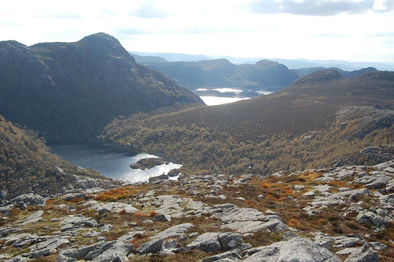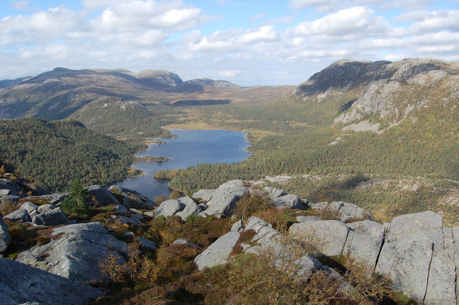 Kaare_70 Skrevet 26. september 2009 Skrevet 26. september 2009 Med godt høstvær meldt og barnepass organisert ble det endelig mulig å ta en fin langtur i Jørpelandsheia, som jeg har hatt i tankene i mange år. Dette er min barnoms- og ungdoms fjellhei, hvor grunnlaget for fjellgleden ble lagt. Det er en vakker hei i 400-800m høyde på nordsiden av Lysefjorden, med utallige topper og rike vassdrag. Det har i alle år vært kjempet både for og imot kraftutbygging, og det ser ut til at de kompromissene som er valgt, er levelige for begge parter. Jeg parkerte bilen ved Liarvatnet ovenfor Jørpeland og fikk transport forbi Bjørheimsbygd og Tysdalsvatnet til Målandsdalen, nærmere bestemt Boremyrå. Her går det skogsvei og senere god sti oppover langs Sagånå som kommer fra Målandsvatnet. Etter en liten time var jeg kommet over skoggrensa og fikk god utsikt nordover. Det var svært vakkert med begynnende høstfarger her oppe på snaue lyngheia, og veldig lettgått. Etter enda en halvtime kom jeg over toppen på Brogaheiå på ca. 600m og fikk nydelig utsikt nedover mot Longavatnet. Dette området knytter det seg atskillig kulturhistorie til. Det går kaldt nedover ryggen på meg når jeg tenker på Milorg-karene fra Strand som ofret så mye for å ta imot våpenslipp fra England i krigsårene. "Plane coming tonight to Langevann" var den korte beskjeden de fikk over radio, da de måtte vasse hit opp i snøen, lage landingsbane og sette opp markørlys. Den dag idag kan man se de rustne restene av slippcontainerene. Heldigvis kom det aldri til kamphandlinger i Strand, men to av ungdommene måtte bøte med livet i Tyskland. Nå var jeg kommet på kjente trakter, og den snart 100 år gamle vakkert oppmurte stemmen ved Vardhustjødnå/Longavatnet stod akkurat som sist. Før har jeg alltid kommet til Longavatnet fra Forenesvatnet, men denne gangen hadde jeg bestemt meg for å ta en nærmere kikk på Ospeskardet og derfor gå veien om Holmavatnet. Det var tydelig at de gamle stiene langs Longavatnet og opp mot Ospeskardet var lite brukt. Flere ganger fikk jeg god bruk for GPS for å finne stien. På veg mot Ospeskardet tok jeg en tur oppom Knausane (587moh), en liten men fin utsiktstopp. Så gikk det greit opp i Ospeskardet, med vakker utsikt både tilbake mot Longavatnet og ned mot Holmavatnet. I gode snøvintrer var det fra gammelt av vanlig å ta en ekstra rundtur gjennom Ospeskardet og ned på Longavatnet på ski, før returen om Forenesvatnet til Grimsli. Ved Holmavatnet traff jeg flere hyttefolk som syntes det var kjekt med turister. Jeg hadde opprinnelig tenkt å gå videre på østsiden av Holmavatnet og videre om Øyavatnet og Nagatjødnane, men ble rådet til heller å gå på vestsiden om Gudbrandsdalen fordi det var mye bedre sti. Jeg valgte å lytte til lokale eksperter selv om det ville bety at jeg gikk i kjent terreng. På veg opp Gudbrandsdalen tok jeg en avstikker oppom Liarknuten (647moh) og fikk nydelig utsikt over heia og ned i Grimsli. Etter en kort matbit gikk turen opp til brotet mot Småsildalen. Jeg var nå sånn passe kjørt og kunne ha tatt snarvegen ned Småsildalen til bilen ved Liarvatnet, men jeg hadde lyst til å komme opp på dagens tredje nye topp, nemlig Krossfjellet (716moh). Rundet derfor øst for Småsildalen og tok østover mot Krossfjellet på høyde med Botnafjellet. Det tok ikke lange stunden før jeg stod på toppen. Ikke all verdens spenstig, men nye vinkler på kjente fjell og vel verdt slitet. Nå stod den lange veien hjem om Nagaheia og Revafjellet for tur. Og den ble virkelig lang. Regner meg som ganske kondisjonssterk, men nå fikk jeg rett og slett antydning til krampe i begge lårmusklene. Var nok også litt omtåket og trøtt i hodet etter litt lite væskeinntak. Over Revafjellet gikk det derfor skremmende trått. Men til slutt kom jeg meg ned mot stemmen ved Svortingsvatnet hvor det var rekordlavt vannivå og brakkerigg pga. utbedringen av den nær 100 år gamle steinstemmen. Jeg fant stien ned på nordsida av Lågaliånå, som jeg aldri tidligere har gått. En artig snarveg til Revafjellet, som jeg skal benytte meg av neste gang. Sliten og kjempefornøyd ankom jeg Liarvatnet og bilen etter 23km, 1200hm og 7t 15min på tur. En kjempefin tur i vakkert Ryfylkelandskap som kan anbefales på det varmeste! Vis rapporten i Turkartet Vis større kart