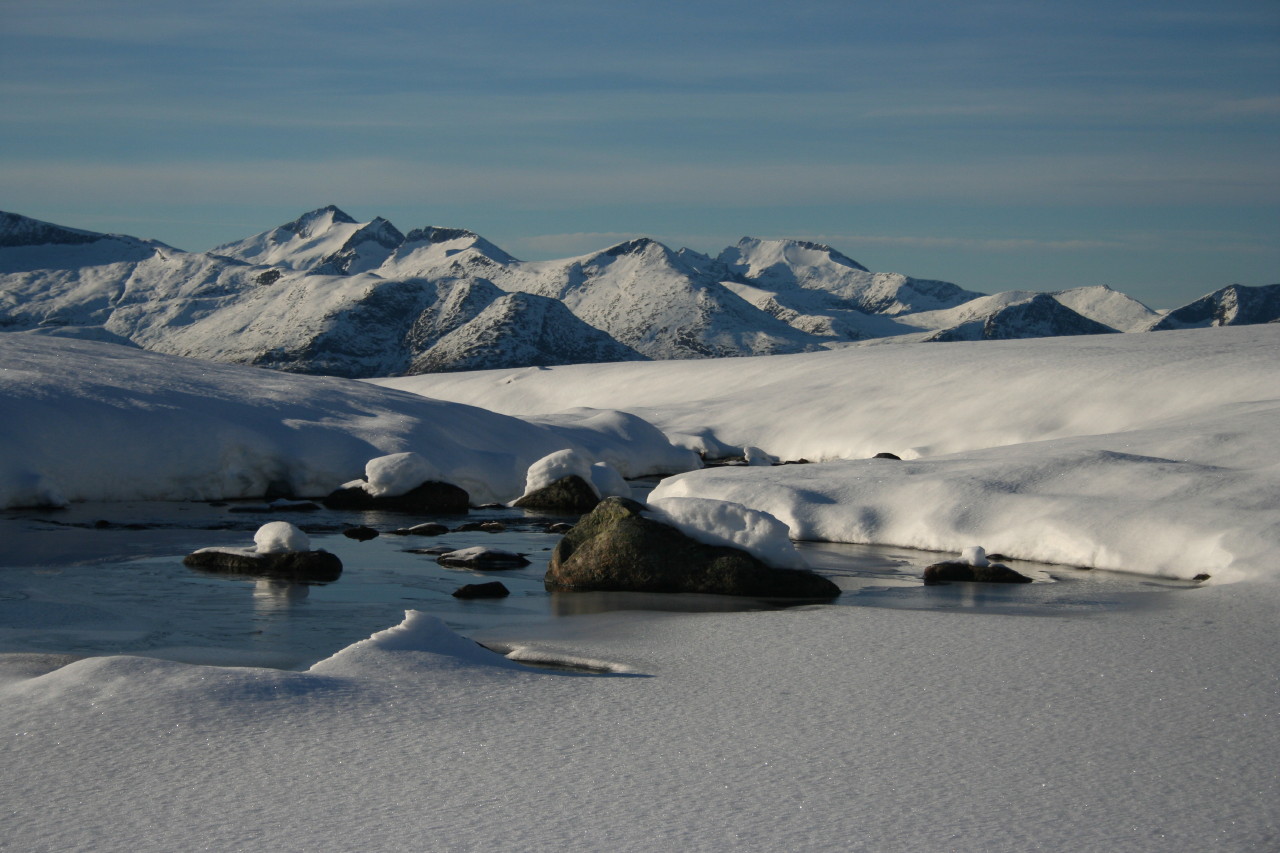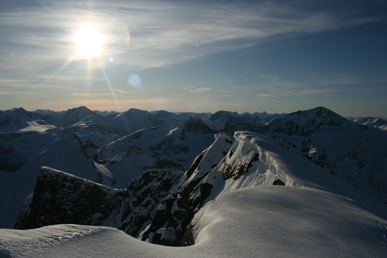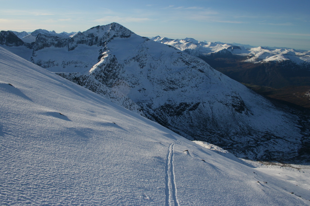 gi Skrevet 31. oktober 2009 Skrevet 31. oktober 2009 Lite nye turrapporter her for tida, så jeg bidrar med en til Avslutta årets fantastisk ski-oktober med en tur til den gamle vårklassikeren Ryssdalsnebba (1618), på grensa mellom Nesset og Sunndal, i går. Starten gikk fra Kanndalsetra (512), som en når med bil på setervei fra Eresfjord. Herifra var det skiføre, om en noe hardt. Etter fem minutter skibæring underveis oppe i lia, var det rikelig med snø innover mot Nordmørsskaret, som ligger på snaue 800 m. Fjellsida mot Gråfjellet og Ryssdalsnebba så både hard og isete ut, så jeg diskuterte litt med meg sjøl før jeg allikevel fortsatte oppover. Og hvilken opptur Før 900 meters-kota var passert møtte det fineste styrelag av fuktig/frossen nysnø meg. Til lett plystring la jeg kursen mot "Gråfjellenden", fjellryggens nordligste høydepunkt, som jeg ikke kunne huske å ha besøkt før. Her i 1100-meters høyde inntok jeg matpakka i varmende sol og helt vindstille. Deretter fortsatte turen på perfekt føre langs ryggen til toppen av Ryssdalsnebba. En storslagen utsikt over Nordmøre og Romsdals fjellverden møtte meg, og inntrykka blei sugd inn, mens jeg gjorde meg klar for drøye 1000 høydemeter nedfart. Takk for turen! Vis rapporten i Turkartet Vis større kart