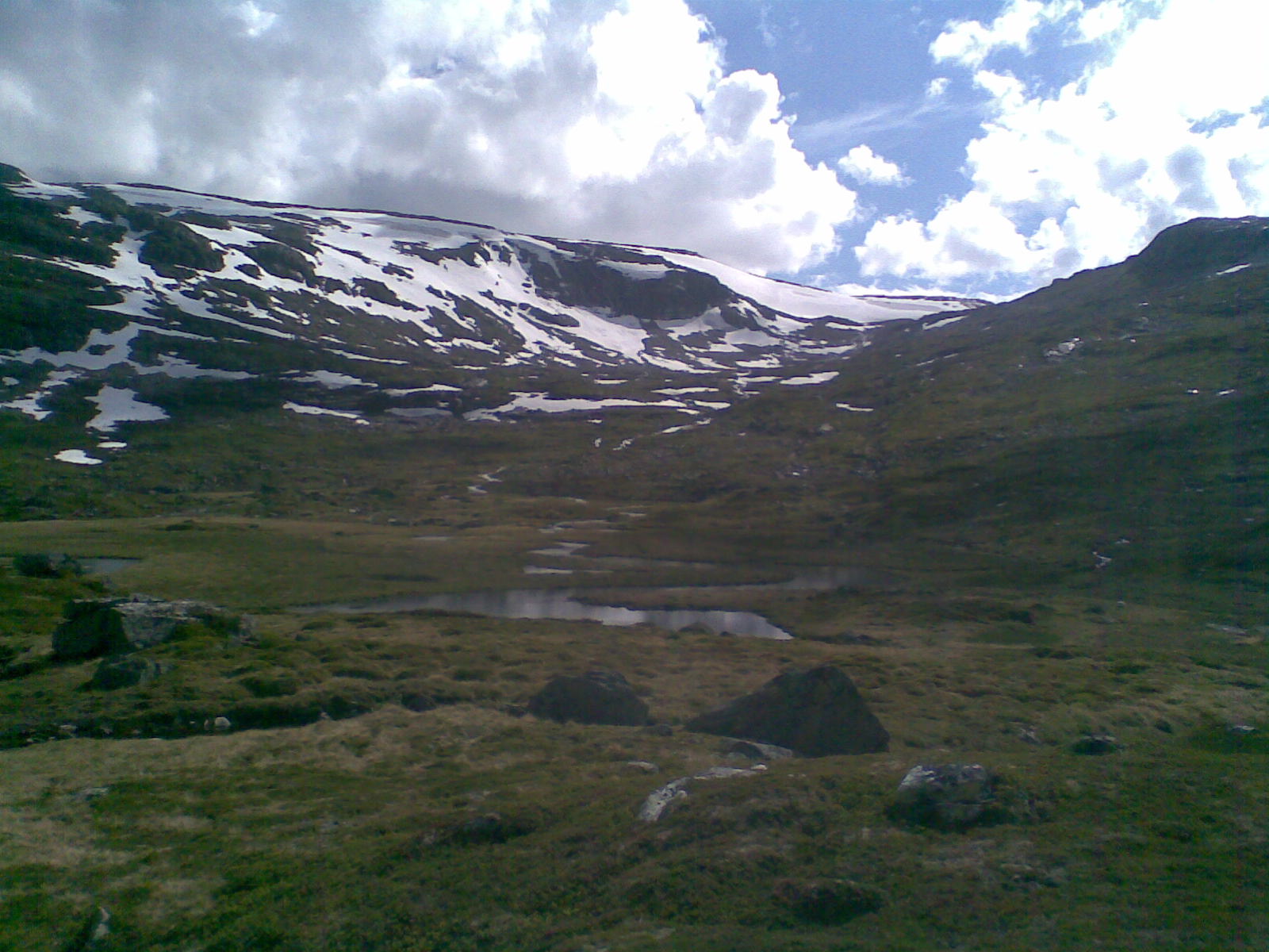 8. juli var det meldt brukbart vær, og siden kameraten også var fri fra alle plikter, bestemte vi oss for å gjøre alvor av turplanen fra forrige århundre. Fjorårets tur til Breifonn og Knoda hadde gjort oss sikre på at Blåbergdalen var det ideelle utgangspunktet for å nå Trollaskeinuten. Som tenkt, så gjort. Fra enden av anleggsveien fulgte vi høyre side av elva innover Blåbergdalen; mulig at venstre side hadde vært raskere, for vi ble bl.a. tvunget litt opp mot ruta til Breifonn pga. elva som kommer fra breresten der oppe. Men etter en kort vading, kom vi oss nå raskt og greit inn Blåbergdalen slik at vi kunne se ned til Indre Grubbedalstjørn. Vi gikk bratt ned til tjørna langs kraftledningen, og valgte å runde tjørna på sørsiden fordi det var korteste vei til toppen ifølge kartet.