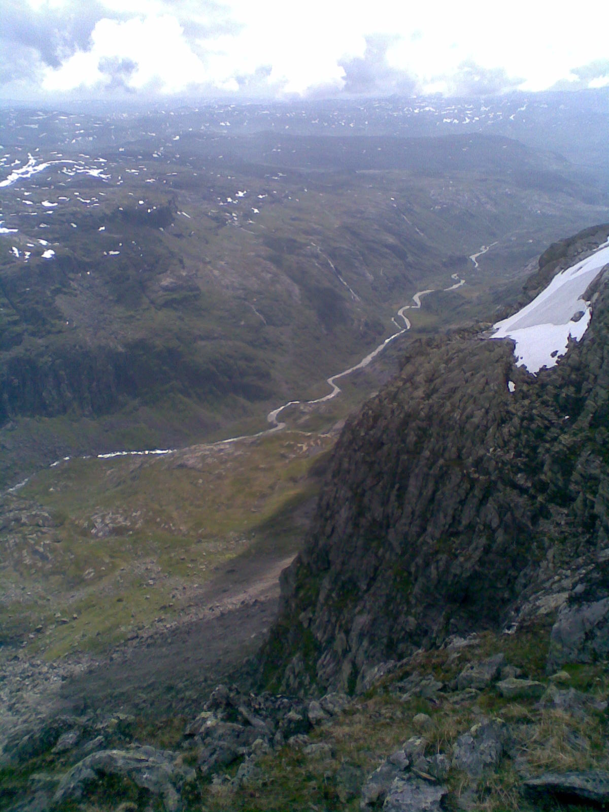 Det var svært interessant å endelig stå på Trollaskeinuten. Vi hadde full sikt bl.a. nordover mot Vassdalseggen og Kistenuten samt sørover, ned den vakre Kvanndalen. På sørsiden hadde vi bl.a. det dype skardet og Gråura på skulderen som følger vestsiden av den midtre tredjedelen av Kvanndalen. Pga. delvis dårlig sikt i nordvestlig retning droppet vi å returnere via Ikasteskardet og Ikastenuten, som også så vidt overstiger 1600moh. Vi returnerte derfor samme vei som vi kom opp.