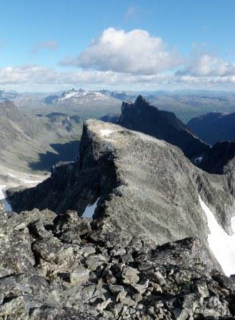 utejente Skrevet 14. august 2011 Skrevet 14. august 2011 Alarmen på mobilen gikk klokken 05.00 torsdag 11 august 2011. Da var det bare å åle seg inn i tøyet, stikke hodet ut av teltåpningen og se hva slags vær det var. Etter å ha kjørt fra Drammen på tirsdag og hatt kosetimer i biblioteket på Turtagrø på onsdag i påvente av bedre forhold, var vi nå superklare for å legge ut på eventyr. En rask frokost og et par kopper kaffe senere var det på med sekken og avmarsj klokken 05.47 i strålende sommervær. Vi skulle klatre Søre Dyrhaugstind fra Bandet. You heard me; Søre Dyrhaugstind fra Bandet! Som førstereisjente hva klatring i Hurrungane angår hadde jeg ikke noe særlig forhold til hva dette Bandet var for noe, men jeg gledet meg veldig til å komme dit! Første etappe var opp til Tindeklubhytta, hvor vi tok en liten fem-minutter med påfyll av Snickers og pågangsmot. Voldsomme omgivelser og godt overblikk over ryggen vi skulle traversere gjorde denne tekniske pausen nødvendig. Opp mot breen måtte jeg bite i det sure eplet og la Per ta tauet mitt og dermed bære begge tauene. Sånn er det bare. Store Skagastølstind tronet over oss ikledd nysnø og historie idet vi tok på stegjern for å krysse Skagastølsbreen. Når vi kom opp på Bandet kunne vi varme oss litt i solen og ta en lunsj mens vi lette etter bittesmå klatrere på ruta “vår”. Da vi ble forbigått av to taulag mens vi hadde pause meldte “kø-på-ruta-stresset” seg, og det ble bare så vidt tid til mat inn og mat ut før vi kløyv opp siste stykket til innsteget. Wow. Mektige inntrykk! Midtmaradalsryggen, Skagastølsryggen, lyden av noen småras her og der. Shit, må ha litt mer Snickers. Sånn er det bare. Per legger i vei og leder stødig opp første taulengde, så det tar ikke lang tid før det velkjente mønsteret trer frem; jeg gir ut en meter på gult tau og hører snart “selvforankring” gjalle ned fra første standplass. Så er det på med svasko for min del, det viser seg å være koseklatring på gode tak og man er i harmoni. Standplass på en fin hylle, plass til å ta av sekk og trange sko. Per leder også andre lengde, nå er vi i gang på alvor! På tredje standplass får jeg selskap av to sommerfugler og ser en fyr i silhuett på vei over Midtmaradalsryggen. Nice! Så er det stille i tauet lenge, hmmm, lurer på hva som skjer i den skarpe enden? Etter noen minutter roper Per at det var et litt vrient parti, men at han var over det nå. Oj, vrient for Sterken? Da får vi se i hvor god stil jeg selv kommer opp. Sliter litt alt i første risset etter standplassen, uvant å klatre med tung sekk og litt taudrag medfører ufrivillig slakk i tauet. Noen har måttet forlate en hex i risset, med en fin slynge i. Up, up and away, jeg griper grådig i slyngen og bruker den til å dra meg litt opp, nok til å få slengt et kne over kanten. Siden jeg alt har ødelagt stilen tyr jeg uten blygsel til en av kamkilene til Per på cruxet. Utpsyket og litt sliten ble en gul camalot en god venn. Planen var at jeg skulle ta sjarmøretappen og lede de to siste lengdene, men man har som kjent et standpunkt til man tar et nytt. Plan B ble iverksatt og unge Per ledet de to siste lengdene også. Sånn er det bare. Det ble seiersdans i ettermiddagssolen på toppen, for en utsikt! Et par knekkebrød med leverpostei ble tvunget ned og vi slappet av i solen en halvtimes tid. Klokken 16.30 begynte vi på eggen mot Midtre Dyrhaugstind. Ble luftig etter hvert så jeg ville inn i tau. Egentlig ville jeg helst hjem. Gikk og regnet ut hvor mye jeg ville få hvis jeg solgte alt klatreutstyret mitt. Kanskje nok til en gullfiskbolle jeg kunne sitte i sofaen og se på? Koselig og trygt a’gitt! Etter noen meter i tau og første sikring inne tødde jeg opp igjen og kunne nok en gang være et positivt innslag på tur. Stemningen var på topp, forholdene var på topp, glemt var nedpsyking og “teknisk” klatring på firer-tallet, FOR en flott dag i fjellet! Det var artig klyving, opp og ned. Noen ganger litt nedenfor eggen mot Ringsdalsiden, andre ganger opp på selve eggen, og vi gikk løpende mer eller mindre hele ryggen ut. Nesten litt vemodig når siste fortopp til Store Dyrhaugstind var nådd kl. 20.00. Vi sugde inn bilder av Ringstind og Austanbotntindane og Skagastølsryggen badet i varmt kveldslys, dette kommer vi til å huske lenge! Etter en liten pause var det bare å få sekken på ryggen og begynne nedstigningen til Turtagrø som lå langt der nede og guidet oss med lysene sine. Vi hadde los på tjernet på Øvre Dyrhaug da vi nå var tomme for vann. Det var overraskende langt ned til vannet og jeg måtte ty til et “oppkomme” for å slukke den verste tørsten. Midt i lemenåret. Men måtte skylle ned Snickersen. Sånn er det bare. I nærheten av Nedre Dyrhaug kom vi inn på rødmerket sti igjen, hurra! Mykt underlag for såre knær og føtter og i lyskjeglen fra hodelykten var verden nær og humøret godt. Dancing in the dark. Etter å ha krysset elva og kommet inn på stien vi hadde trådt på 17 timer tidligere måtte vi ha en liten pause igjen. To andre hodelykter kommer nedover stien fra Tindeklubhytten, og motivasjonen økte på igjen. Vi skravlet oss frem til teltplassen, og jeg tørnet i posen klokken 23.58. Prøvde å presse ned litt real turmat, favoritten Pasta Bolognese, og sov tungt og godt til halv ni neste morgen da jeg kunne stikke støle ben ut av teltet, kaste et blikk opp mot ryggen og tenke at den der gullfiskbollen får vente litt. Vis rapporten i Turkartet Vis større kart