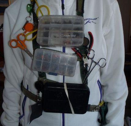 +Tom42 Skrevet 22. mars 2013 Forfatter Skrevet 22. mars 2013 Fluevesten var moden for utskiftning, men hadde jeg lyst på en ny? Og svaret var egentlig nei, så hvorfor ikke lage noe som var lettere, billigere og mer funksjonell! Idegrunnlaget bygget på en oppblåsbar redningsvest. Materialer: Lastestropper (Biltema eller en syforening) Silkebånd (Syforening) Borrelås til å sy på (Syforening) Borrelås med lim /Biltema) Pin on reel eller heiskortsnelle (Staples eller sportsfiskeforretning) Splittringer (Sportsfiskeforretning) Låsespenne (Syforretning) Arbeidsbeskrivelse 1. Ta lastebåndet rundt halsen og klipp av i midjehøyde. 2. Sy på silkebåndet «rundt halsen». Hindrer irritasjon av bar hud 3. Klipp til tre tverrbånd, og sy disse fast. Pass på at det øverste ikke kommer for høyt opp, slik at du ikke får «fluesmekken» over hodet. 4. Sy på bånd nederst. Se på en redningsvest. Fest en låsespenne. Sy også på borrelås om du ønsker å feste en fiskeveske ol til den. Bare borrelås gir dårlig feste, så forsterk med et par sikkerhetsnåler. 5. Sy på borrelåser (myk del) der hvor du vil feste flue eller slukbokser 6. Lim fast borrelås på fluebokser eller slukbokser 7. Sy fast splittinger til feste for PoR. Til saks, fortomretter (en bit sykkelslange) fortomskutter, avbitertang osv 8. Sy fast et strikk på håvskaftet. I enden av strikken knyt fast en liten karabinkrok. Den festes på en splittring foran på midjebeltet. 9. Sy deretter en snor fast relativt høyt oppe på høyre siden av halsen. Tre snoren inn i håvringen og knyt en enkel knute i øvre tverrbånd. Når du skal bruke håven, trekk i snoren og håven er fri til bruk Husk å svi alle ender. Lykke til. Nå har jeg prøvd den, og den funker. Og så mye lettere.
