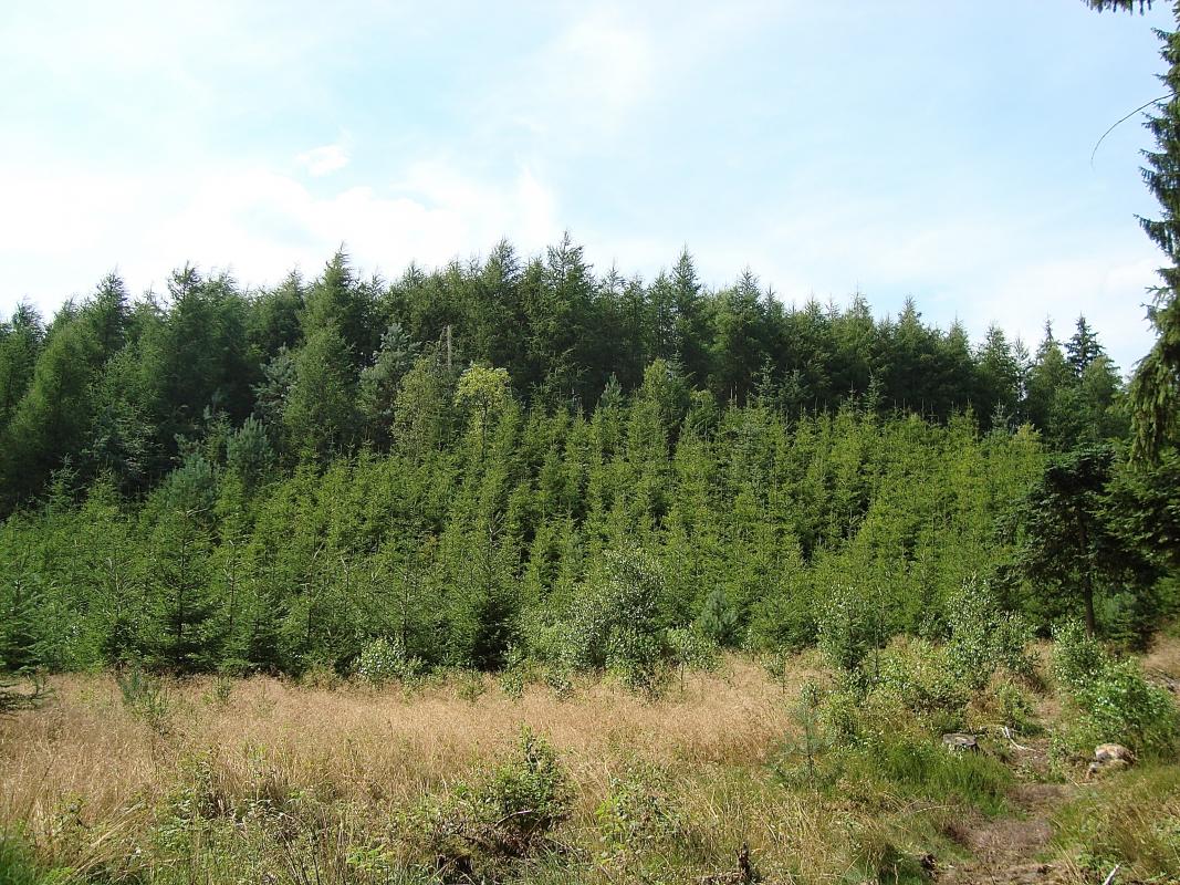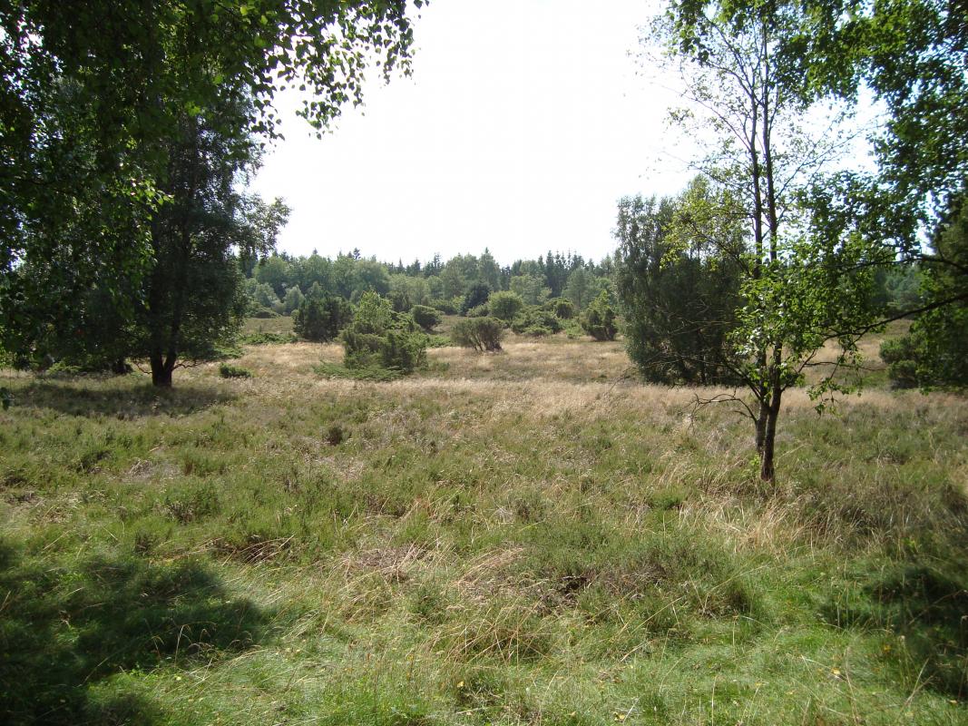 Turen ned igjen burde nok ha vært helt fin, men ca halvveis tilbake, så trodde jeg at jeg hadde bommet på en sti som tok av til venstre, dit vi skulle, så vi gikk på tvers av noe knott-infiserte heier hvor du ikke kunne ha munnen åpen uten å spise knott. Så etterhvert at stien jeg trodde jeg hadde bommet på var en kommunegrense. Skjønner ikke hvorfor de skal ha dem med på turkart, spesielt ikke i samme farge og nesten samme stippling som stiene. Ikke så lett å se på skjermen i strålende solskinn. Turen gikk deretter over en myr hvor vi sikkert krysset samme bekk 3-4 ganger før vi fulgte noen flere myrere opp til stien vi hadde kommet opp på. Bedre å gå i myr enn i bjørkekratt. Ble våt på føttene, men det spilte liten rolle ettersom svetten rant pga varmen.
