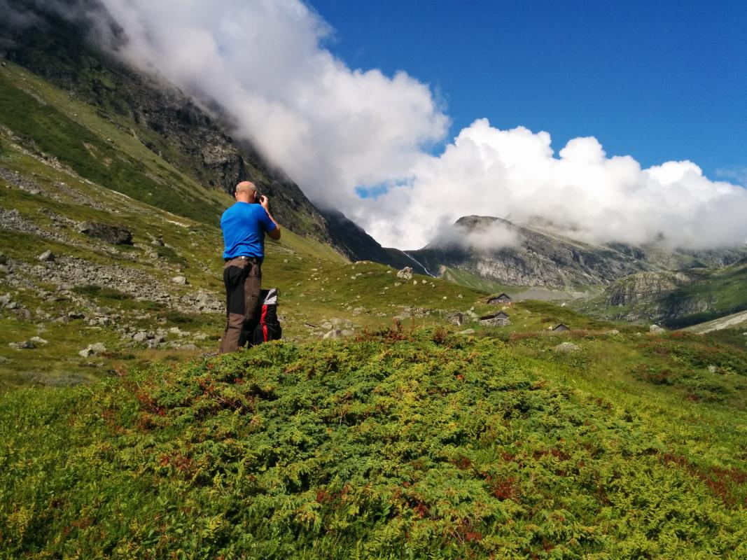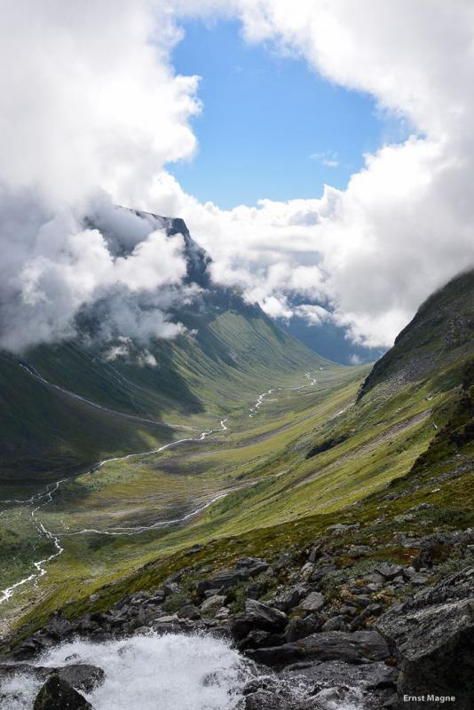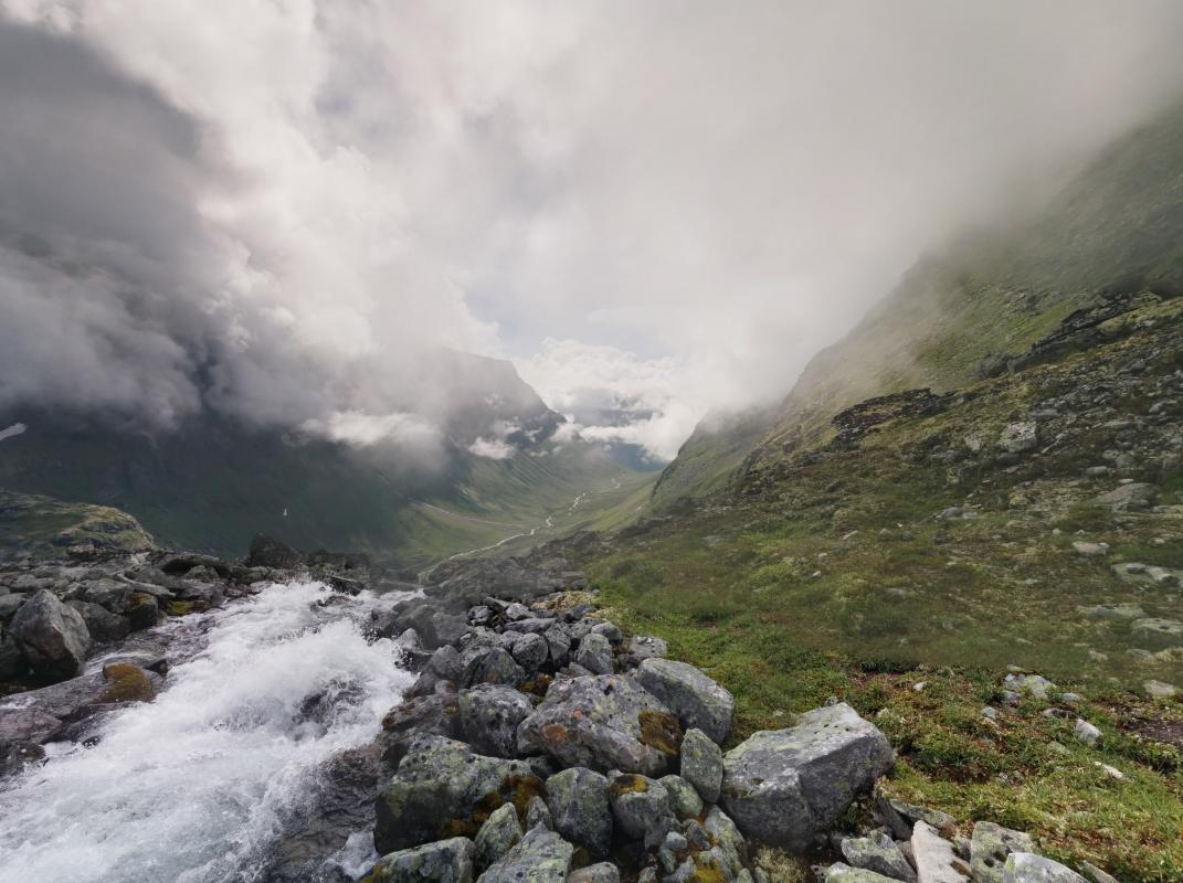 Det regnet litt da vi begynte, men værmeldingen og skydekket viste at det kom til å klarne opp og bli bedre. Etter å ha gått en stund kom vi ut av Storkaldhusdalen og over tåken: