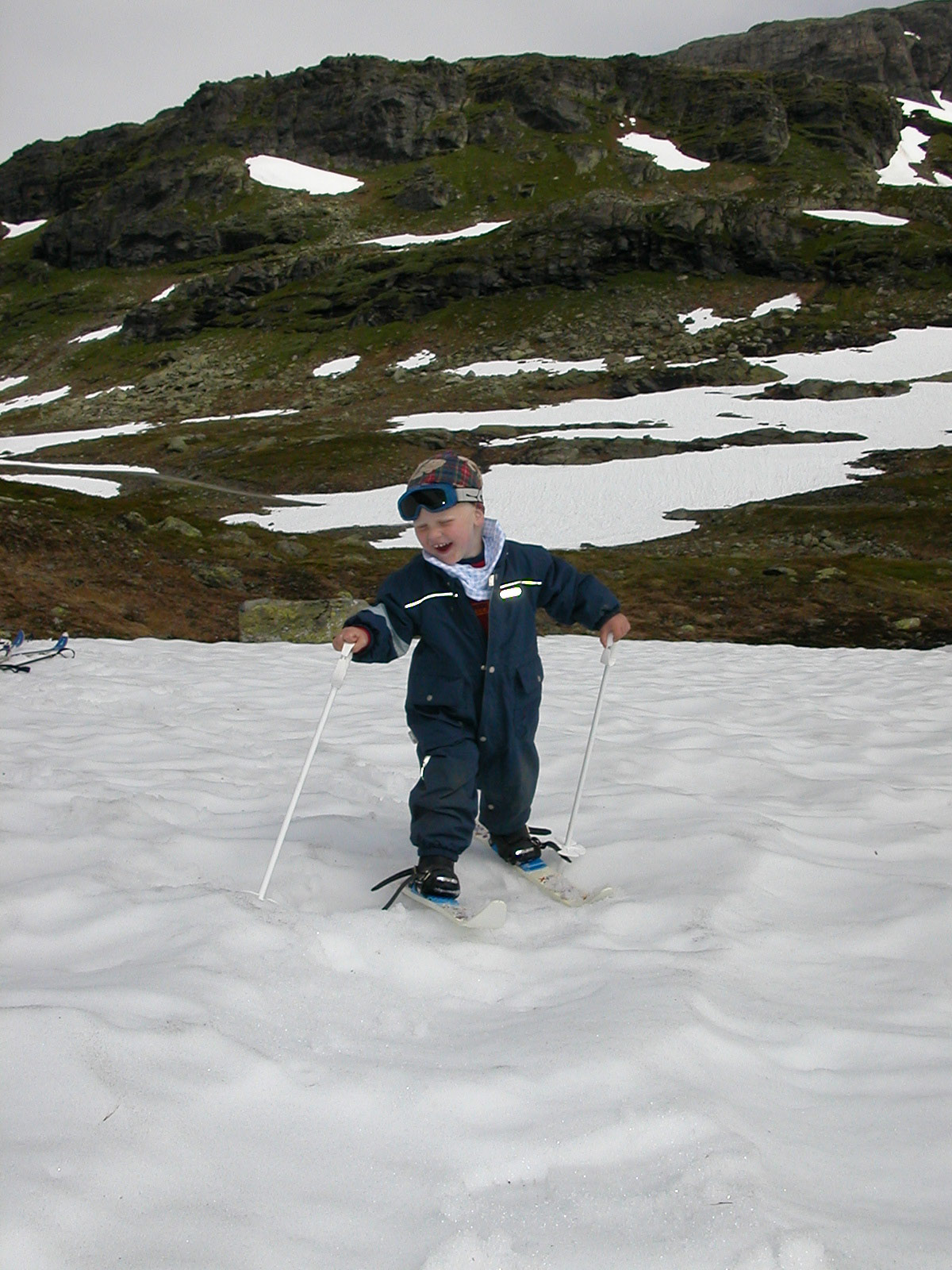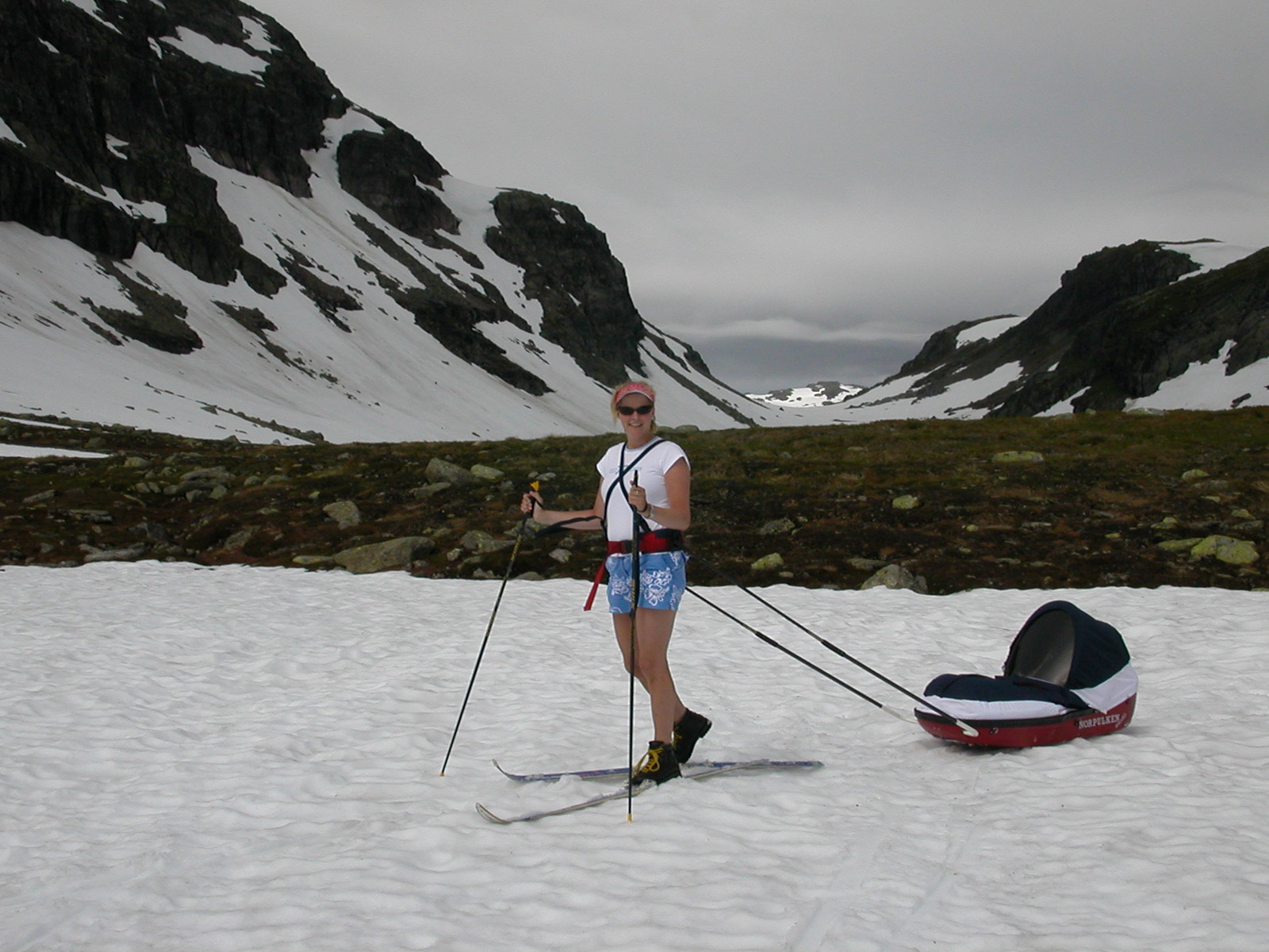 Pelle Skrevet 18. juli 2005 Skrevet 18. juli 2005 Etter tre uker i varmen (Frankrike og sørlandet) var det godt å komme hjem til mer normale temperaturer, regnvær og snøklatter på toppene. Det hadde ikke smeltet så mye snø, så kanskje det fortsatt var skiføre på Haukeli? Kone, barn (4 mnd og 2 år), 3 par ski, pulk, bæremeis og akebrett ble stuet inn i bilen, lykken er stasjonsvogn og skiboks! 5 mil hjemmefra, og ti runder med Kaptein Sabeltann-sangen var vi på gamleveien over Dyrskar. Anleggsveien inn til Middyr var sperret av en fonn etter 200 meter. Her startet neste runde i den logistiske utfordringen å ha med småbarn på tur: Mor flytter en sovende Vilde på 4 mnd over i pulken, mens Vetle hyler: "Min pulk, Vilde ikke ligge der!" Vetle bestikkes med rosiner og løfter om å kjøre fort på ski med han i bæremeisen. Etter 5 minutter er vi faktisk i gang, med ett sovende og ett smilende barn, gult klister under skiene(pluss litt på hender og staver). Som de fjellmennesker vi er, var vi anstendig antrukket i shorts, t-skjorte og ingen solkrem under 15 grader og flott sol. Våre ambisjoner var små i dag, vi håpet å kome noen hundre meter innover, før det var tid for pause pålagt av Vetle. Den gang ei! Gutten i meisen synes skilivet var lykke på jord, og det var gøy å se på høye fjell, sauer i solhellingen og fjellene som liknet på rare dyr. Verjesteinsnuten er for eksempel et Nesehorn! Hele 4 km kom vi, uten å ta av skiene en eneste gang, før Vetle synes det var tid for rosa saft og å kaste steiner i vannet. Her måtte han og prøve skiene, og det gikk over all forventning. Pappaen lærte at en gutt på 24 mnd er veldig mye bedre koordinert i føttene enn en på 20 mnd. Vi snudde nå, meget fornøyd over å ha kommet "langt inn i fjellet". Bonus til dere som har lest så langt: Videre innover mot Middyr er det så å si fullt snødekke, og muligheter for lange skiturer til godt inn i august. Tilbake igjen gikk det fortere, og Vetle hylte av glede i nedoverbakkene: "Pappa falle!" - Nei, da får vi så vondt! Oppsummering: 29 mil fra Oslo, 5 mil hjemmefra er det fortsatt masse fin bortoversnø. 8 km med to små barn er luksus! Noen steder vil du nok måtte ta av skiene om en ukes tid, men hva gjør vel det? Og, en ting til: Det er ikke noe som er bedre enn å ha en fornøyd to-åring i meis når man er i fjellet. Vis rapporten i Turkartet Vis større kart