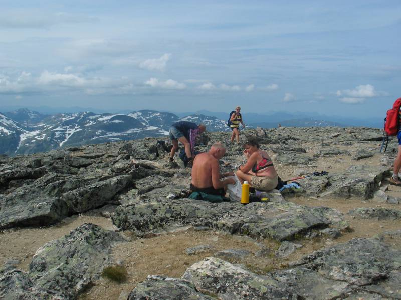 Og for å øke antallet ytterligere, prøver jeg et bilde til som sikkert mange drar kjensel på, ihvertfall bakgrunnen. :roll: På hvilken topp ligger Johan Kristian her og nyter sommeren?