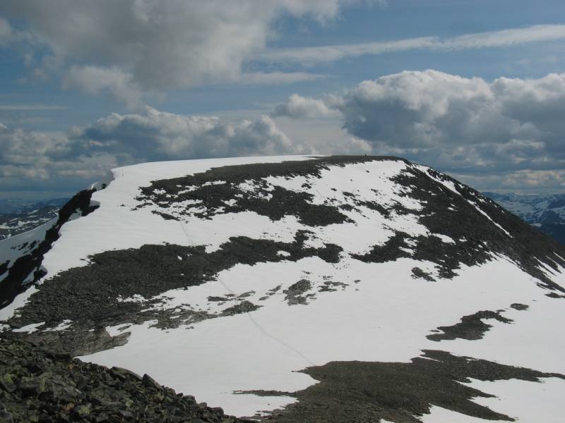 Vedlegger også til din info et bilde av Sørtoppen, tatt fra litt nedenfor stedet quiz-bildet ble fotografert. Jeg gikk forøvrig på samme turen over både Stortoppen/1755 og Sørtoppen/1688, tvers over skaret mellom disse. Gikk opp snørenna du ser på bildet nedenunder.