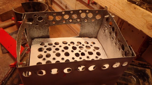 Populært innlegg +Tom42 Skrevet 11. juli 2014 Populært innlegg Skrevet 11. juli 2014 (endret) Mine tidligere bidrag i serien "Gjør det selv" - Utskilt fra Fiaskotur - lage spade - Solid feste for GPS - Utskilt fra Fiaskotur: - lage truger - Alternativ til fluevest - "fluesmekke" - Tommetrix - Fingerbøl" #################################################### Lett feltkjøkken 167 gram En kveld jeg var ferdig med å male og sto med et rimelig tomt 10 liters Drygolin malingsspann i lanken, fikk jeg en ide. Her har jeg et flott materiale til bla et feltkjøkken. For å slippe alt griseriet med å fjerne malingsrester hentet jeg litt ved og tente på, og snart brant det lystig, særlig da jeg la den på siden slik at mer luft kom til. Etter en halv time var et svartbrent spann klart til bearbeiding, og etter en omgang med blikk - og vanlig saks eller vinkelkutter, hadde jeg et stort stykke tynt og lett stål. Og akkurat dette blikket har en stor fordel fremfor både aluminium og metall i gassbokser til primuser, de tåler varme. Når de er brent eller glødet er de lettere å bearbeide - også med vanlig saks. Bilde nr 8. Ikke bruk metall som aluminium, eller gassboksen til høyre på bilde nr 8. Det er riktignok en stund siden jeg prøvde dette metallet, men det brant opp. Gassboksen til venstre og andre spraybokser duger, og selvfølgelig hermetikkbokser. ___________________________________ Utgangspunktet for ovnen var kaffekjelen med diameter 12,5 cm. Ovnens mål ble derfor: Endestykkene 11 x 11 cm. Langstykke1: 11 x 11 x 14. Langstykke 2: 11 x 11 x 13 Dette for at de skal passe i hverandre når de er demontert. Grunnen til at jeg har laget ovnen litt lengere er fordi jeg slipper å bryte ved så kort, og så blir det mer luft, og passer bedre til stekepanne. Pga vinkelknekken på 2 cm må lengdestykkene da være på hhv 18 og 17 cm. Arbeidsbeskrivelse: 1. Vha vinkel riss opp alle målene på platen og klipp ut. 2. For å knekke vinklene (2) cm bruker en metallplate se bilde nr 1. Den plasseres ca en cm utenfor arbeidsbordet slik at det blir lett å knekke blikket ved hjelp av (vha) en hammer. (Bilde nr 1) 3. Deretter riss opp et rutenett 1,5 x 1,5 cm for luftehullene. I utgangspunktet skal hullene være 10 mm i diameter, men det er lettere å bore først med et 6 mm bor. Deretter borer jeg opp med et 8 mm bor, snur blikket og hamrer gradene flate. Så borer jeg opp med et 10 mm og hamrer ut gradene igjen. Mellom de store hullene borer jeg ut 6 mm huller. Best resultat får jeg ved å bruke en søylebormaskin, men en drill holder i massevis. Tilslutt klipp alle hjørner og la dem få en omgang med filen På bilde nr 2 vises ovnen ferdig. i frontendestykke borer jeg først hull slik at det blir lettere å klippe åpning til ved ilegget. Deretter klipper jeg nedenfra et hull for trekkens skyld, men sparer en kant for stabilitetens skyld. Avstanden opp til brenneristen er ca 4 cm. I lufterommet legger jeg også fuktig ved til tørk. 4. For å holde det hele sammen bruker jeg 8 stk 3,5 mm plateskruer. Bruk litt lange skruer 19 mm lange. Da blir de litt letter å finne igjen om du mister dem på bakken.. For å slippe å skru med en skrutrekker, sager jeg av hodene med baufil og tar vekk gradene vha en fil. Så skrur jeg fast en 3 mm vingemutter i skrustikka (bilde nr 3) og gløder den med en gassbrenner slik at diameteren utvides. Slår så inn skruen og lar alt avkjøles. Skruen sitter da helt fast. Bruk en fil til å forme spissen igjen. Fordelen med vingemutterene er at det er lettere å skru med valne fingre, og at de er lettere å finne igjen. Orange fargen jeg har brukt er kun for fotoets skyld. Fargen blir borte ved bruk. Når du skal bore opp hull til skruene, hold stykkene godt sammen og bor et 2,5 mm hull gjennom "knekken på langsidene og front og endestykke. Bor så opp hullene i "knekken" (de utvendige hullene) med et 4mm bor. Slik at det blir lettere å skru dem sammen. 5. Tilslutt lager jeg en åpning på en av langsidene for å kunne legge ved også på tvers. 6. Bilde nr 4. Og helt til slutt mål ut brenneplaten og bor "1000" hull i den. 7. Så er turen kommet til prøvebrenning med og uten kjele. Og har du laget nok luftehull brenner den bra - også når kjelen står på. (Bilde 5 0g 6) 7. Bilde 7 viser ovnen demontert. Da skjønner du letter hvorfor en av langsidene må være litt kortere. Igjen husk: At alle skarpe kanter har fått en omgang med fil. ________________________ Ps. Ett biprodukt. Flammesprederene kan være lett å miste om du ikke har sikret dem med en ring. Blikket som er brukt til ovnen er også lett å forme til reservespredere. Kjekt å ha------- Endret 15. juli 2014 av torø 10