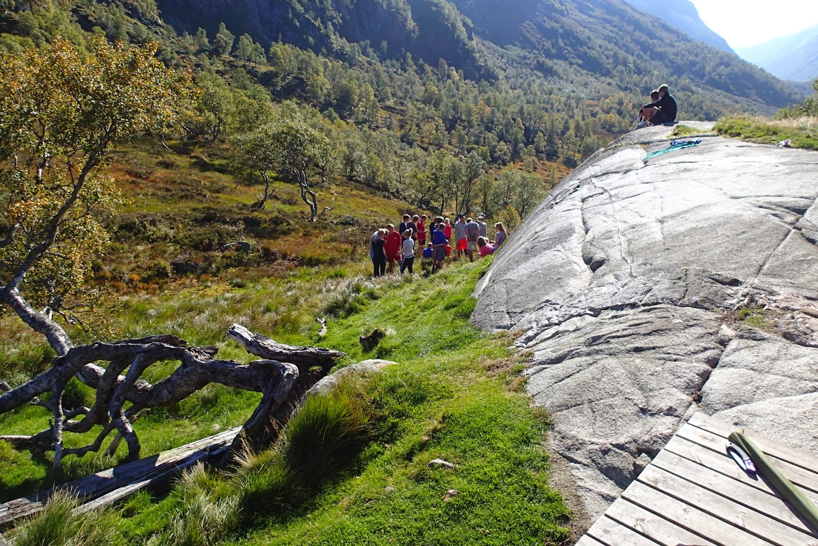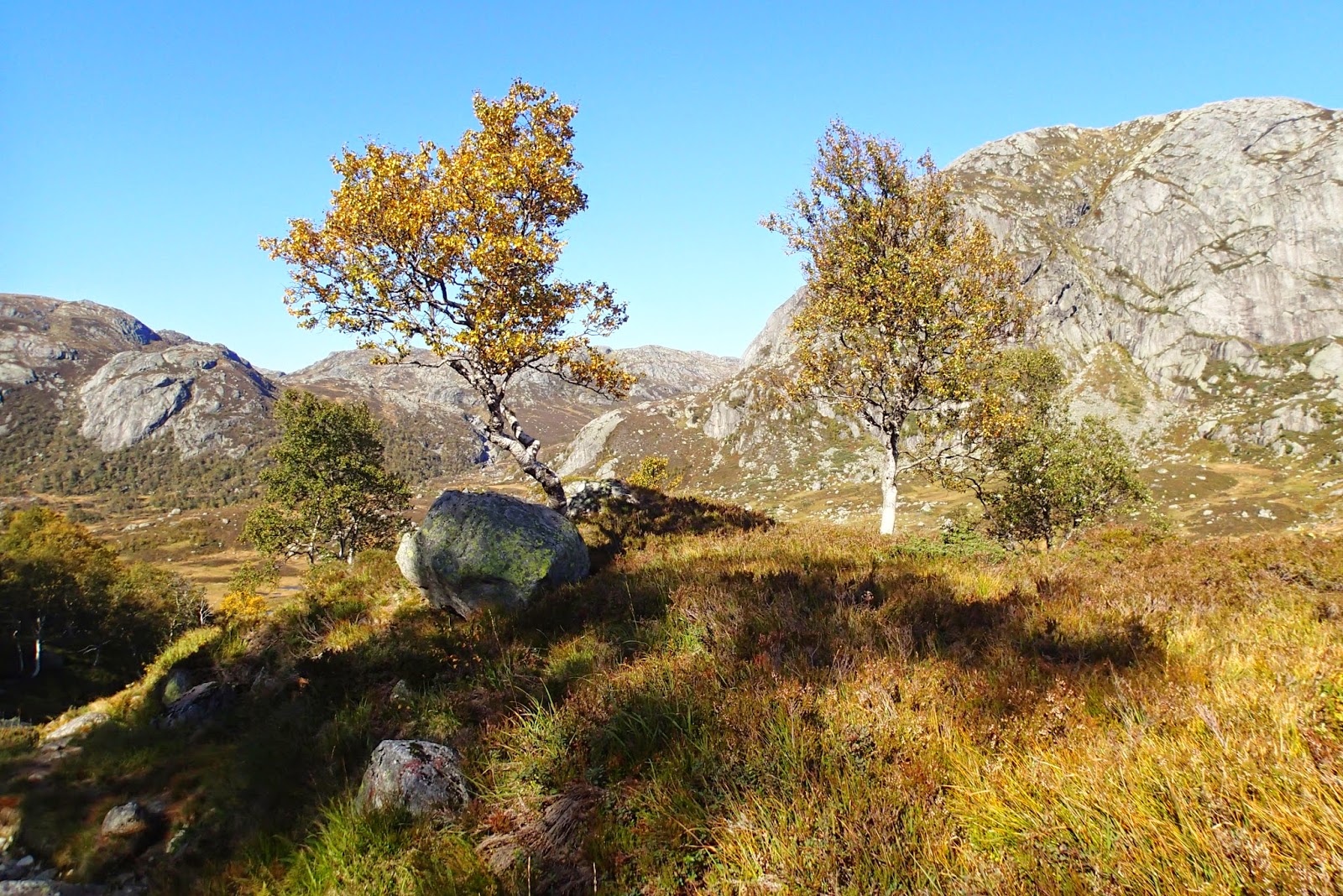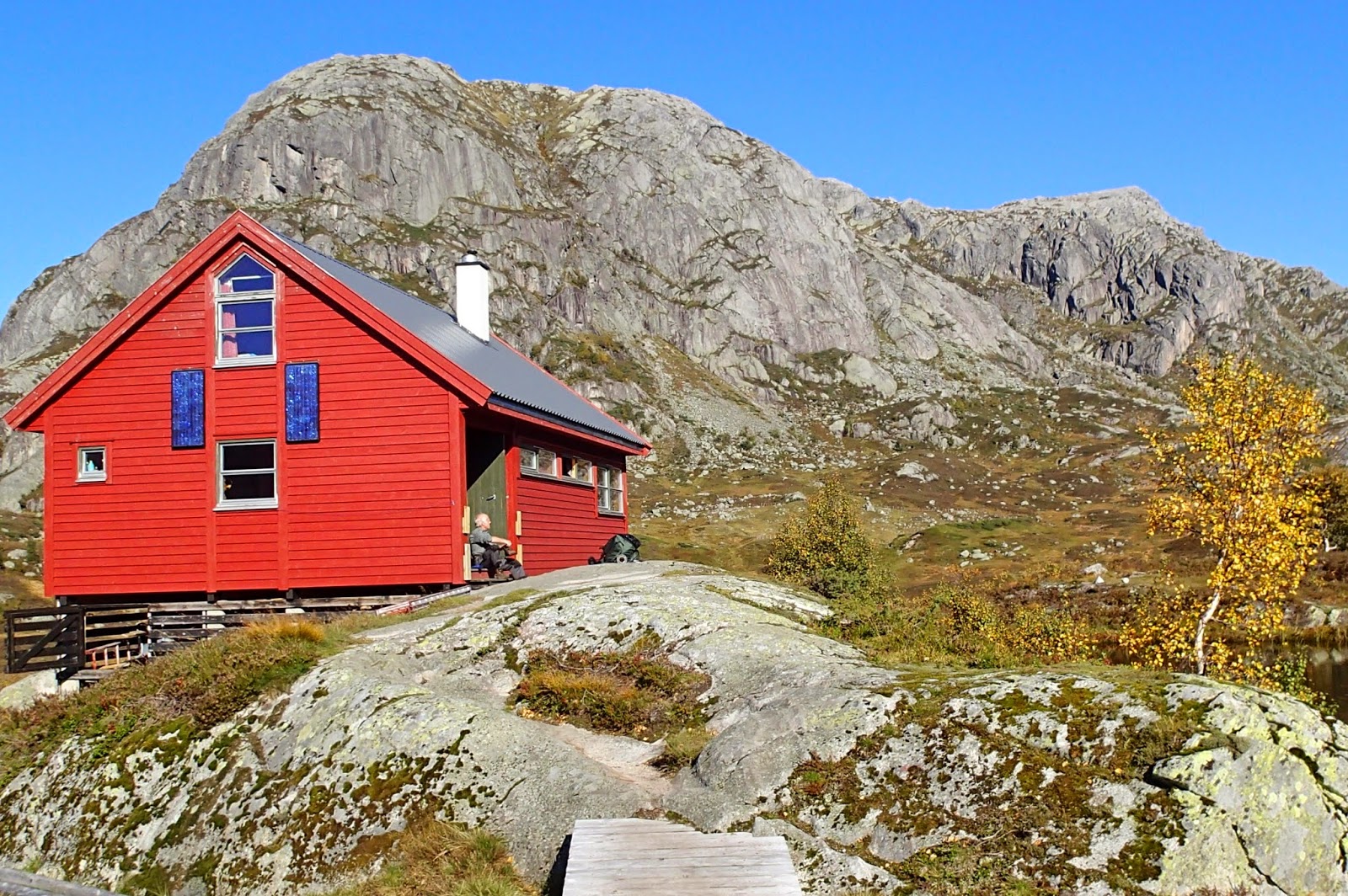 REJOHN Skrevet 21. september 2014 Skrevet 21. september 2014 Gamle folk på bratte tak. Avtalen var at Egil skulle ta kontakt når han var klar for en tur til Blåfjellenden.Planen var å få til noe mer permanent på taket. Tak som lekker er ikke kjekt. Tirsdag ringte telefonen. Om det var mulig å ta turen denne uka? En liten titt ut vinduet på jobben, og litt fikling med YR.no ga kjapt svaret. Skulle det bli tur denne høsten, burde det bli nå. Vi avtalen å gå innover onsdag med retur torsdag. En lite "egenmelding" på jobb ordnet fri. Onsdagsmorgen hentet jeg Egil, og vi handlet inn nødvendig verktøy og proviant for turen, før kursen ble satt opp i heia. Det er vel unødvendig å si at været var det aller beste. Varmt, sol og lite vind. Det var nærmest sommer i sola i le for trekken. Heia viste seg fra sin beste side. Så sent på året er det bare å bukke og takke når naturen slår til på den måten. Det var et tydelig høstpreg. Bakken er brun og gul. Bjørka begynner å bli gul. Bladene dekker stien under trærene. Sist men ikke minst det er ikke sau. Det er alt 14 dager siden de ble sanket. Det som muligens er den største forskjellen i forhold til midt på sommeren, er fuglene. Så sent på året er det ikke mange småfugler igjen i heia, og det er heller skjelden vi hører fuglelyder. Vi pleier å skremme opp noen rypeflokker, men de siste årene har det vært dårlig. Den hese skrikingen til en ravn er den eneste lyden som virkelig høres over heia. Det kom i mot en hel skoleklasse som hadde overnattet på hytta. De kunne fortelle at det også var en klasse på vei innover. Vi ville ikke bli alene på hytta. Med over 30 på hytta, ville det bli vanskelig å få lakket gulv. Vi fikk finne på noe annet i tillegg til takene som måtte fikses. Det er alltid noe som kan ordnes eller gjøres bedre på hytta. Inne på hyttene rådet litt kaos. 30 elever har utrolig mange sekker sko og andre ting. Som blir lagt på første tilgjengelig sted. Det er ikke noe problem, bare de finner fram selv. Vi måtte foreta en liten om rokkering før alle hadde fått sengeplass. Vi inn på rom og elever opp på hemsen. Hardt og brutalt. Egil fikk ordnet det meste på både annekstaket og på uthustaket. Om det holder vil tiden vise.Vi fikk gjort en hel del annet arbeid. Alle lemmene som kom inn i vinter ligger nå på plass. Egil har jobbet omtrent fulltid dugnad for turistforeningen siden han ble pensjonist. Og nå er han over 70 - still going strong.. Og vi hadde det selvsagt ikke travelt om morgenen torsdag. Det ble jobbet noen timer før vi pakket og tok ut. Ungdommen skulle ned Fidjadalen. Første stopp ville være enten ved Stølavik eller under Månastølen, på min spesielle teltplass. Og ungdommen var ikke klar over hvor heldig de i grunnen var. Været var det aller beste. Det kunne ha vært 2 grader vind og regn. Været så ikke ut til å bekymre noen, og det var det heller ingen grunn for. Vi fikk en grei tur over heia mot Hunnedalen, men med en stopp i toppen av bakken for å jobbe litt. Ved Saftbekken satt en ny klasse. De var ikke på vei mot hytta, men var på lavotur. Og hadde en natt til ute før turen var slutt. Utrolig heldige med været, de og. Vis hele artikkelen slik den er på hjemmesiden