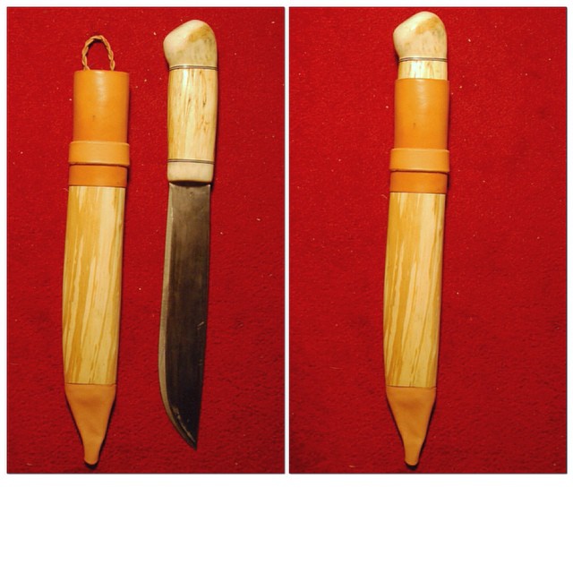Gjest Skrevet 13. mai 2015 Skrevet 13. mai 2015 Blad: Ukjent opprinnelse (kjøpt på Finn) Skaft: Syrnet bjørk fra egen hage, reinsdyrhorn, vulkanfiber Slire: bjørk, skinn