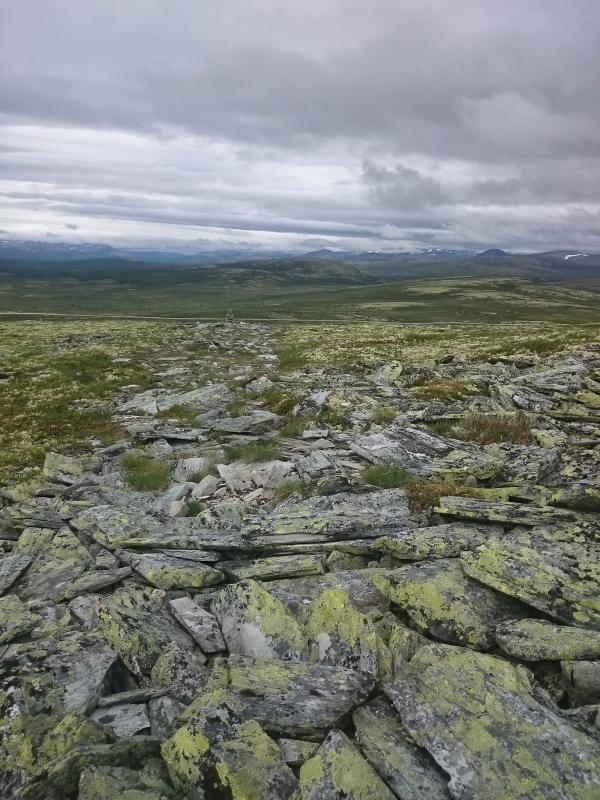 Lar5 Skrevet 4. august 2015 Forfatter Skrevet 4. august 2015 Morran etter var det klarvær, eller i alle fall såpass høyt skydekke så jeg kunne se ei stripe snødekt fjell inn i jotunheimen, antar jeg det var i alle fall.. Det blåste og kom tidvise regnskurer, mens tåka kom og gikk. Men i og med at det var godt med mobil signaler så jeg fort på værmelding at det skulle lette litt utpå dagen. Gikk i veien litt utpå. Ikke noe godt vær, stilongs på.. Møtte på vei ned jammerdals høgda et eldre ektepar. God dag-morn ble utvekslet før de bøyde seg mot vinden og stavet seg videre oppover ura.. I joggesko, jeans/piratbukser og noen tilårskomne anoraker. Gubben så målbevist ut, kjerringa så lei ut Antar de skulle opp til flyvraket på øverlihøgda. ellers er vel det som sitter igjen etter denne etappen at -stien går der den gjør av en grunn.. Rundt myra, langs bekken og slakeste veien opp til toppen.. Hengebruer var fint, en bru var borte, ca 5 meter vading over en litt for stor bekk.. Og nest siste akt var en myr som var 2 km lang og kjempe bløt.. Siste akt er og gå og se hytta i 2.5km mens man går rundt ei myr hehe:) Og som en ser på bilde 2 så er det hardt kantete underlag som går igjen