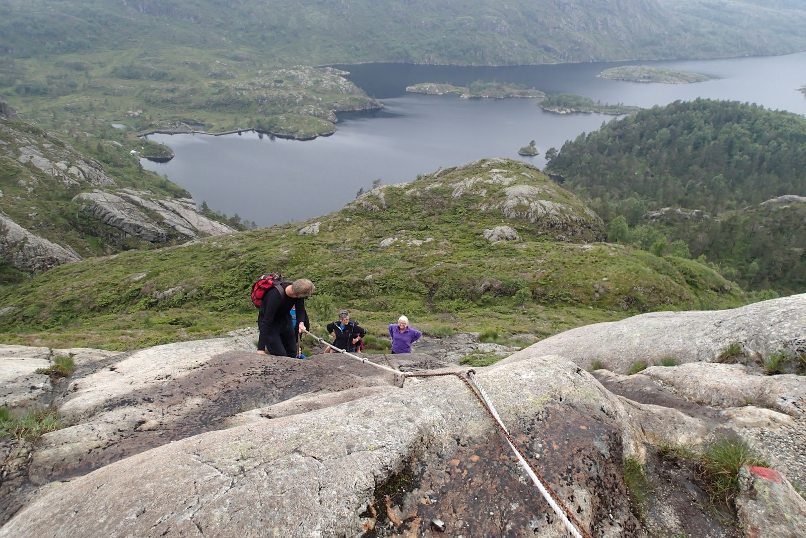 REJOHN Skrevet 13. juli 2015 Skrevet 13. juli 2015 Bratt søndagstur med flott følge. Med en achilles i ulage, og beskjed fra legen om at slike ting tar tid – 6 måneder eller mer, ville det være på sin plass med en rolig helg etter tur torsdag/fredag. En hyttetur i Tysvær, og en rolig søndagstur, ville kunne være greit. Min svigerinne er velsignet med mange kjekke turinteresserte søsken. Og de har en årlig tur til topper på Stord, sammen med ektefeller. Årets tur gikk av stabelen denne helga. Og det ville være mulig å henge seg på for oss. «Oss» i denne forbindelse var bestyrerinnen og meg. Årets turmål var «Stovegolvet». Riktignok var toppen 704 moh og turen ble beskrevet som «bratt». Det var hengt ut tau og kjetting enkelte plasser, men det har vi jo vært borte i andre plasser. Det burde gå greit…. 7,5 kilometer – 3-4 timer. Hmm Søndags morgen var det en optimistisk gjeng som samlet seg. Værmeldingen var ikke den beste, men det så da ikke så galt ut, eller hva. Det startet oppover, ganske bratt. Og fortsatte oppover, brattere, før det ble skikkelig bratt. Vi måtte ta i bruk tau som var lagt ut, og det ble klatring enkelte plasser. For egen del (jeg sliter litt i høyden) var det et godt stykke utenfor komfortsonen. I hvert fall en del plasser. Det gikk bedre etter hvert. Jeg fant jo ut at fjell ikke lett gir etter, og at det faktisk er forholdsvis greit å holde fast med nevene mens føttene finner nytt feste. Jeg blir aldri noen fjellklatrer, men muligens mindre nervøs for enkle klatrepartier. Jeg må innrømme at jeg ikke fulgte så godt med på hvordan andre taklet de bratte partiene på vei oppover. Jeg hadde så avgjort nok med meg selv. Alle kom greit opp ingen skader, men tungt var det. Det ble en del pusting og pesing oppover – minst 500 høydemeter bratt opp. Øverst skrev vi oss inn i protokollen og fortsatte bort til selve Stovegolvet, som var flatt som et… Det ble surt etter hvert. Tåka og regnskodde kom sigende. Sikten ble heller dårlig. På toppen så vi ikke stort. Stord Fitjar Turlag har innredet en gammel trafostasjon nesten på toppen. Her var det sitteplasser og ovn – med fyr. En skikkelig fin plass å ha pause – med drittvær på utsiden. Det var ikke så veldig god plass, men vi fikk da klemt oss inn. En hyggelig pause med kaffe og prat. Før det igjen bar ut i regn og tåke. Nedturen ble – nedtur. Jeg er sikker på at både utsikt og natur er mer enn bra, men det fikk vi ikke sett. Tåka var for tett og regnet gjorde at hetta var på nesten hele tiden nedover. Og nedover bar det. En lang li, uten noen egentlige bratte partier, men med sleipe steiner og vått grass, så det måtte gås forsiktig. For egen del gikk det greit å få sorpa av buksesbaken. Det er ikke ofte jeg har gått nedover en sammenhengende li så lenge, men vi kom da ned. Våte og fornøyd. Både med at vi endelig var ned, og med turen. Selv om det var bratt oppover, og regn og langt nedover, så fikk vi en opplevelse. Og de skal vi jo ta vare på. Takk for turen. Vis hele artikkelen slik den er på hjemmesiden 3 Siter