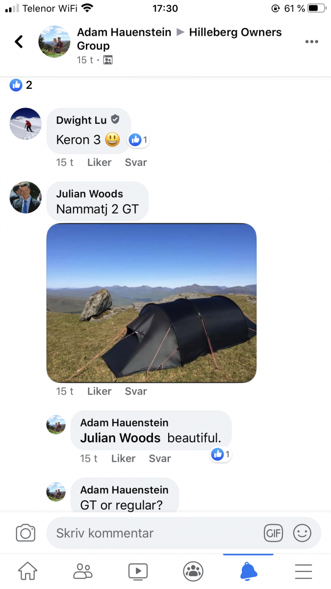 Keron 4 GT har jeg i rødt. Er ikke helt overbevist om den fargen. Føler det blir litt mye, iallfall på et så stort telt.  Går kanskje litt mot strømmen der men det vises iallfall godt. Vet ikke hvordan den fargen tar seg ut om sommeren, da jeg bare har brukt det på vinter.