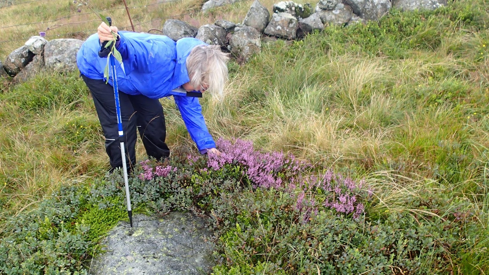 REJOHN Skrevet 31. juli 2016 Skrevet 31. juli 2016 Med bestyrerinnen på søndagstur. Det er forbasket. Ikke bare en fot, men nå begge bakbeina med achillesproblemer. Det ga en av minst tre gode grunner for en søndagstur på høgjæren.Det var også andre grunner: Det skulle regne omtrent hele dagen, og bestyrerinnen ville være med. Det siste er et veldig godt argument for å legge turen ikke for langt opp i heia og ikke la det bli for mange timer underveis. Men jeg savner en langtur, og hadde egentlig tatt sikte på en tur inn til Sandvatn og tilbake. Det ble hurtig bestemt at dagens tur ville gå på høgjæren – en rundtur fra Holmavatn til Synesvarden videre mot Steinkjerringå og tilbake til bilen. Antakelig en to timers tur. Spørsmålet var om høyre bakfot ville oppføre seg, under turen – og hvor mye regn vi ville få ned over våre syndige hoder… Regn ble det. Fra start en blanding av skikkelig regn og lett regn, men så pass at hetta måtte være på. Fra Synesvarden og nedover mot Steinkjerringå ble det adskillig bedre – til og med litt sol, som YR ikke hadde meldt. Kan vi klage på det? Tilbake mot Holmavatn fikk vi på ny regn, sikkert bare for å få vasket sorpa av buksa. Planen var å spise middag på Kalsbua på vei hjem. Det er greit å være, i det minste litt presentabel i selskap med andre. Turen på høgjæren er fin, uansett vær. Det er høy himmel og vidt utsyn. Havet ligger som en blå flate ute i horisonten mot sør og vest. Fjell og hei ligger som en mur mot nord og øst. Landskapet er selvsagt skapt av isen. Dødishauger og eskere er vanlige. Men ingen kan si at landskapet er frodig. Vi fant likevel blomster og planter til hjemmebruk. Lyngen – røsslyngen, sto i blomst og lyste opp bortetter liene. Oppe i høyden fant vi mengder av Blåknapp og det sto en enslig gullris og pyntet opp en plass. Bestyrerinnen var på plass og fikk med seg av overfloden - både blåknapp og røsslyng. Det var ikke mange andre på tur denne søndagen. Vi traff folk, men til å begynne med var vi temmelig alene. Det ble til at vi tok en liten prat med de vi tross alt støtte på. Vi viste hvor «kjerringå» var til en familie vi traff på toppen av Synesvarden, og måtte også vise vei til «kjerringå» da et eldre ektepar spurte om veien. Antakelig hadde de ikke vært i området før. Det ble ingen lang søndagstur denne gangen – men hyggelig var det å gå i lag med bestyrerinnen og «botanisere». Det var nærmest hagetilstander enkelte plasser med flott sammensatte «bed» av lyng blåknapp og hønsebær (skrubbær). Pent var det i hvert fall. Og bakfoten? Oppførte seg eksemplarisk, selv om det kjentes litt. Da er jeg antakelig klar for en lengre tur etter hvert. Les hele artikkelen 3 Siter