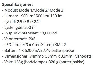 +Memento mori Skrevet 1. februar 2017 Skrevet 1. februar 2017 XXL har pleide å ha med følgene: Lumen* * Den effektive lumen er som regel lavere end den angivne maksimale styrke på pæren. Dette afhænger af batteriets evne til at levere nok strøm til pæren. Den beregnede effektive lumen er cirka 70 % af den angivne maksimale pærestyrke for dette sæt. 1900 stjernelumen x70%= 1330 lumen som sikkert blir rundt opp til nærmeste 500. De fleste i en kjøpssituasjon velger et høyere tall, hvis de kan, i tro om at det er bedre...........