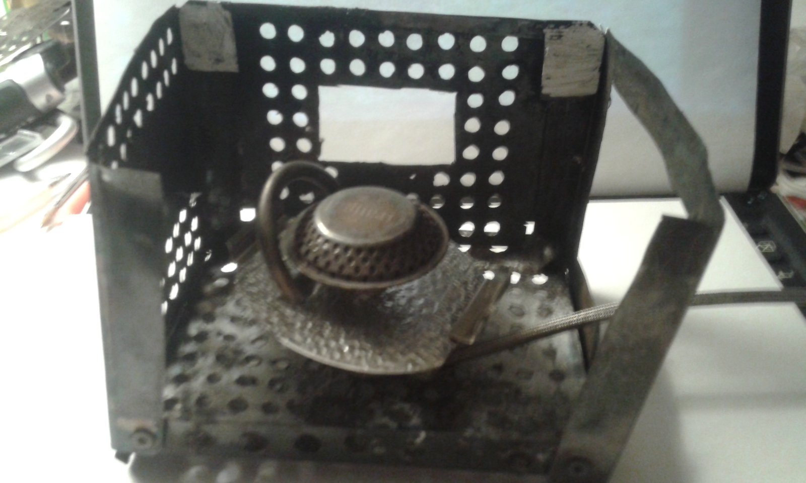 Når det gjelder soliditet er det klart at her har jeg inngått et kompromiss.  En kuriositet:  For en stund siden laget jeg en ovn av spraybokser, et enda tynnere metall. Men selv den ovnen tålte 10 kgs belastning uten å knele.  (Klarte ikke å presentert  bildet riktig)