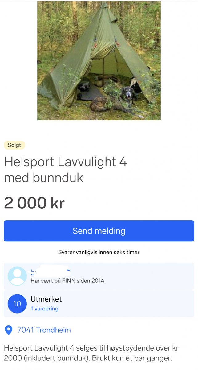 +Memento mori Skrevet 3. mars 2019 Skrevet 3. mars 2019 (endret) 18 minutter siden, borgern skrev: Lavvu Light veier 2,5 med bunnduk og plugger Oppgitt fra Helsport. Akkurat solgt på finn. Finnes i flere utgaver. Er jo plass til lange personer i det minste. Endret 3. mars 2019 av Memento mori Skrivefeil