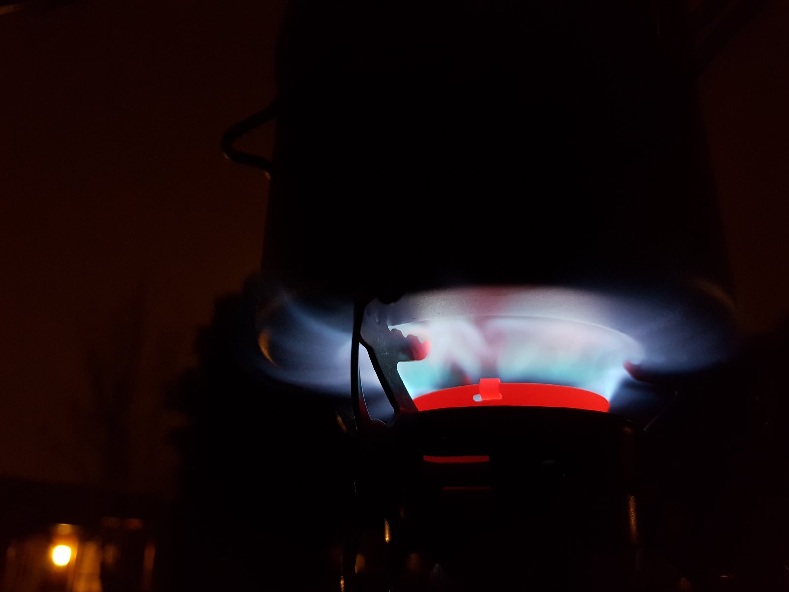 Prøvde 111C en gang til i sted, skulle jo lage litt kaffe og det var en god anledning. Den brant uten å flamme opp nå, men det kom ett par "host". Kan virke som det er noe rusk i brenneren som løsner og flyr ut gjennom dysen av og til? Og kanskje det har kommet ut nå.