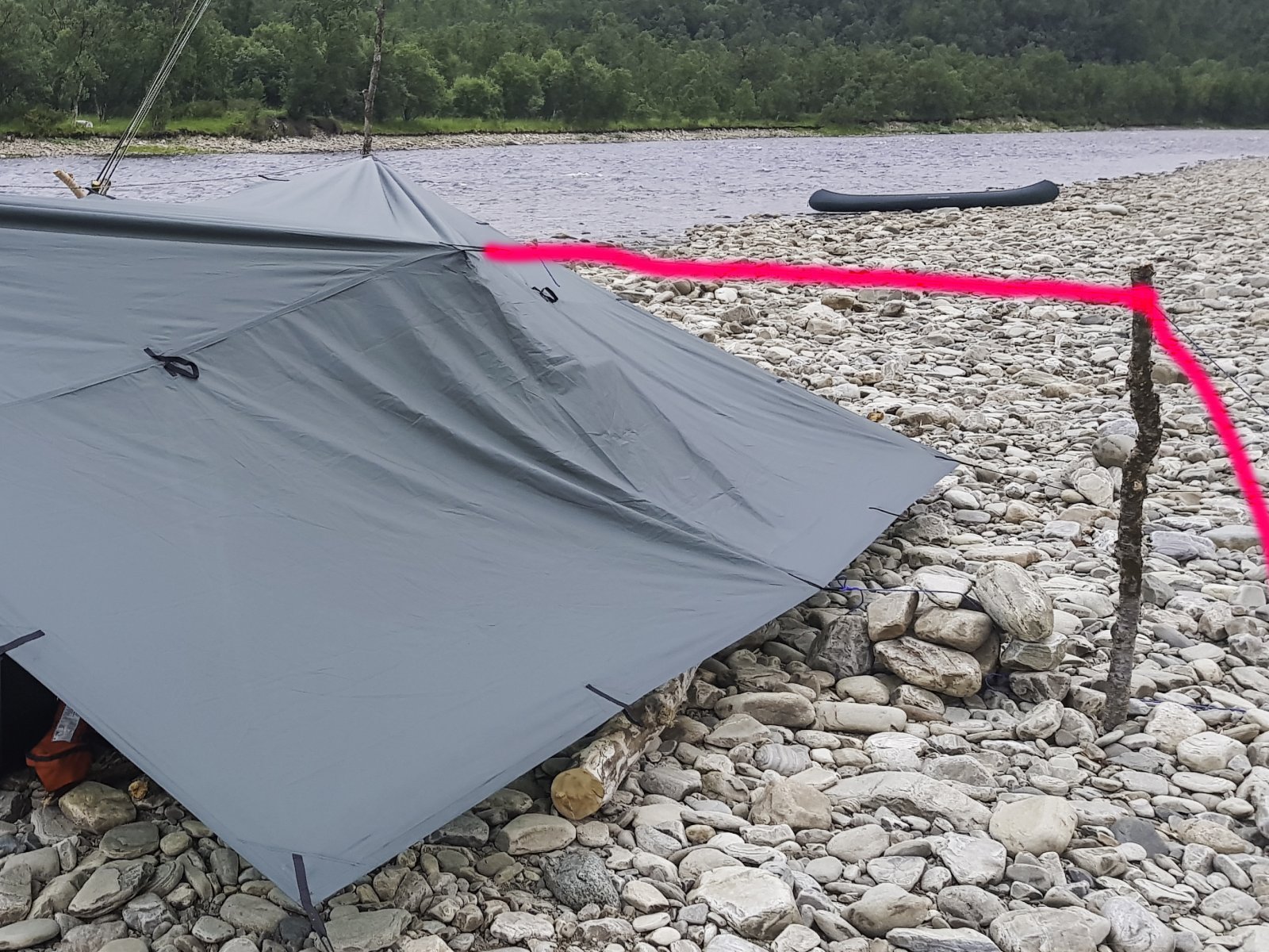 +Espen Ørud Skrevet 10. juni 2020 Skrevet 10. juni 2020 Prisnsippet med tau via senterpunktet utvendig illustrert med et oppsett vi hadde nær bakken. Det er bare å oppskalere med lengre stokk/stav dersom man har tarpen montert høyere... Du bardunerer bare via stokken og inn til senter... 1