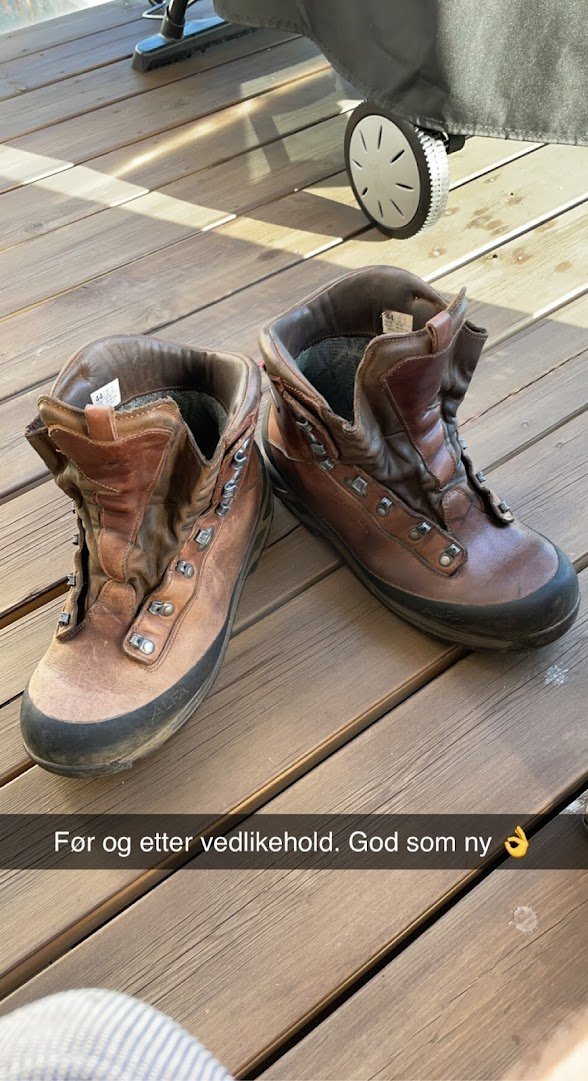 Jeg beskrev "prosessen" min på første side i tråden i korte trekk. Skyll/vask med oppvasksåpe på utsiden, avhengig av hvor skitne de er. La de tørke innendørs i over ett døgn til de er helt tørre (ikke på varmekabler osv.). Går over med impregneringsspray (Grangers), til læret blir "mett" på dette. Lar tørke igjen til læret er tørt. Til slutt går jeg over med Alfa Leather Care-produktet i flere runder med en fille helt til skoene har fått tilbake den fine shinen og brunfargen sin.