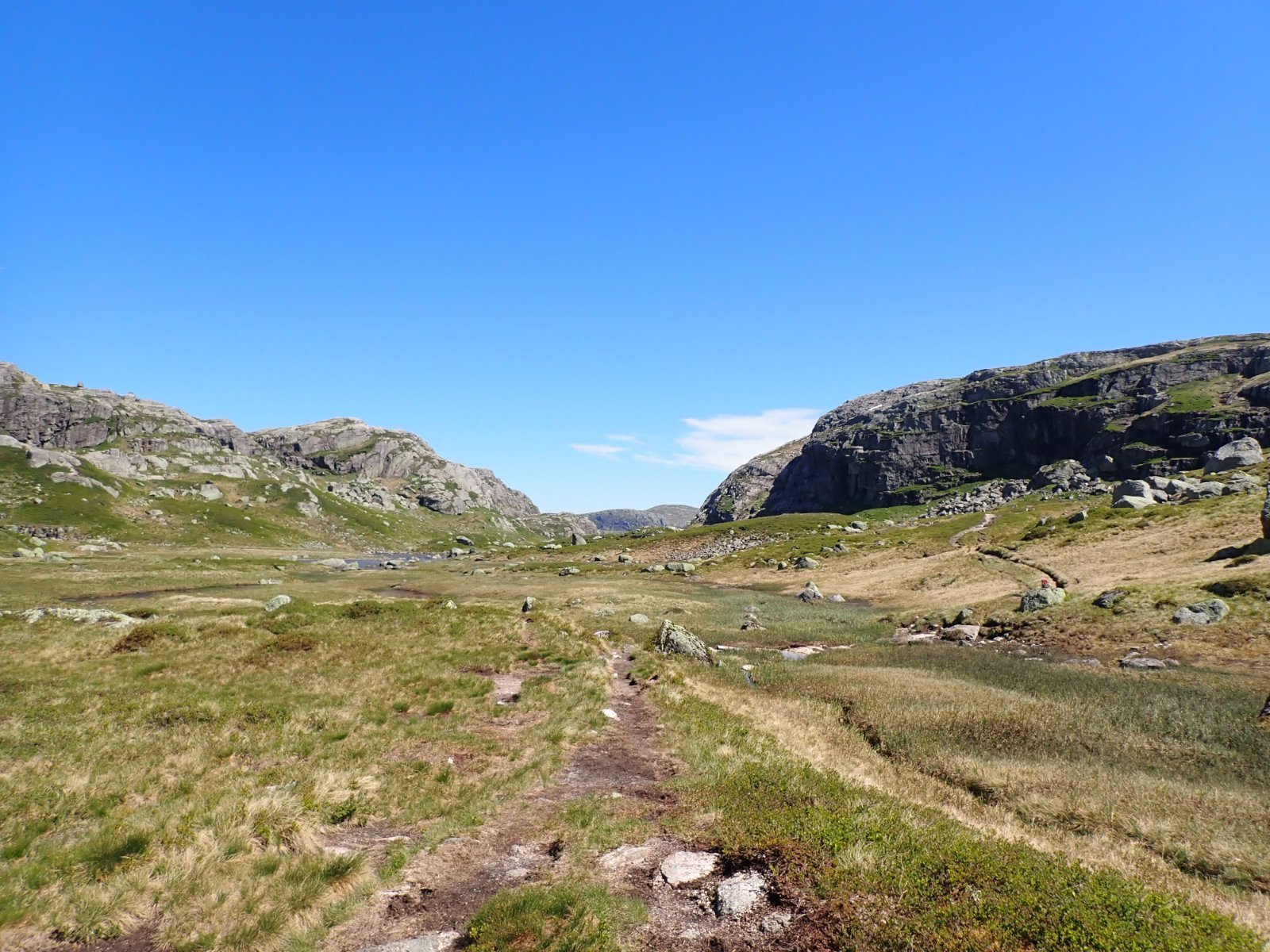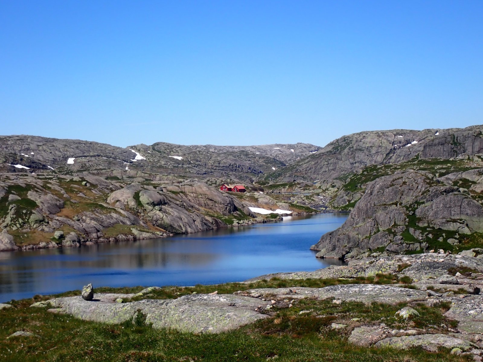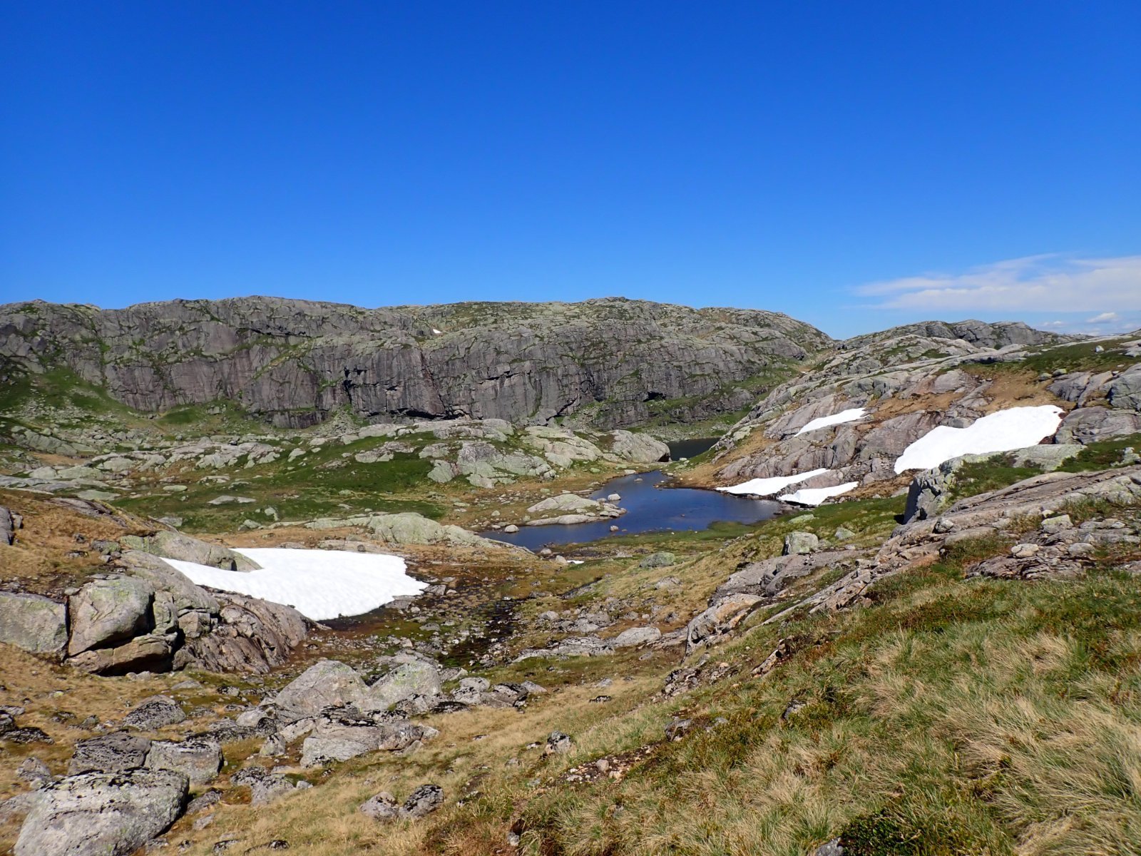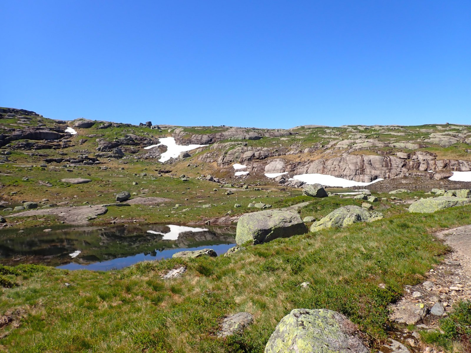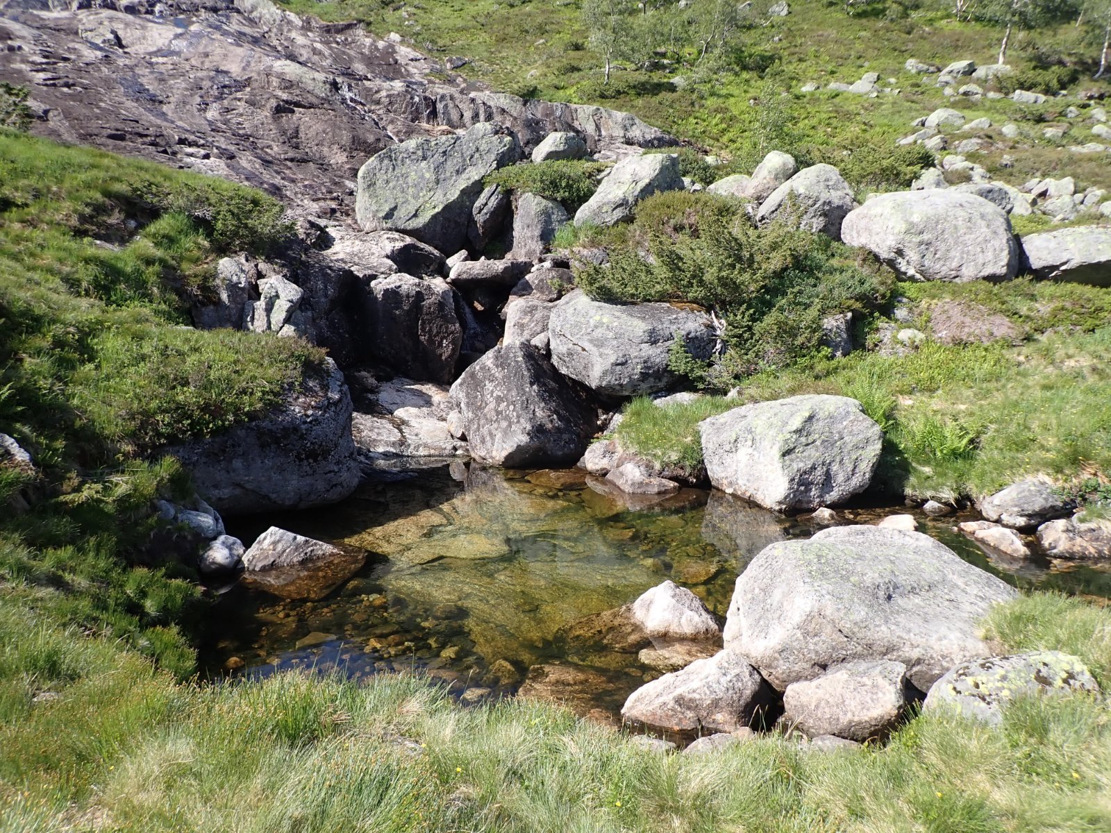 REJOHN Skrevet 29. juni 2021 Skrevet 29. juni 2021 Første besøk på Sandvatn – og badekulpen i år. Det var lukten av einer og lyng som møtte meg oppover i Lysebrekka på årets første tur innover mot Sandvatn. Litt lengre oppe sto fjelltjæreblommen og nikket i trekken. En skikkelig god start på turen. Yr var svært gavemild denne dagen. Det var snakk om blå himmel, lite skyer og forholdsvis varmt. Ikke for varmt, men passe for en tur oppe i heia. Nå er turen fram og tilbake til Sandvatn en drøy dagstur – for meg – etter hvert. Det er omtrent 16-17 kilometer til sammen, og selv om det er forholdsvis «flatt», så er bakken opp langs Lysebekken både lang og delvis bratt. Jeg har aldri kommet opp den bakken uten å bli skikkelig andpusten. Etter en lang vinter – og kort vår, uten spesielt mange langturer kan formen være så som så, og jeg blir jo ikke yngre med årene. Jeg var usikker på hvordan det ville gå, men siden jeg jo hadde gjort dette noen ganger før så... På tross av Yrs mange og flotte bilder at trill rund gul sol, var det overskyet og trist hjemme. Nå er ikke «havskodde» ukjent for oss som bor bare noen kilometer fra havkanten. Det pleier å bli blå himmel og sol bare noen flere kilometer lengre inne. Denne gang var det overskyet til langt inne i landet, men i Hunnedalen skinte sola – fra blå himmel. Det fortsatte den å gjøre hele dagen. Det ble helst varmt, men heldigvis var det en liten trekk som gjorde det levelig. I le av trekken ble det varmt. Heldigvis ligger badekulpen i le for vinden, og med sola steikende på svabergene der bekken renner blir det varmtvann. Uten mulighet til å skue på kaldvannet... Nå ble det ikke bading på veien innover. Det passer liksom bedre helt i slutten av turen. Jeg måtte komme meg innover i heia først. Oppe i høyden, innover mot Blautevatnet, kikket jeg etter snøfennene som alltid ligger her. Første gang jeg går denne turen er det vanlig å gå over ganske mange fenner. Selv om det snart er juli, så ligger snøfenner ofte til både august og enkelte ganger til ute i september. Etter snøvinteren i 2015 lå det en fonn hele sommeren. Jeg er ikke sikker på om den forsvant i det hele tatt. Det kom i hvert fall nysnø på fonna før den forsvant. Denne fonna var nesten borte. Det lå fortsatt noen rester, men med det varme været som er lovet fremover, vil all snøen være borte første uka i juli. Det er alltid kjekt å se igjen flatene ved Mangædne. Det blir som oftest en stopp ved brua for å smake på kvaliteten på årgangen. Jeg var ikke helt alene i heia. Jeg traff en person, som hadde vært på hytta sammen med hyttevakten. Det ville altså være folk på hytta også. Jeg kom likevel ned til en tom hytte. Folkene var oppe på en topp for å finne «dekning». Etter en skikkelig pause tok jeg fatt på tilbaketuren. Som ble omtrent som turen inn. Jeg kunne jo kjenne at jeg hadde vært på beina noen timer, men stor sett gikk det mye bedre enn fryktet. Som alltid. Det ble stopp og bading i badekulpen. Der var vannet omtrent lunkent. Trekken gjorde det likevel litt kaldere enn i «syden», og det ble ikke et langt opphold ved kulpen. 6