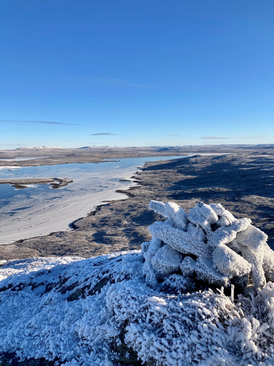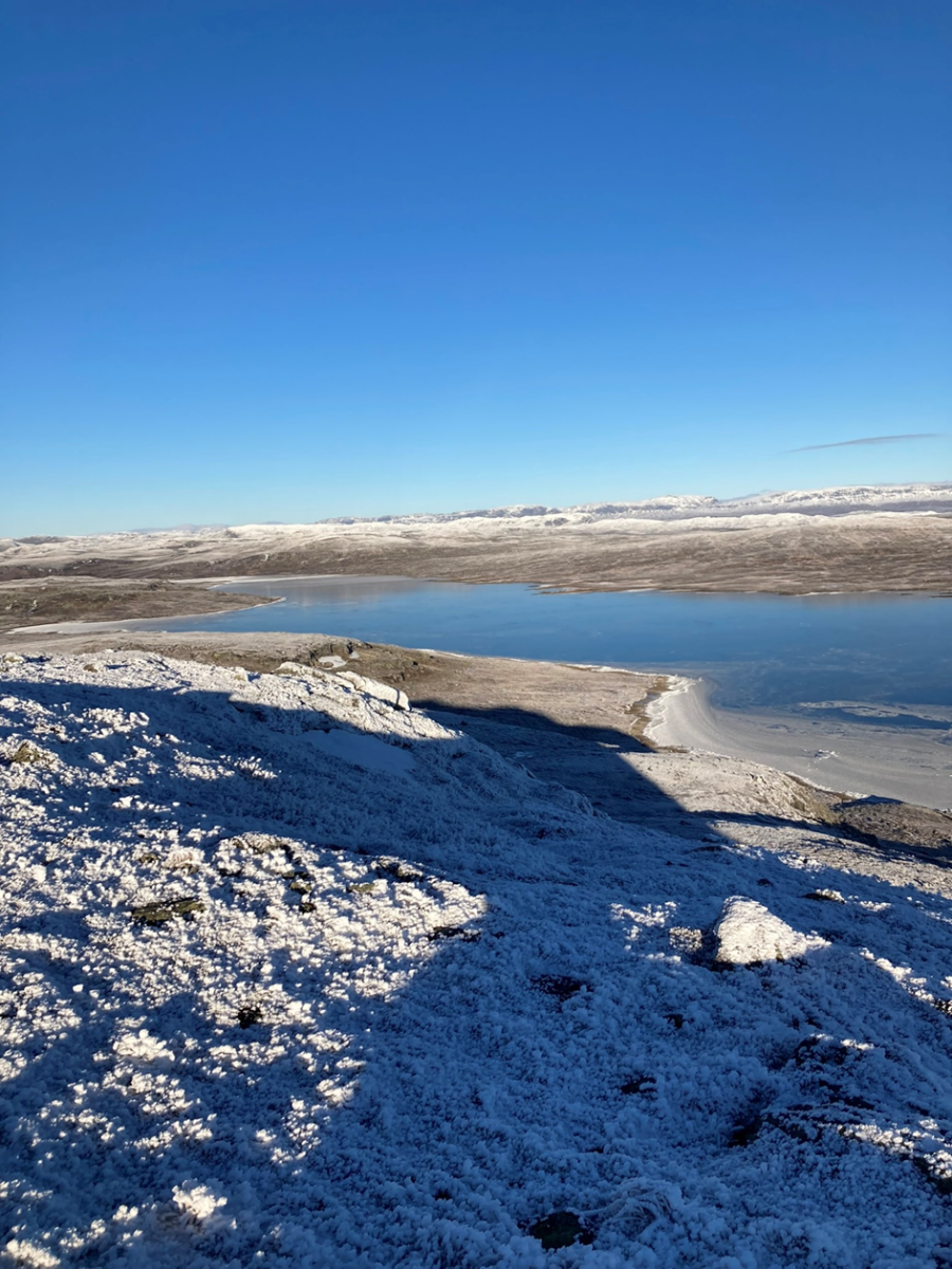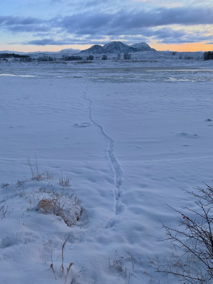 På vei ned igjen blir jeg oppmerksom på et spor nedi fjæra på isen. Ahh.. det er speilholke det spørs om ikke skapningen oppholder seg der bildet ble tatt nedi lavlandet..