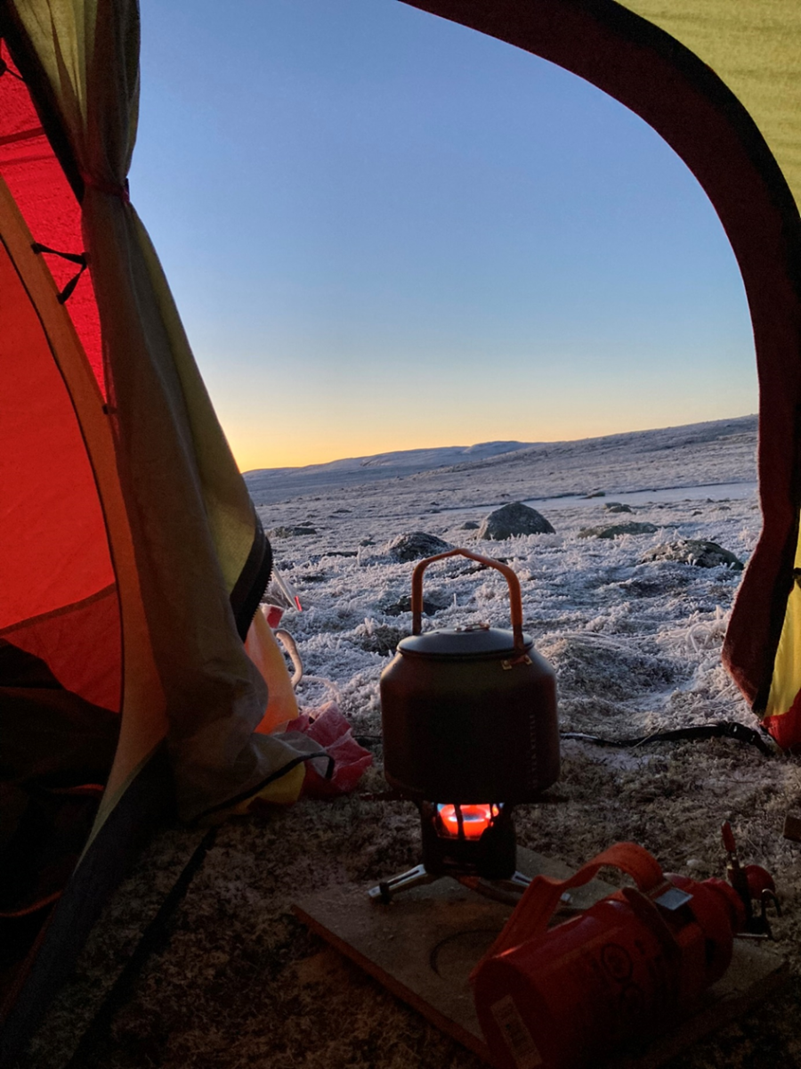 Kaffekoking på bål i dag, og for anledningen testet vi en ny frysetørret variant. Merket er Outdor og retten heter "Vegan Chili Sin Carne". Mye ris, men veldig god på smak synes vi. Ris blir jo aldri helt som kokt ris da, men helt greit. Lav og fin sol med varme farger. Solnedgangen kommer tidlig så her års.