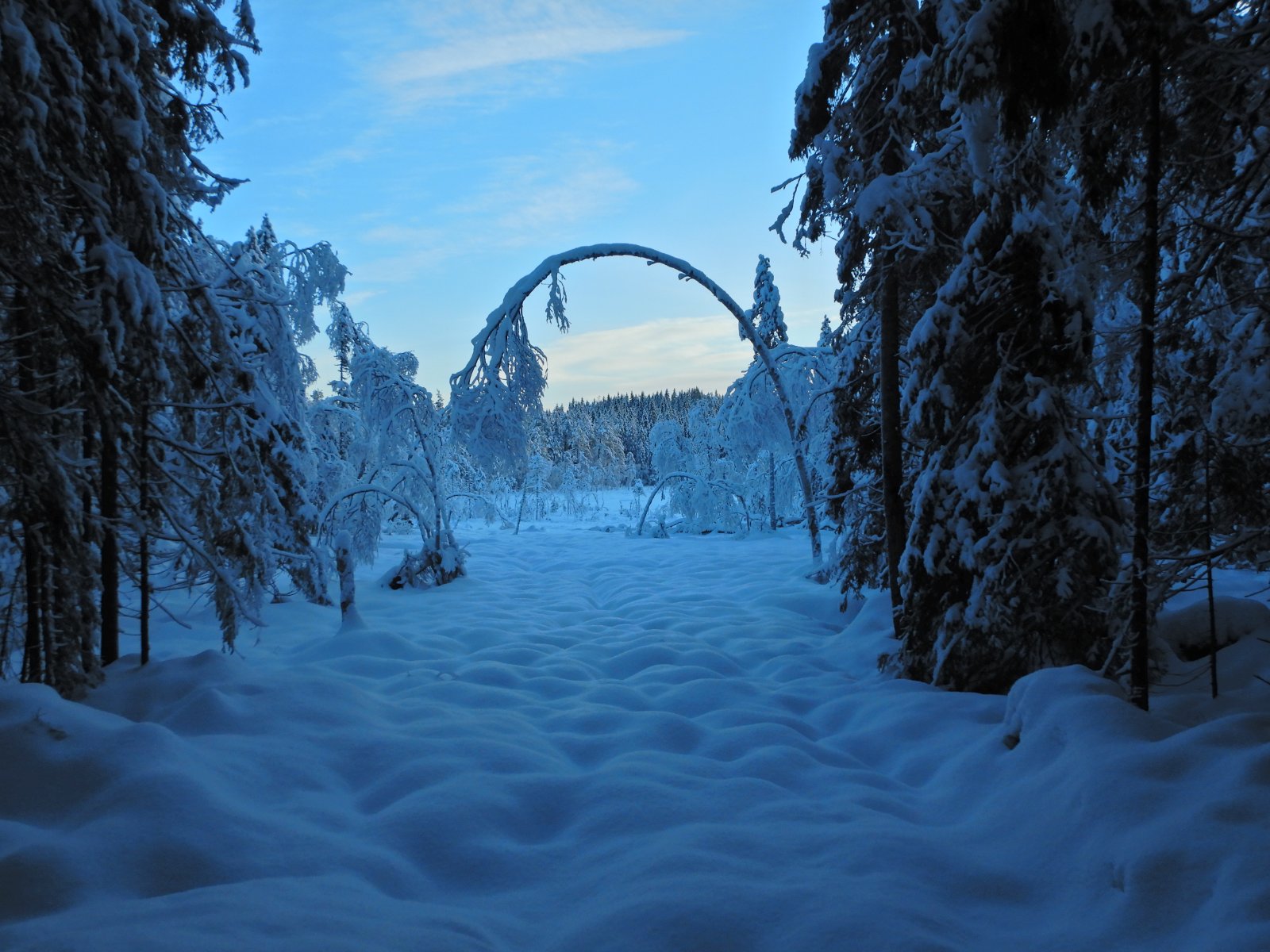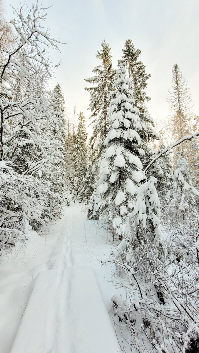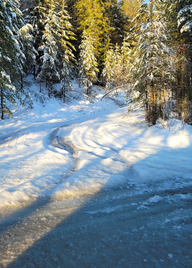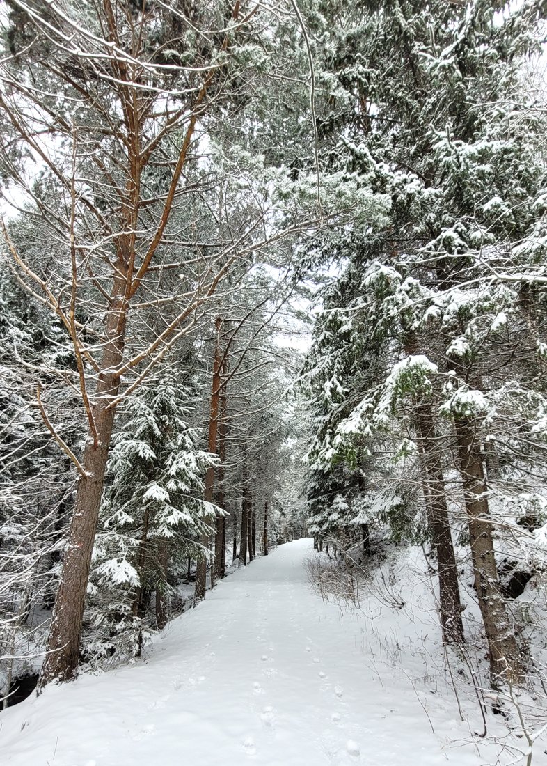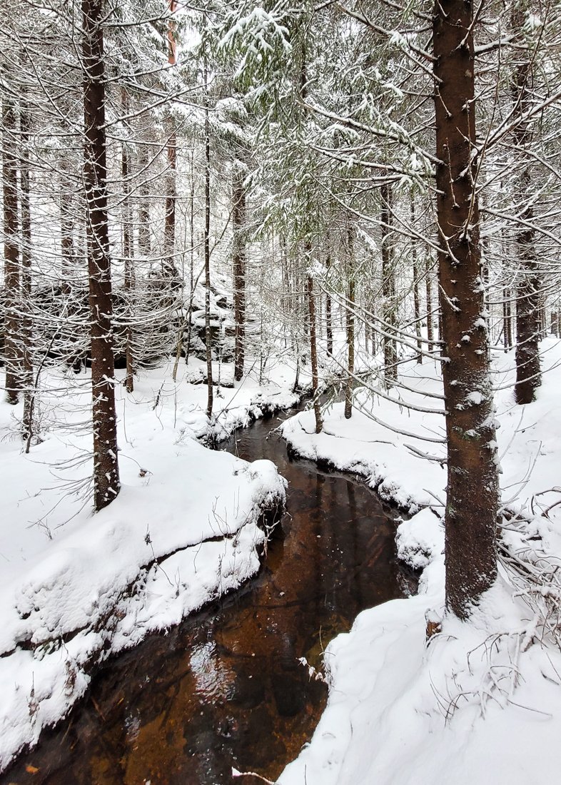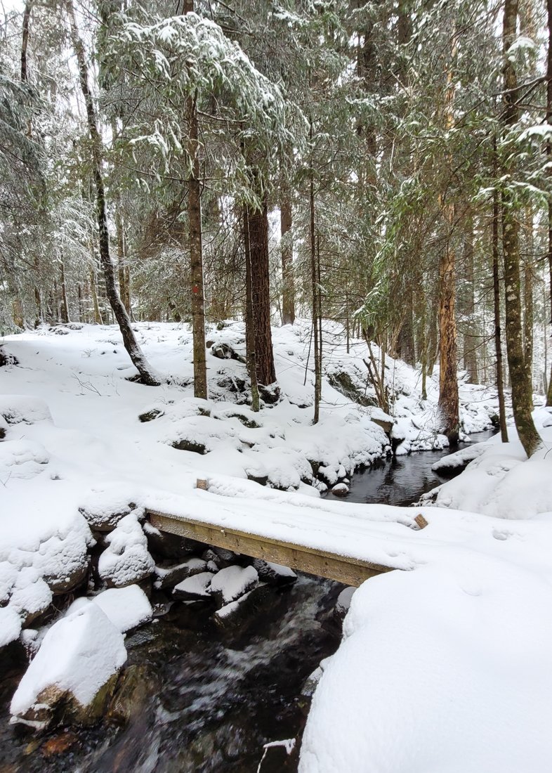 Så i dag ble det en trøstetur i den lokale skogen, i noen få minusgrader og nysnø, etter noen dager med regn og varmegrader. Den gamle snøen hadde derfor smeltet en del, så var ikke vanskelig å gå i dag, kun 5-10cm på det værste. Det skumleste var visse deler av stien der vann hadde samlet seg og frosset, for så at nysnøen la seg oppå.. ble noen improviserte ballett-bevegelser til tider, men gikk heldigvis greit :D