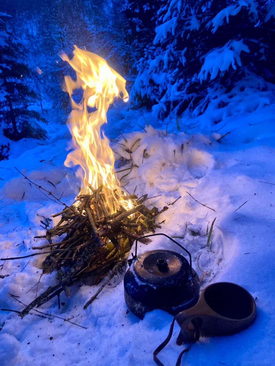 I dag ble det sushi (ferdigrett) og varm solbærsaft med påfølgende kaffekos ved skogsbålet. Jeg fant ei gløppe som gav sol i akkurat den halvtimen jeg trengte til å fyre bålet, varme vann til solbærsafta, spise og koke kaffe. Trikset er å sette seg i kanten av solskyggen ved start, så passerer sola over scenen mens man sitter der og nyter det nydelige været. 12-13-14 kuldegrader, vindstille og sol, et lite bål med en sydende kaffekjele, snø på trærne, et par flaggspetter som lager et lurveleven mens de krangler om hvem som har retten til områdets kongleavling...kan det bli bedre? Nei!