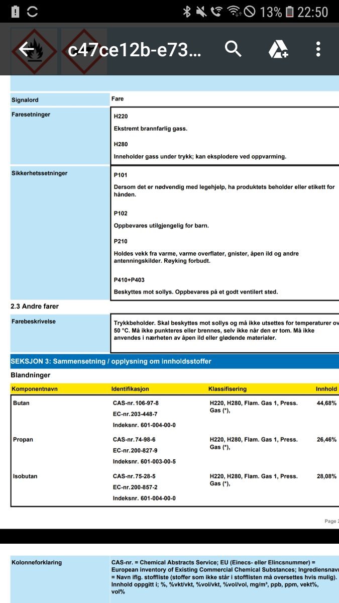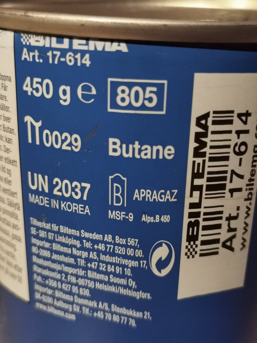 Skogens Stønn Skrevet 21. februar 2022 Skrevet 21. februar 2022 Blindgjenger skrev (23 minutter siden): Biltema har et litt mer lettlest sikkerhetsdatablad og oppgir hhv 26,46%, 28,08% og 44,68%. Hmmm...ja, men på boksene jeg har står det butan på sida. Boksene mine er også blå med hvit tekst, men teksten ser annerledes ut enn på bildene hos biltema.
