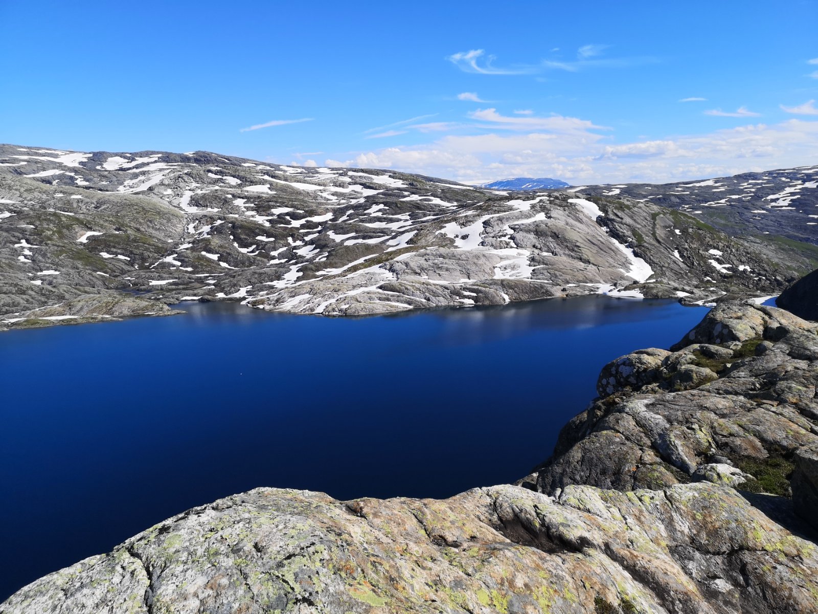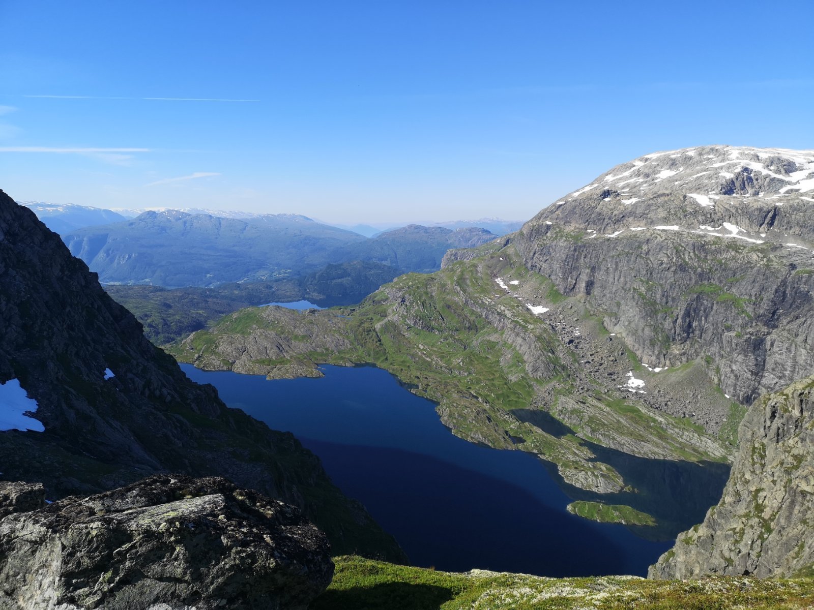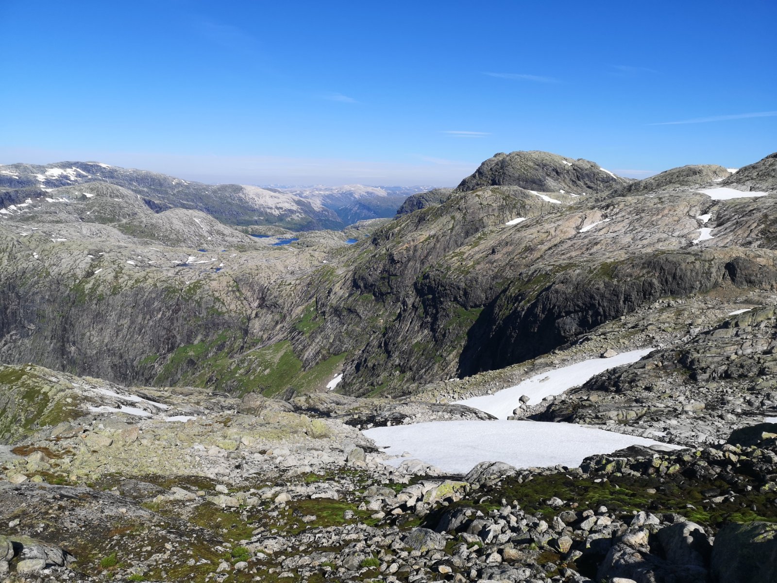 Populært innlegg +Bjellesau Skrevet 17. august 2022 Populært innlegg Skrevet 17. august 2022 (endret) Vassfjøro er eit realt blikkfang av eit fjell, der det tronar majestetisk opp bak Ulvik innst i Hardangerfjorden. Sjølv oppdaga eg Vassfjøro då ein kollega av meg fortalte at ho hadde vakse opp der inne. Eg ville sjå litt i kartet for å orientere meg, og då fall augo raskt mot denne særmerkte toppen. Og litt av eit namn på eit 1633 meter høgt fjell! Planen var å gå frå Ulvik sentrum og opp til toppen via vatnet Ljoneskrulen for så og følgja ryggjen til Vassfjøro nordaustover. Etter råd frå kjentfolk og forumet her hadde eg sikta meg inn på nedstigning nord for Skrulsvatnet. Siste etappe var å møta turstien frå Osa til Hallingskeid på omlag 1200 meter og følgja den til Bergensbanen, der eg skulle hoppa på eit tog til Oslo. Då værmeldinga for 13. og 14. august var så strålande god, klinkar eg til. Tog frå Oslo til Geilo, buss til Eidfjord og båt inn til Ulvik. Allereie når båten krusar inn mot Ulvik ser eg Vassfjøro over åskanten. Det er full sommar i Hardanger og ikkje eit vindpust. Landskapet vibrerar i den brennande ettermiddagen. Vegen går opp til Solsævatnet, fyst på asfalt, så på traktorveg og tilslutt på sti. Frå Solsævatnet er det umerka sti til Ljoneskrulen forbi restane av dei gamle Sveigstølane. Det er bratt og eg svettar som ein gris oppetter lia. Men eg nærmar meg: Oppe ved Ljoneskrulen treff eg ein turgåar som akkurat har vært på Vassfjøro. Han fortel om ein heller utrygg nedfart mot Ljoneskrulen og anbefalar ikkje den vegen om eg skal opp. Eg skal vedgå eg vert litt betenkt. Men eg får vel sova på det. Teltet vert reist på ein odde i nordenden av vatnet. Eit mektig og nesten litt trugande landskap. Alle kleda er søkk blaute av svette og eg legg alt til tørk. Eg vaknar i grålysinga. Liggeunderlaget har sklidd ned i eine sideveggen. Heile innerteltet er dekka av små kondensperler. Soveposen er fuktig og klam. Og kleda er like våte som igår. Våtare faktisk. Det må være lite sol her for sjeldan har eg opplevd så mykje fukt og kondens. Klokka 8 er morgonsola framleis ein time i frå teltet. Det blir ein kjapp frukost og ein kaffi før eg pakkar sakene. 11 kg har eg på ryggen. Eg går roleg oppover. Inga kaving eller stressing. Tek meg tid til å finna den beste vegen. Det er bratt, men eigentleg ikkje noko problem. Lett klyving nokre stader. Snart kan eg sjå ned på Ljoneskrulen. Det er eit vilt og knudrete landskap her oppe. På omlag 1400 meter tek snøfonner over heile landskapet. Og endeleg, over 3 timar sidan eg braut leir, ser eg toppvarden framfor meg. På toppen er det eit flott utsyn til både Folgefonna og Hardangerjøkulen og fjorden. Eg kan kjenne at eg har lite energi, så eg fyrer opp primusen for å koka nudlar og spekepølse. Eg legg òg ut både telt og sovepose til tørk. Medan eg sit slik kjem det opp ein kar med hund frå den andre sida av fjellet. Me har oss ein liten prat før han legg på veg nedover. Eg kosar meg på toppen i 1 og 1/2 time før eg set kompasskurs innover fjellryggen. Det er gnistrande flott i fjellet. Navigeringa ned til Skrulsvatnet går greit, og eg følgjer anbefalinga med å gå rundt og ned på nordsida av vatnet og ikkje den bratte sørsida. Snart kan eg høyre ein veldig fossadur. Det er ein stor og stri bekk som eg må forbi. Heldigvis renn den ned i eit mellombasseng der den flatar ut. Der går det greit å vasse over. Vidare rundt vatnet er det eindel mikroterreng å ta omsyn til. Stundom går eg meg litt fast og må finna ein ny veg. På ein bratt stad finn eg ein lur korridor mellom bergveggen og ei snøfonn. Ikkje lenge etter rundar eg nordsida på Skrulsvatnet og då er det ikkje lenge til eg skal slå leir. Og teltplassen denne natta blir av dei betre. Tørt underlag i 100% vater. Fine nakne svaberg rett utafor teltdøra og fin bekk med iskaldt smeltevatten rett i nærleiken. Eg kan leggje alle kleda til tørk på berget og det er varmt nok til at ein kan sitja i berre trusa på 1300 meter klokka 9 på kvelden. Eg kokar middag og lar fjellroen senka seg. Betre enn dette er det kanskje ikkje mogeleg å få det? På natta blir det væromslag. Regn og vind. Det får bli frukost og kaffikoking innandørs. Og så er det berre å treffa den merka turstien frå Osa. Det blir litt leiting etter trygg veg når ein går på tvers av furene i terrenget. Men brått får eg auge på ein stor varde. Og ein endå større utsikt: Då er det berre å følgja dei raude T-ane heilt fram til Hallingskeid stasjon. Eg går no inn i eit litt gudsforlatt område og stien følgjer ein svart og steil fjellvegg nokre kilometer. Kanskje det er været som gjev landskapet eit litt dystert preg, med skydekke og småregn. Det er mykje snø her, sjølv om eg berre er på 12-1300 meter. Har faktisk aldri sett så mykje snø på denne høgda før midt i august. Men snøen må sleppa taket når eg kjem meg lågare ned, og i Buadalen før Hallingskeid stasjon er det atter frodig fjellvegitasjon. Då er det berre å vente på toget. Og på Bergensbanen er det jo alltid forseinka. Men det gjer ikkje noko. Eg kjenner berre stor glede etter ein uvanleg flott tur. Fantastisk område dette. Ein tur med litt hår på brøstet. Endret 17. august 2022 av Bjellesau Vis rapporten i Turkartet Vis større kart 18 1