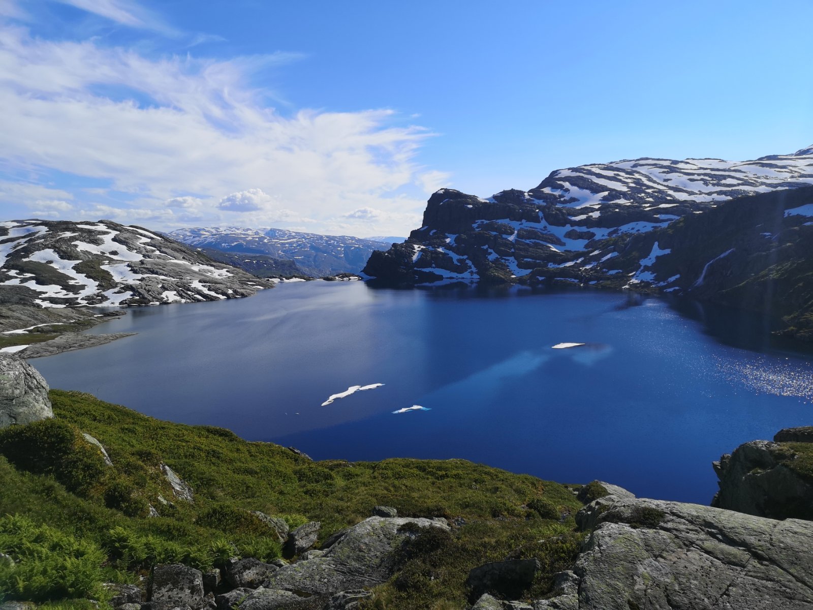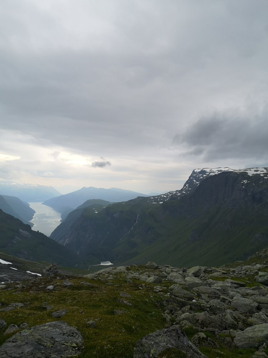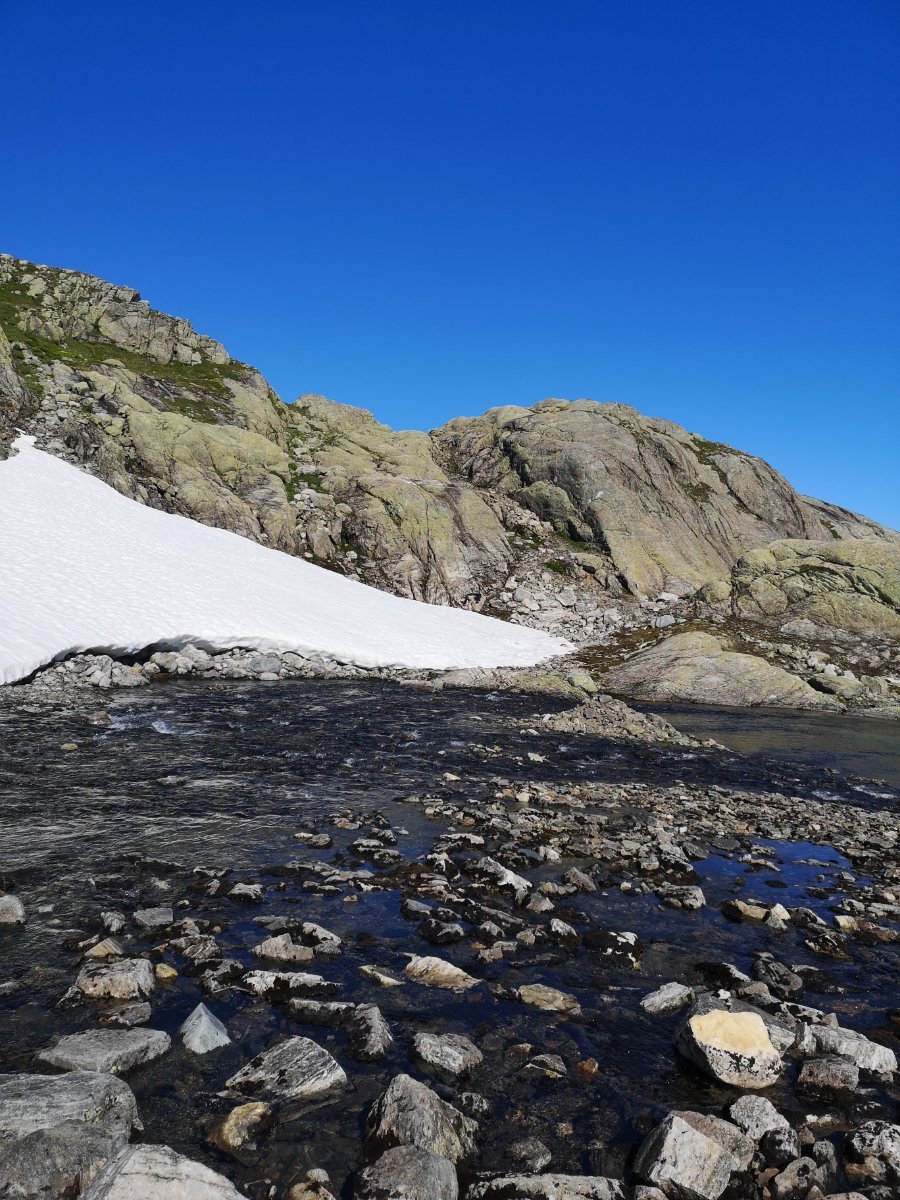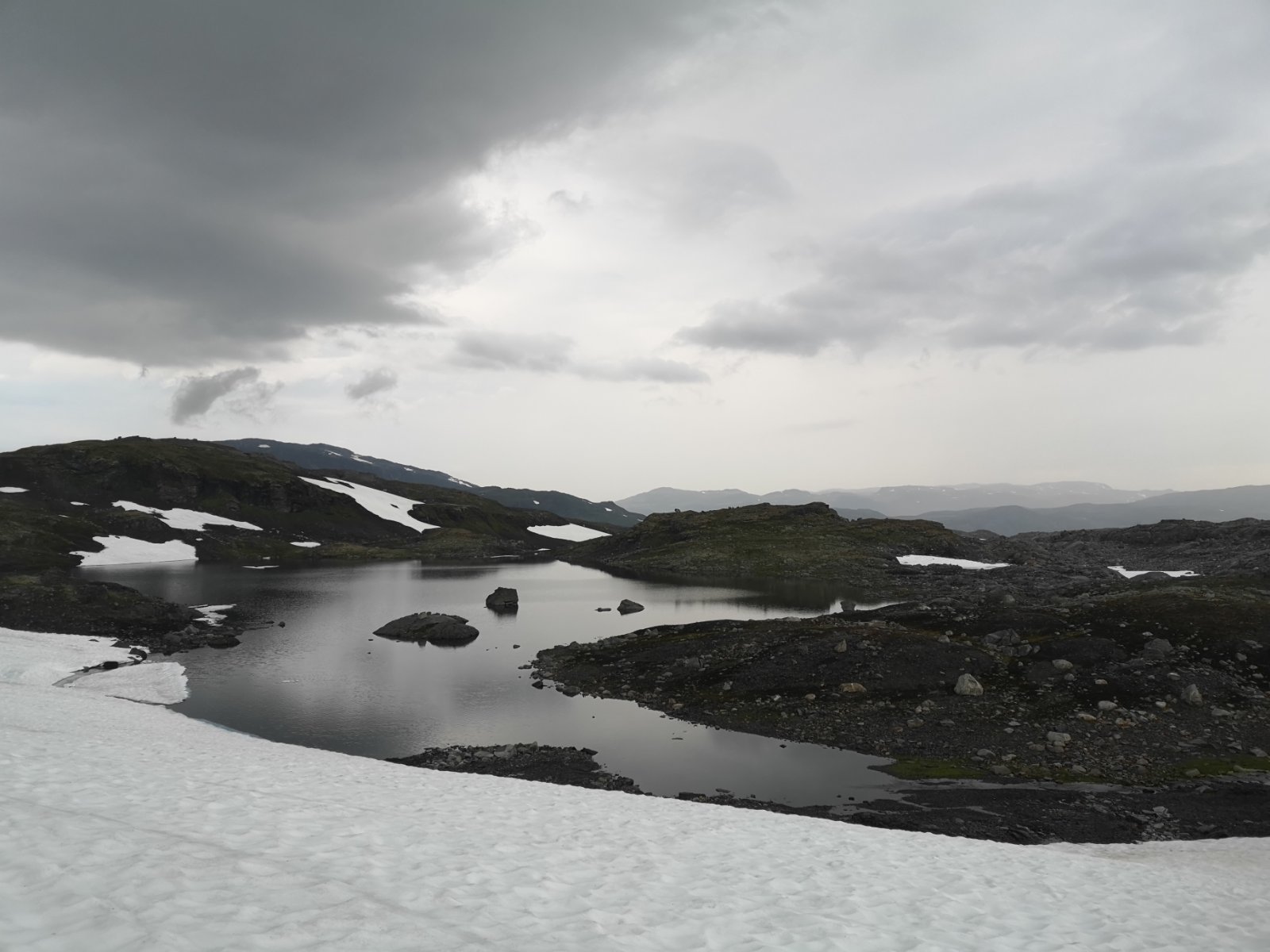 Populært innlegg +Bjellesau Skrevet 17. august 2022 Populært innlegg Skrevet 17. august 2022 (endret) Vassfjøro er eit realt blikkfang av eit fjell, der det tronar majestetisk opp bak Ulvik innst i Hardangerfjorden. Sjølv oppdaga eg Vassfjøro då ein kollega av meg fortalte at ho hadde vakse opp der inne. Eg ville sjå litt i kartet for å orientere meg, og då fall augo raskt mot denne særmerkte toppen. Og litt av eit namn på eit 1633 meter høgt fjell! Planen var å gå frå Ulvik sentrum og opp til toppen via vatnet Ljoneskrulen for så og følgja ryggjen til Vassfjøro nordaustover. Etter råd frå kjentfolk og forumet her hadde eg sikta meg inn på nedstigning nord for Skrulsvatnet. Siste etappe var å møta turstien frå Osa til Hallingskeid på omlag 1200 meter og følgja den til Bergensbanen, der eg skulle hoppa på eit tog til Oslo. Då værmeldinga for 13. og 14. august var så strålande god, klinkar eg til. Tog frå Oslo til Geilo, buss til Eidfjord og båt inn til Ulvik. Allereie når båten krusar inn mot Ulvik ser eg Vassfjøro over åskanten. Det er full sommar i Hardanger og ikkje eit vindpust. Landskapet vibrerar i den brennande ettermiddagen. Vegen går opp til Solsævatnet, fyst på asfalt, så på traktorveg og tilslutt på sti. Frå Solsævatnet er det umerka sti til Ljoneskrulen forbi restane av dei gamle Sveigstølane. Det er bratt og eg svettar som ein gris oppetter lia. Men eg nærmar meg: Oppe ved Ljoneskrulen treff eg ein turgåar som akkurat har vært på Vassfjøro. Han fortel om ein heller utrygg nedfart mot Ljoneskrulen og anbefalar ikkje den vegen om eg skal opp. Eg skal vedgå eg vert litt betenkt. Men eg får vel sova på det. Teltet vert reist på ein odde i nordenden av vatnet. Eit mektig og nesten litt trugande landskap. Alle kleda er søkk blaute av svette og eg legg alt til tørk. Eg vaknar i grålysinga. Liggeunderlaget har sklidd ned i eine sideveggen. Heile innerteltet er dekka av små kondensperler. Soveposen er fuktig og klam. Og kleda er like våte som igår. Våtare faktisk. Det må være lite sol her for sjeldan har eg opplevd så mykje fukt og kondens. Klokka 8 er morgonsola framleis ein time i frå teltet. Det blir ein kjapp frukost og ein kaffi før eg pakkar sakene. 11 kg har eg på ryggen. Eg går roleg oppover. Inga kaving eller stressing. Tek meg tid til å finna den beste vegen. Det er bratt, men eigentleg ikkje noko problem. Lett klyving nokre stader. Snart kan eg sjå ned på Ljoneskrulen. Det er eit vilt og knudrete landskap her oppe. På omlag 1400 meter tek snøfonner over heile landskapet. Og endeleg, over 3 timar sidan eg braut leir, ser eg toppvarden framfor meg. På toppen er det eit flott utsyn til både Folgefonna og Hardangerjøkulen og fjorden. Eg kan kjenne at eg har lite energi, så eg fyrer opp primusen for å koka nudlar og spekepølse. Eg legg òg ut både telt og sovepose til tørk. Medan eg sit slik kjem det opp ein kar med hund frå den andre sida av fjellet. Me har oss ein liten prat før han legg på veg nedover. Eg kosar meg på toppen i 1 og 1/2 time før eg set kompasskurs innover fjellryggen. Det er gnistrande flott i fjellet. Navigeringa ned til Skrulsvatnet går greit, og eg følgjer anbefalinga med å gå rundt og ned på nordsida av vatnet og ikkje den bratte sørsida. Snart kan eg høyre ein veldig fossadur. Det er ein stor og stri bekk som eg må forbi. Heldigvis renn den ned i eit mellombasseng der den flatar ut. Der går det greit å vasse over. Vidare rundt vatnet er det eindel mikroterreng å ta omsyn til. Stundom går eg meg litt fast og må finna ein ny veg. På ein bratt stad finn eg ein lur korridor mellom bergveggen og ei snøfonn. Ikkje lenge etter rundar eg nordsida på Skrulsvatnet og då er det ikkje lenge til eg skal slå leir. Og teltplassen denne natta blir av dei betre. Tørt underlag i 100% vater. Fine nakne svaberg rett utafor teltdøra og fin bekk med iskaldt smeltevatten rett i nærleiken. Eg kan leggje alle kleda til tørk på berget og det er varmt nok til at ein kan sitja i berre trusa på 1300 meter klokka 9 på kvelden. Eg kokar middag og lar fjellroen senka seg. Betre enn dette er det kanskje ikkje mogeleg å få det? På natta blir det væromslag. Regn og vind. Det får bli frukost og kaffikoking innandørs. Og så er det berre å treffa den merka turstien frå Osa. Det blir litt leiting etter trygg veg når ein går på tvers av furene i terrenget. Men brått får eg auge på ein stor varde. Og ein endå større utsikt: Då er det berre å følgja dei raude T-ane heilt fram til Hallingskeid stasjon. Eg går no inn i eit litt gudsforlatt område og stien følgjer ein svart og steil fjellvegg nokre kilometer. Kanskje det er været som gjev landskapet eit litt dystert preg, med skydekke og småregn. Det er mykje snø her, sjølv om eg berre er på 12-1300 meter. Har faktisk aldri sett så mykje snø på denne høgda før midt i august. Men snøen må sleppa taket når eg kjem meg lågare ned, og i Buadalen før Hallingskeid stasjon er det atter frodig fjellvegitasjon. Då er det berre å vente på toget. Og på Bergensbanen er det jo alltid forseinka. Men det gjer ikkje noko. Eg kjenner berre stor glede etter ein uvanleg flott tur. Fantastisk område dette. Ein tur med litt hår på brøstet. Endret 17. august 2022 av Bjellesau Vis rapporten i Turkartet Vis større kart 18 1