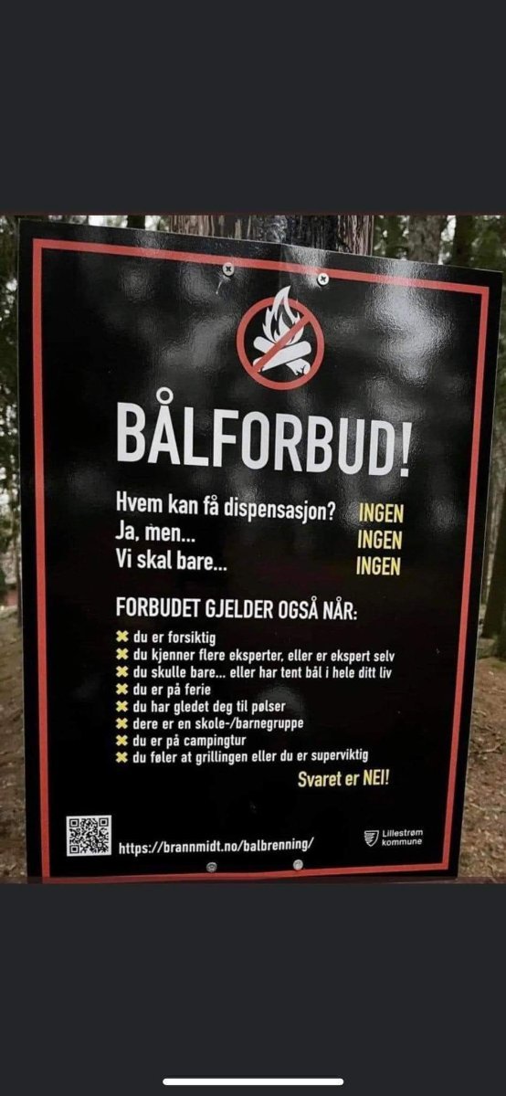 Etsvends Skrevet 9. juni 2023 Skrevet 9. juni 2023 3 hours ago, Espen Ørud said: Er denne plakaten satt opp nå med det ekstraordinære forbudet mot åpen ild eller denne relatert til det generelle bålforbudet? Jeg mener den strekker seg litt langt sånn på generell basis, men fin sånn det er nå.