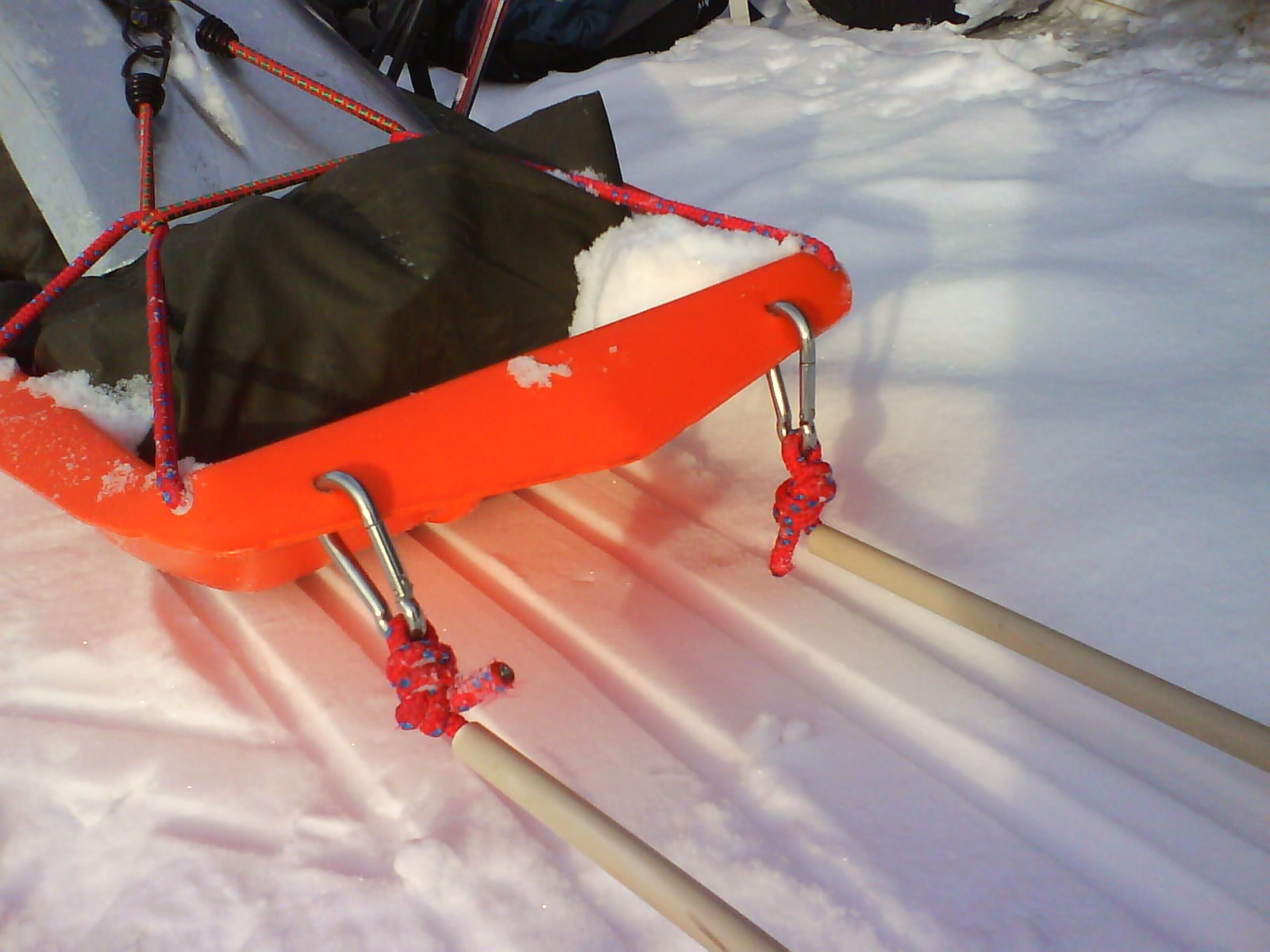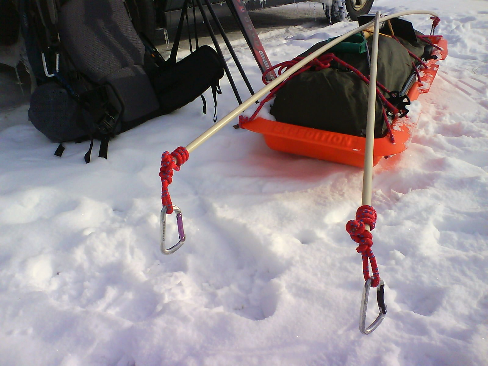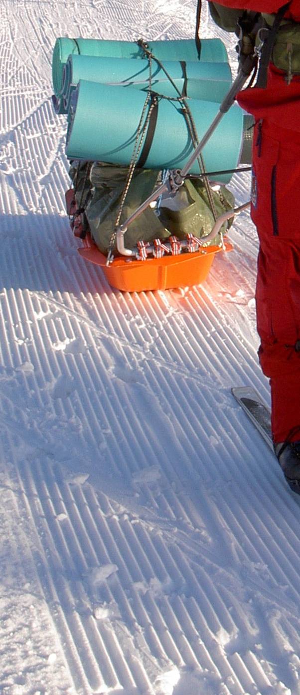 martin.m Skrevet 12. februar 2008 Skrevet 12. februar 2008 Her er bilder av dragløsning. I bratte, svingete nedoverbakker kan man greit la pulken kjøre foran seg og styre med drag.