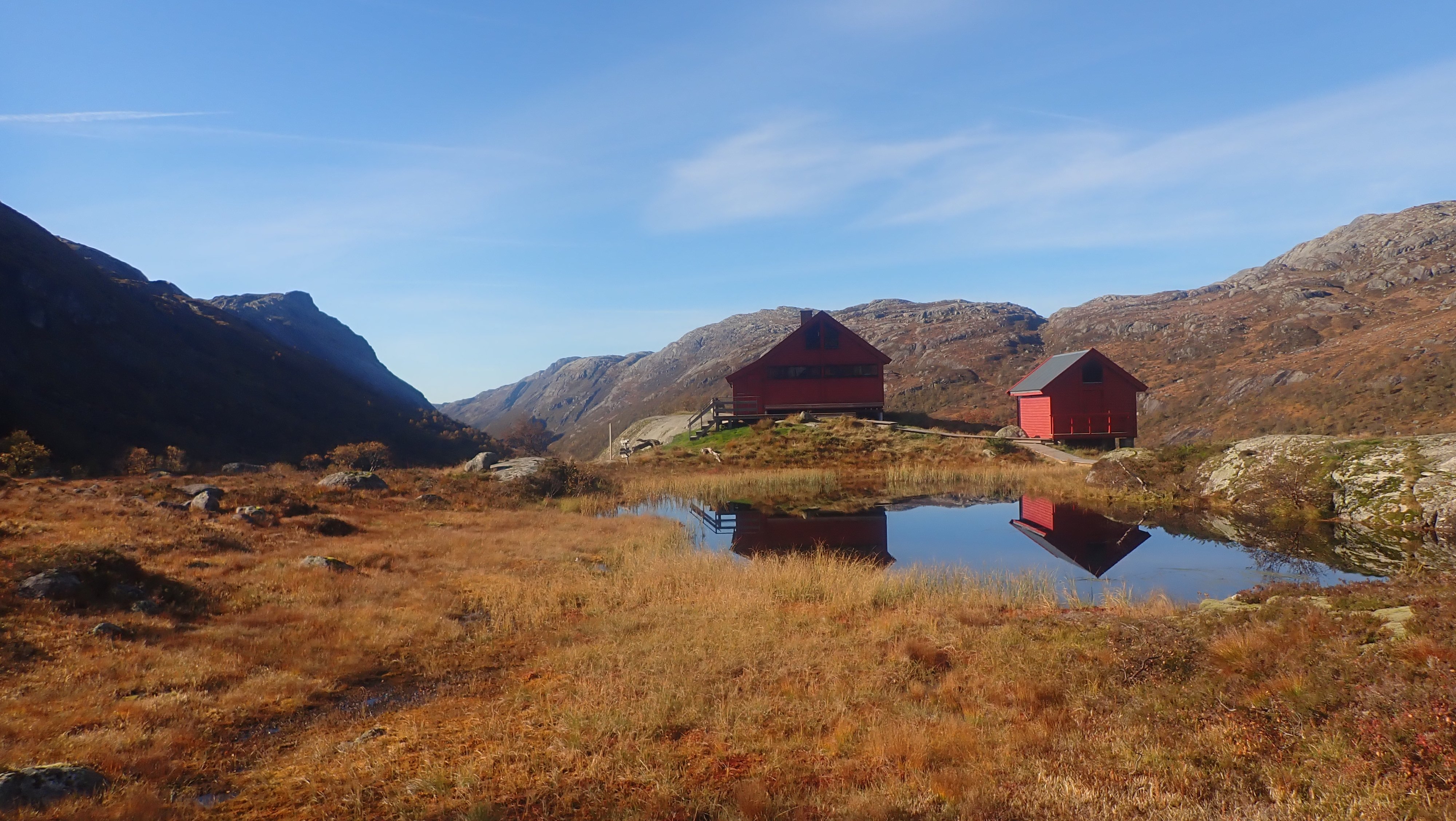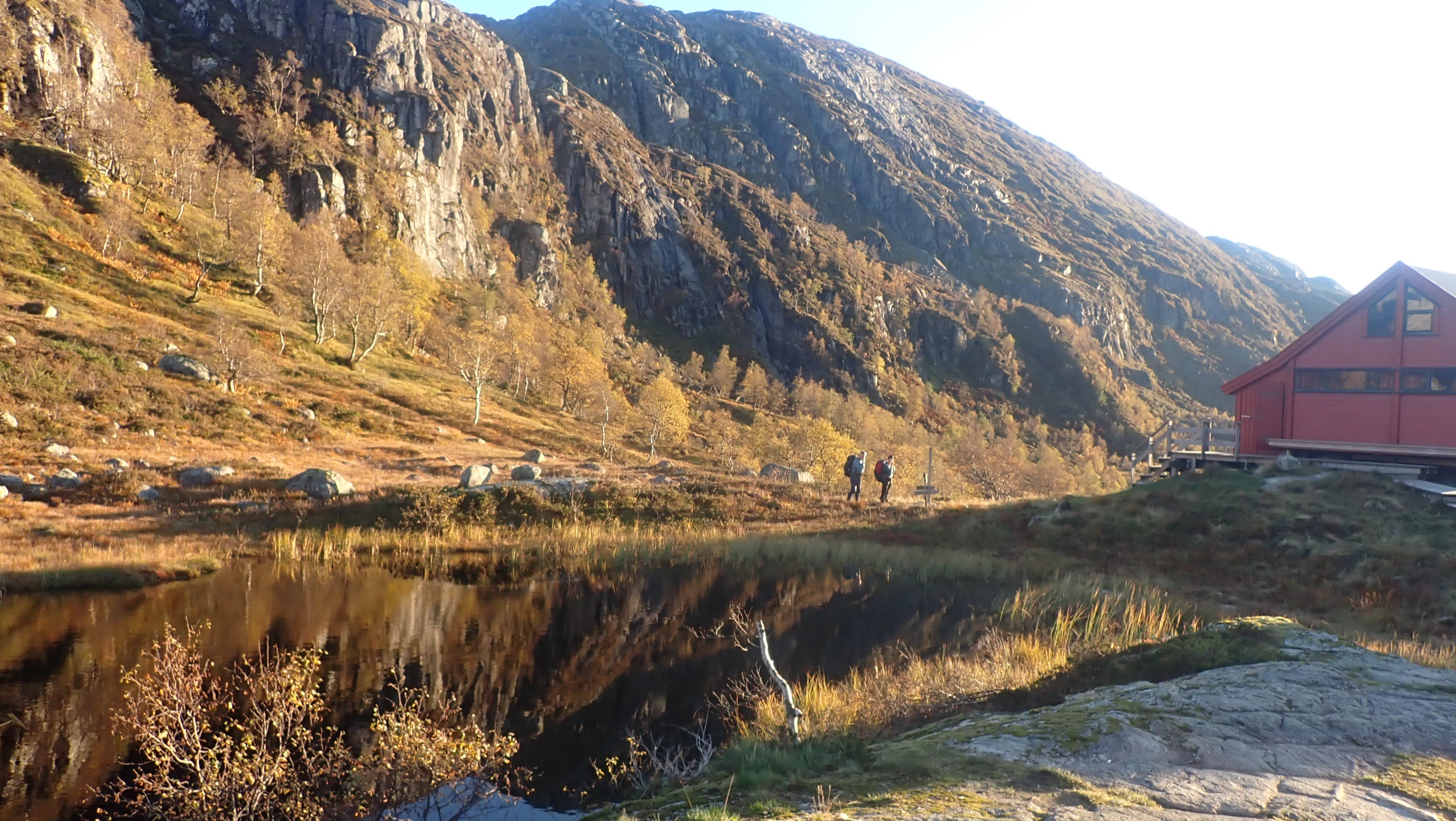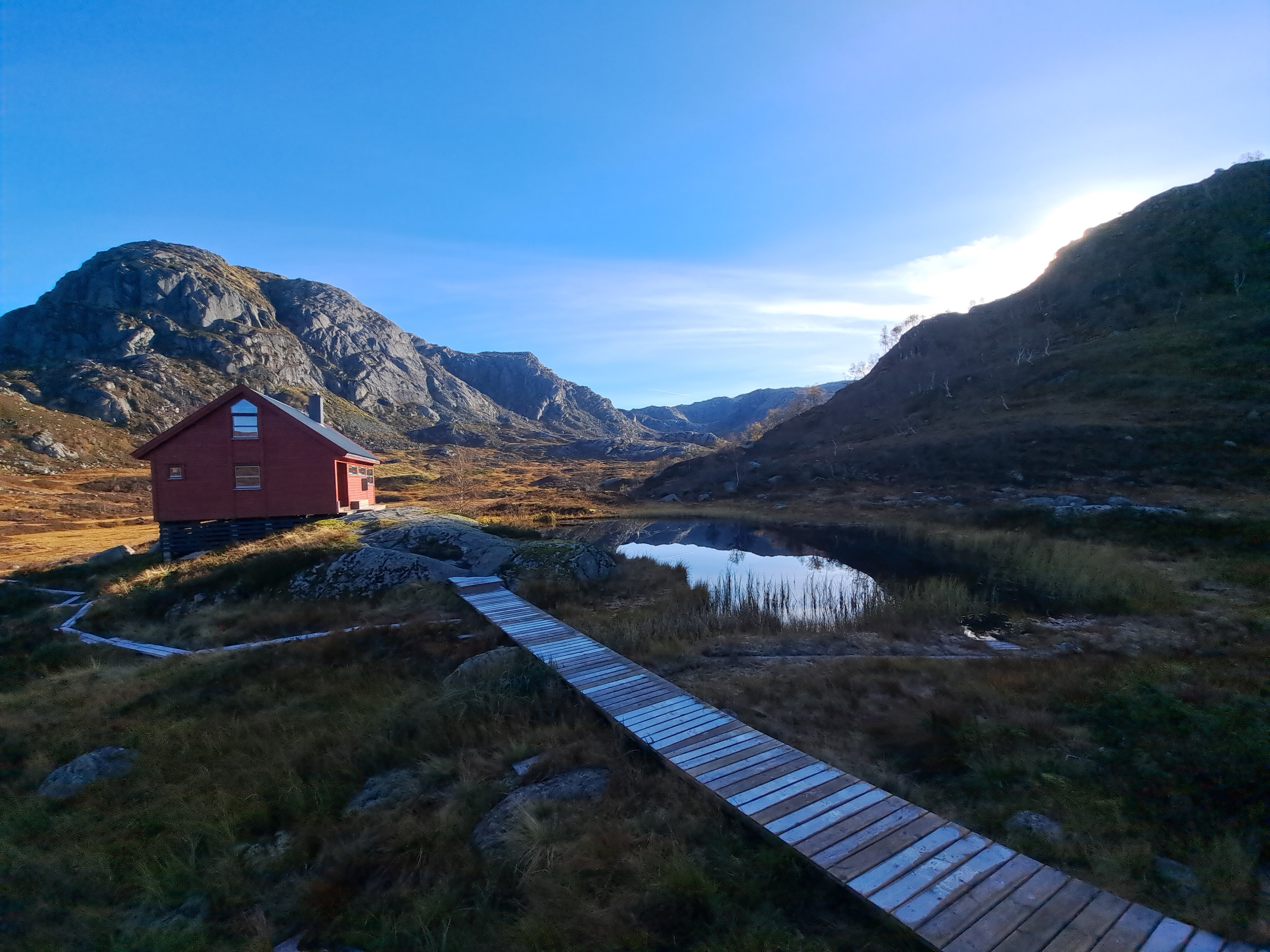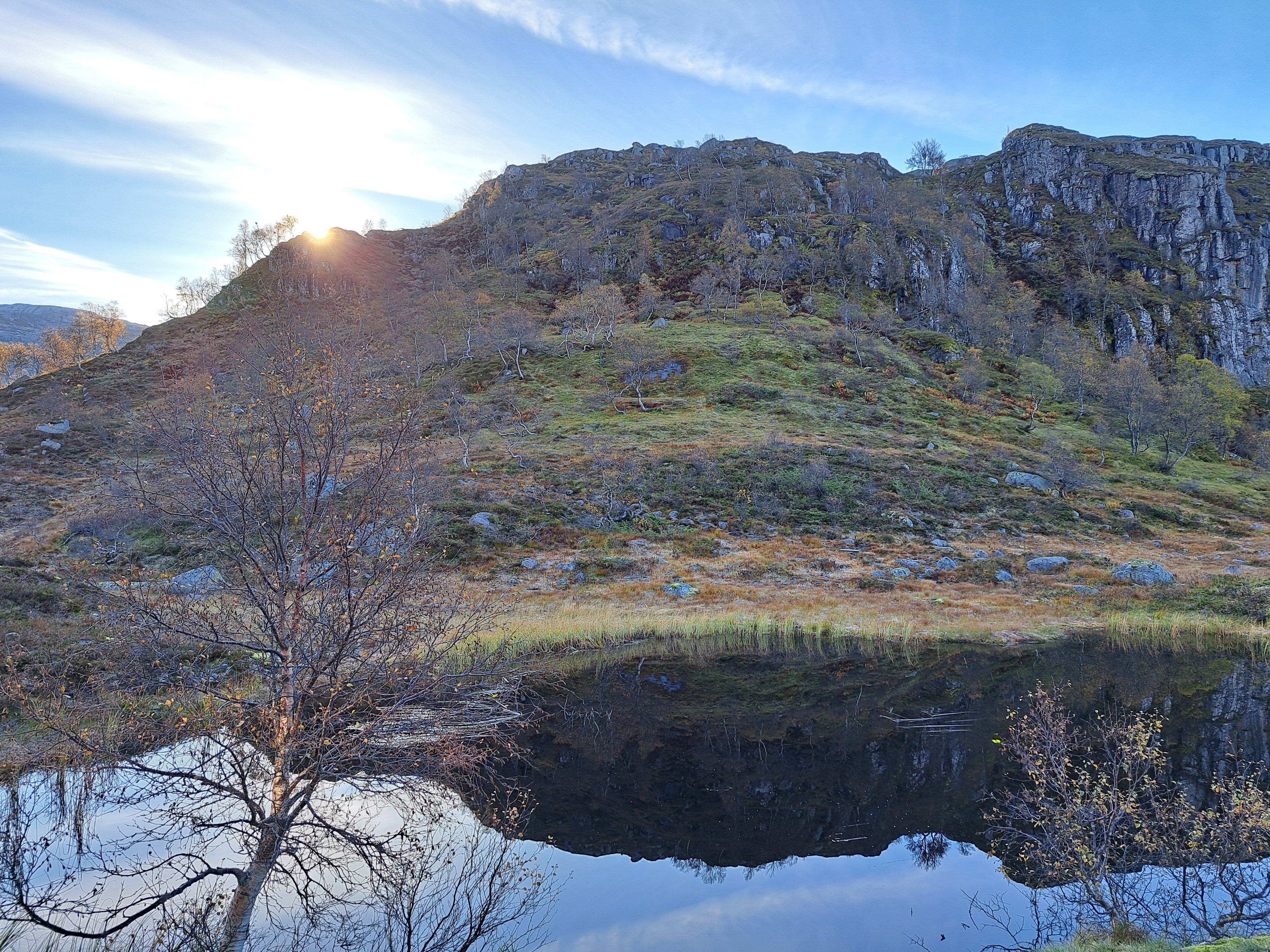 Populært innlegg REJOHN Skrevet 5. oktober 2024 Populært innlegg Skrevet 5. oktober 2024 En høst-tur som vil bli husket. Det er ikke lenge siden jeg gikk i sommerklær og badet i kaldt fjellvann. Denne uka har gradestokken sunket betraktelig, og det var snø og sludd forrige helg. Hjemme var det godt under ti grader da jeg gjorde meg klar for en ny tur til Blåfjellenden. For første gang i år fant jeg fram vintertøy. Varm fleecejakke og lang under... Værmeldingen for de neste dagene var egentlig veldig god. Det var snakk om sol og blå himmel, og nesten ikke vind. Virkelig gode forhold for en fjelltur i oktober. Det ble likevel nevnt mulighet for nattefrost og kalde dager. Det tok ikke lang tid oppover bakkene fra parkeringsplassen før det ble stopp og lettelse i antrekket. Den tunge fleecjakken kom av og i sekken. Der ble den for resten av turen, og både inn og tilbake ble en tur i bare ullblusen. Det var nesten sommertemperatur i sola. Det er mye kjekkere å gå lett kledd, enn med tunge vinterklær. Nå var jeg ikke alene som ville på tur denne dagen. Jeg kunne se spor innover, og etter en stund kunne jeg også se folk foran meg. Jeg holdt litt høyere tempo, og tok igjen et par litt over halvveis mot Blåfjellenden. Det viste seg å være kjentfolk, og det var ikke lenge siden vi hadde vært på hytte sammen. Vi tok følge en stund, og de var ikke langt bak meg ned til hytta. Det var sol på terrassen. Med te for min del og kaffe til de andre fikk vi en koselig stund i sola. I skyggen og i trekken var det kaldt, og det lå også is på gangveiene i skyggen nedover lia. Det var ikke direkte sommer temperatur, men virkelig bra i sola. Det kom flere folk og ut på kvelden kom også Mikkel rev ruslende forbi. Jeg så spor i rimen på gangveien, og trodde det var hund, men ved nærmere ettersyn viste det seg at det var spor av rev. De hadde vært utenfor hytta da vi satt og pratet innenfor. På vei mot annekset i mørket, ble det en stopp for å sjekke stjerner og melkeveien. Det er et ganske flott syn. Det var flott å stå opp til en ny fantastisk morgen på Blåfjellenden. Det var litt for kaldt i trekken til å ta frokosten utenfor, men det gikk greit å sitte inn og se ut. Det var et flott syn. Myra hadde flotte farger og sola kom så vidt over kanten og lyste opp tjernet som lå nesten speilblankt. Jeg hadde det ikke travelt denne morgenen heller. Det var ikke noe jeg skulle nå hjemme, og det kunne passe bra på mange måter at det tinte litt i nordhellingen. Nå var det mindre is enn jeg hadde ventet da jeg kom meg avgårde, men det passet greit å vente likevel. Det dukket opp noe som absolutt måtte gjøres. Noen (en skoleklasse fra en ungdomsskole) hadde satt igjen tallerkener som ikke var helt rene – og fuktige. Slikt måtte rengjøres – og tørkes. Det var sol og flott vær da jeg tok mot Hunnedalen. Sola sto ikke spesielt høyt på himmelen, og den kalde trekken kom bakfra. Jeg var glad for skyggelua, men sekken på ryggen holdt meg varm nok. Det ble en flott tur i godt vær tilbake. En høst-tur som nok vil bli husket. Nesten nede ved Fossebekken gikk jeg på kjente. Det var folk fra Fidjastølen som hadde vært på ettersanking og funnet en sau og to lam. De hadde brukt to lange dager på å få dyra først til stølen og nå var de på vei til tilhengeren. Sauen hadde vandret et godt stykke ut av sitt område, og kommer nok ikke på heia flere ganger. Det hadde – igjen – vært en virkelig flott to-dagers tur. Været var det aller beste så sent på året, og etterhvert er det helst overskyet og lett regn som gjelder. Blå himmel gir fort kalde forhold. 10